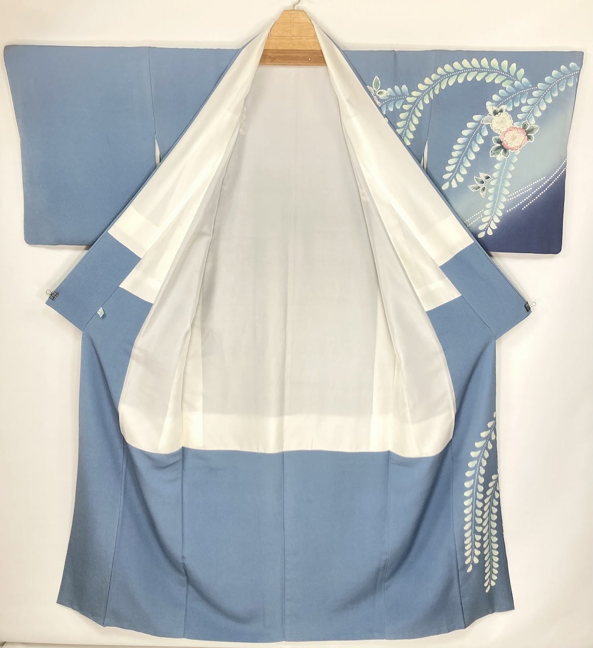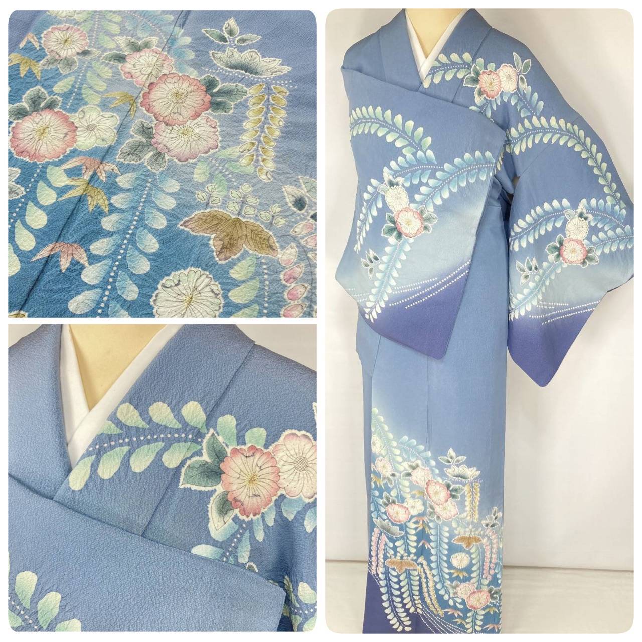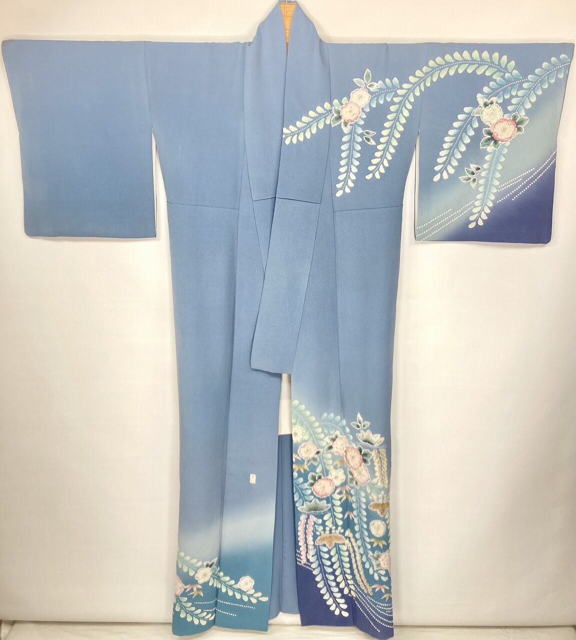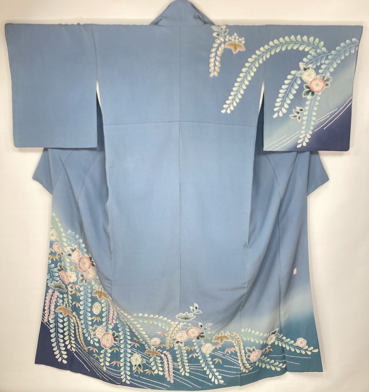 やわらかな「ぼかし染め」で青緑から濃いブルーへの美しいグラーデーションによりメリハリ生まれ、多彩な「友禅」「ぼかし染め」「墨絵書き」「手絞り」を駆使し、色とりどりに彩られた[辻ヶ花]が端麗に枝垂れた、うっとりするほど美しい作品です。