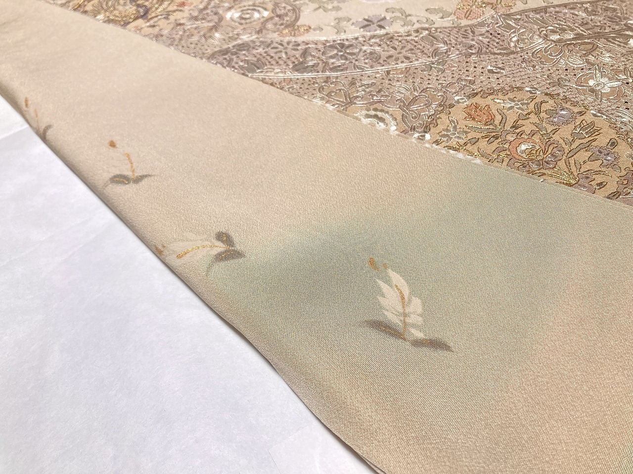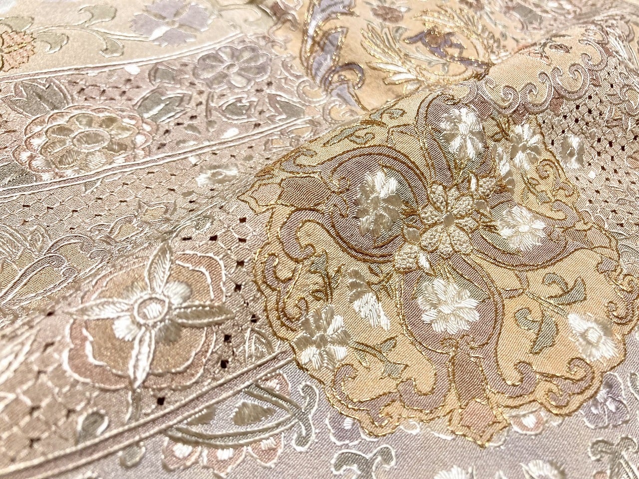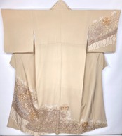 「汕頭刺繍」「蘇州刺繍」「相良刺繍」「手刺繍」を駆使し、オリエンタルな[唐花][華紋][ダマスク]や神聖な[鳳凰]などを優雅な[霞取り]で配し、気品高く輝く「金糸」が華やぎを添え、丹念な「小帽子絞り」「鹿の子絞り」をあしらった、卓越した職人の手仕事による『中国三大刺繍』をびっしりと施した見事な絵羽柄、手間隙かけて制作された大変素晴らしい作品です。
