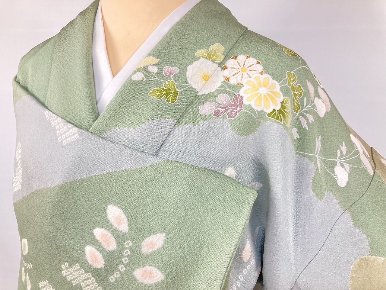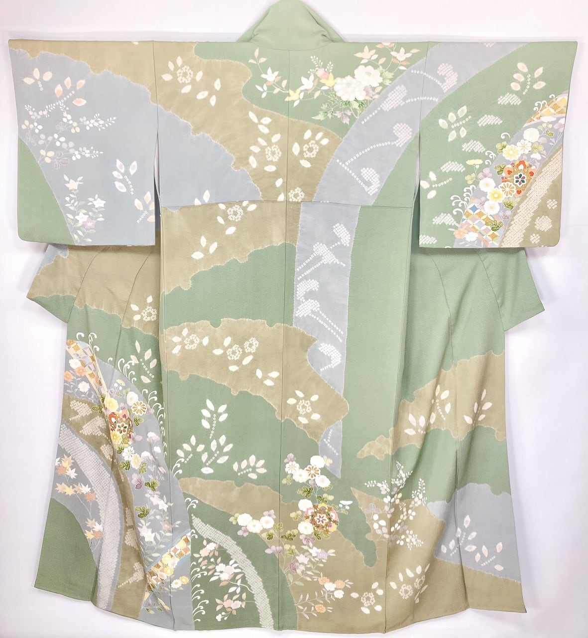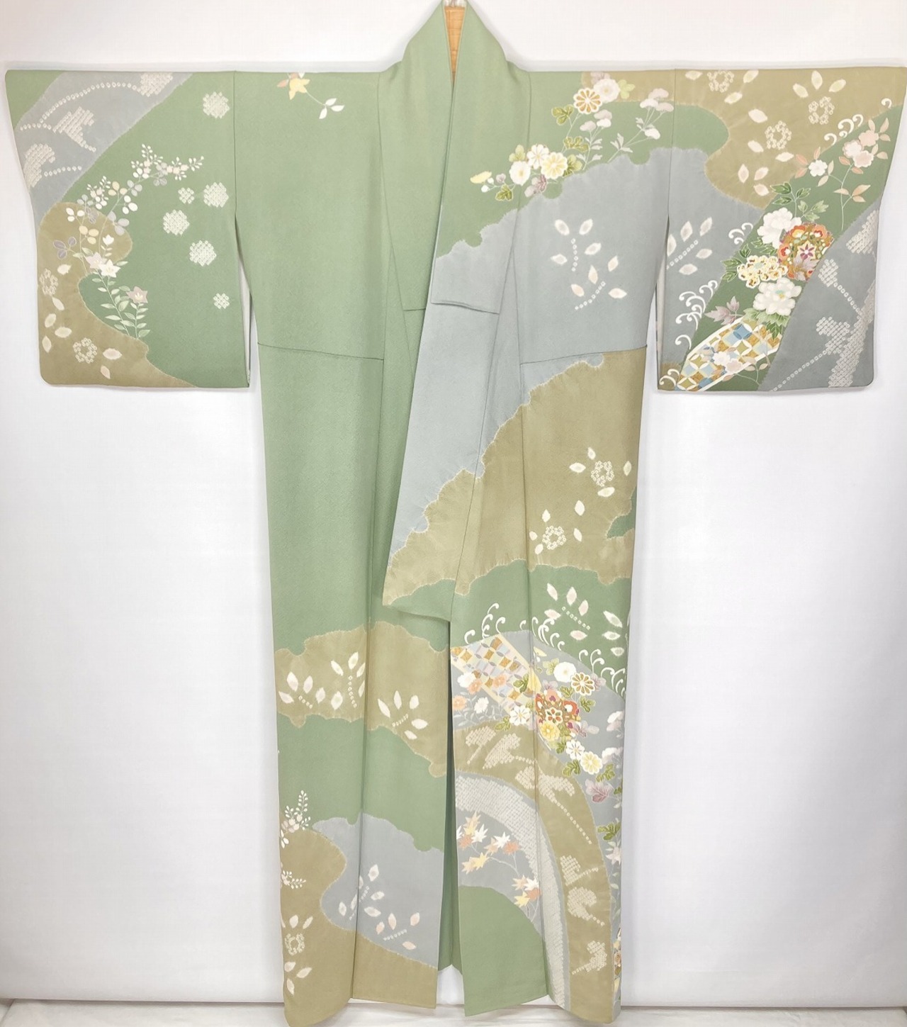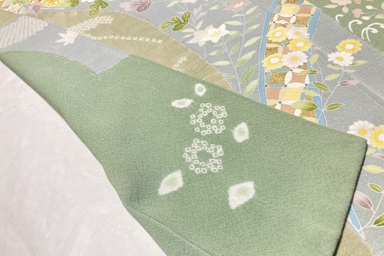 丹念な「絞り染め」で黄緑・淡い水色・グレージュの大柄な[雪輪取り]の大胆な「染め分け」を配し、多彩な「手描き友禅」「鹿の子絞り」「小帽子絞り」「金彩」を駆使し、菊・桔梗・桜・牡丹・橘などの[四季の花々]や優雅な[華紋]や[七宝]を散りばめ、上前には「金駒刺繍」や「刺繍」をさりげなくあしらった、手間隙かけて制作された素晴らしい絵羽柄で、大変加工の良い作品です。