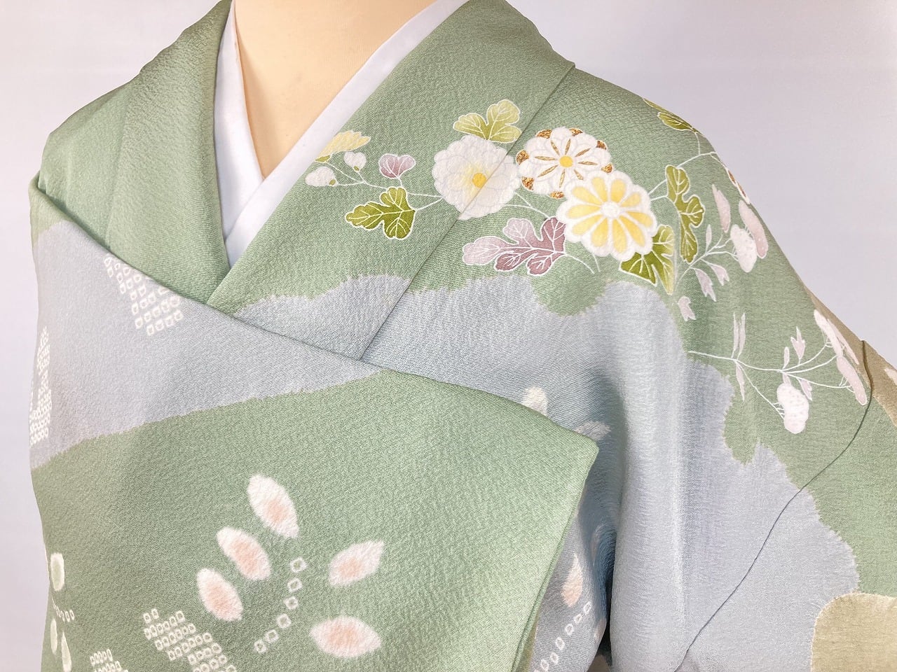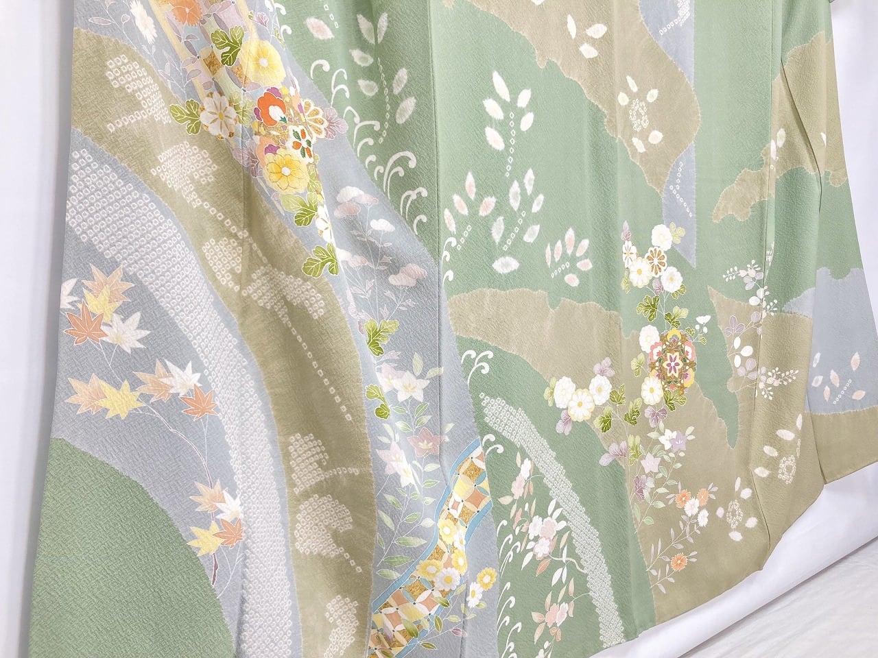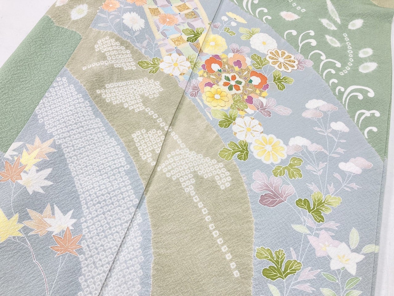 丹念な「絞り染め」で黄緑・淡い水色・グレージュの大柄な[雪輪取り]の大胆な「染め分け」を配し、多彩な「手描き友禅」「鹿の子絞り」「小帽子絞り」「金彩」を駆使し、菊・桔梗・桜・牡丹・橘などの[四季の花々]や優雅な[華紋]や[七宝]を散りばめ、上前には「金駒刺繍」や「刺繍」をさりげなくあしらった、手間隙かけて制作された素晴らしい絵羽柄で、大変加工の良い作品です。