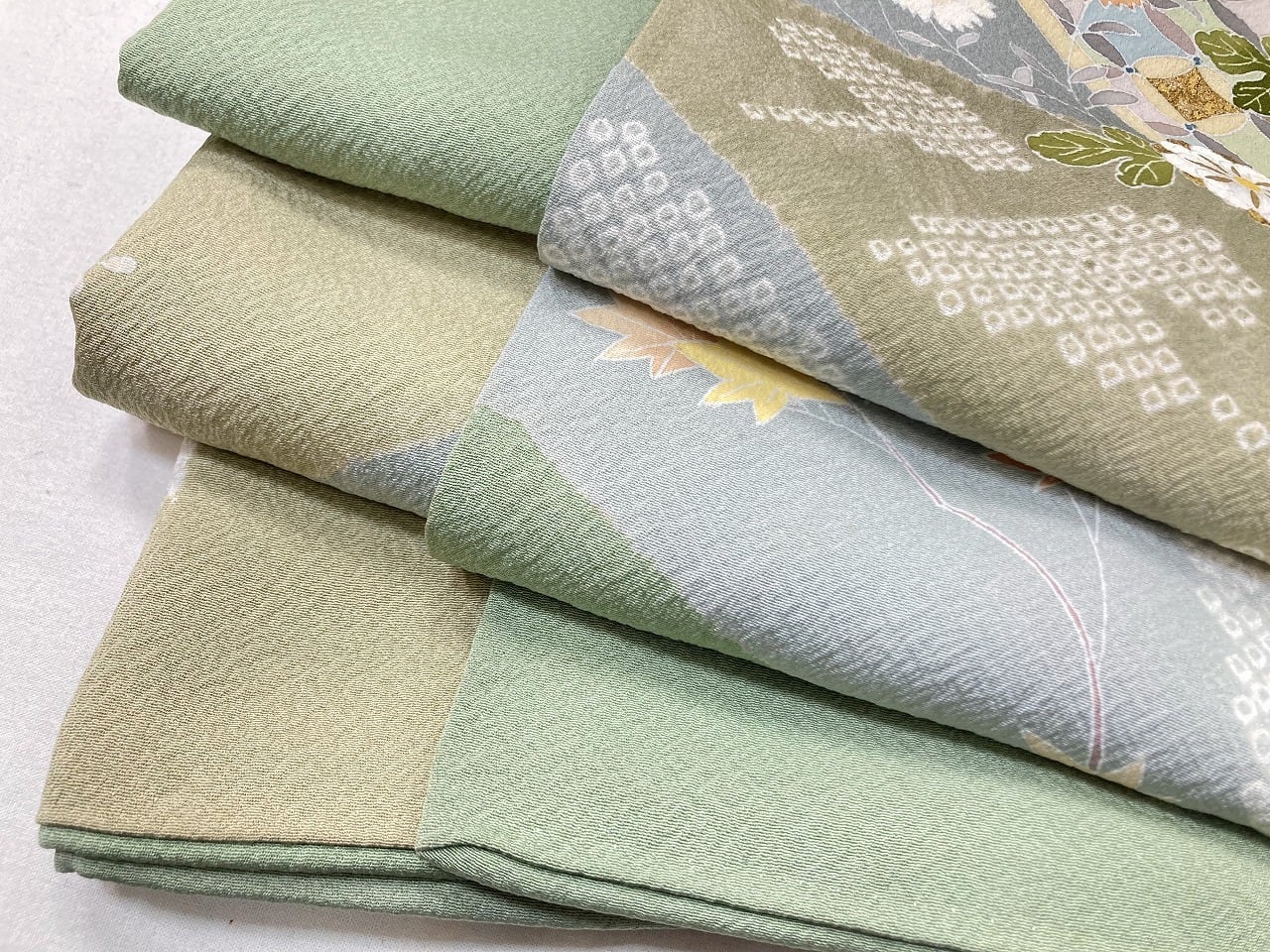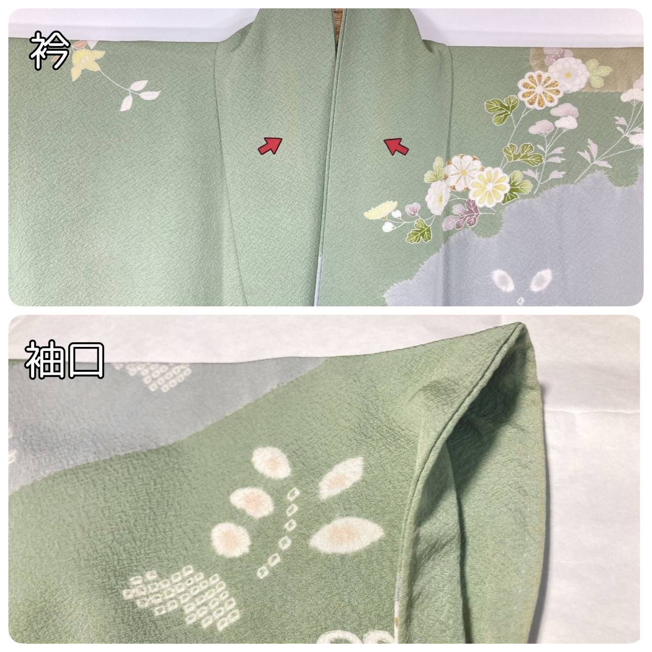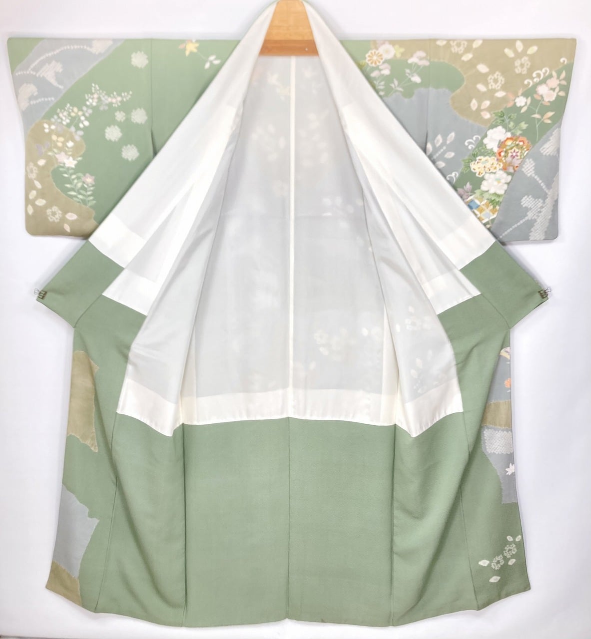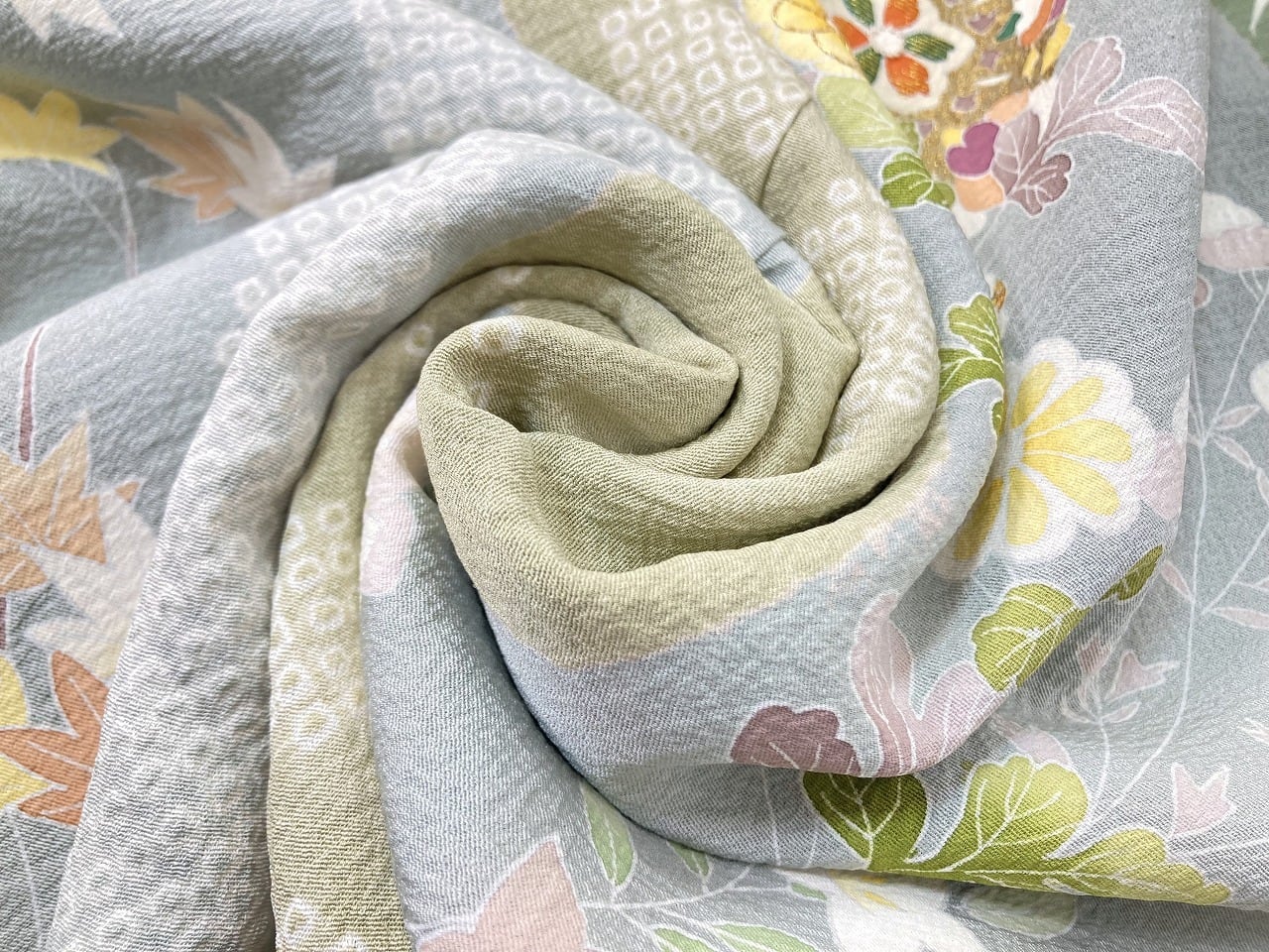 丹念な「絞り染め」で黄緑・淡い水色・グレージュの大柄な[雪輪取り]の大胆な「染め分け」を配し、多彩な「手描き友禅」「鹿の子絞り」「小帽子絞り」「金彩」を駆使し、菊・桔梗・桜・牡丹・橘などの[四季の花々]や優雅な[華紋]や[七宝]を散りばめ、上前には「金駒刺繍」や「刺繍」をさりげなくあしらった、手間隙かけて制作された素晴らしい絵羽柄で、大変加工の良い作品です。