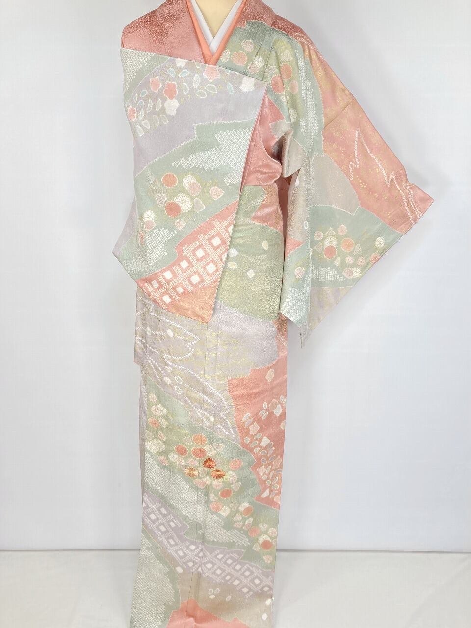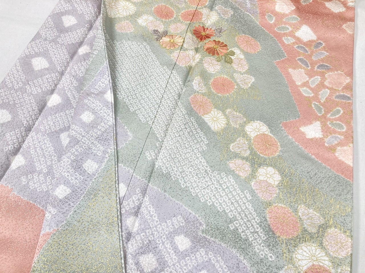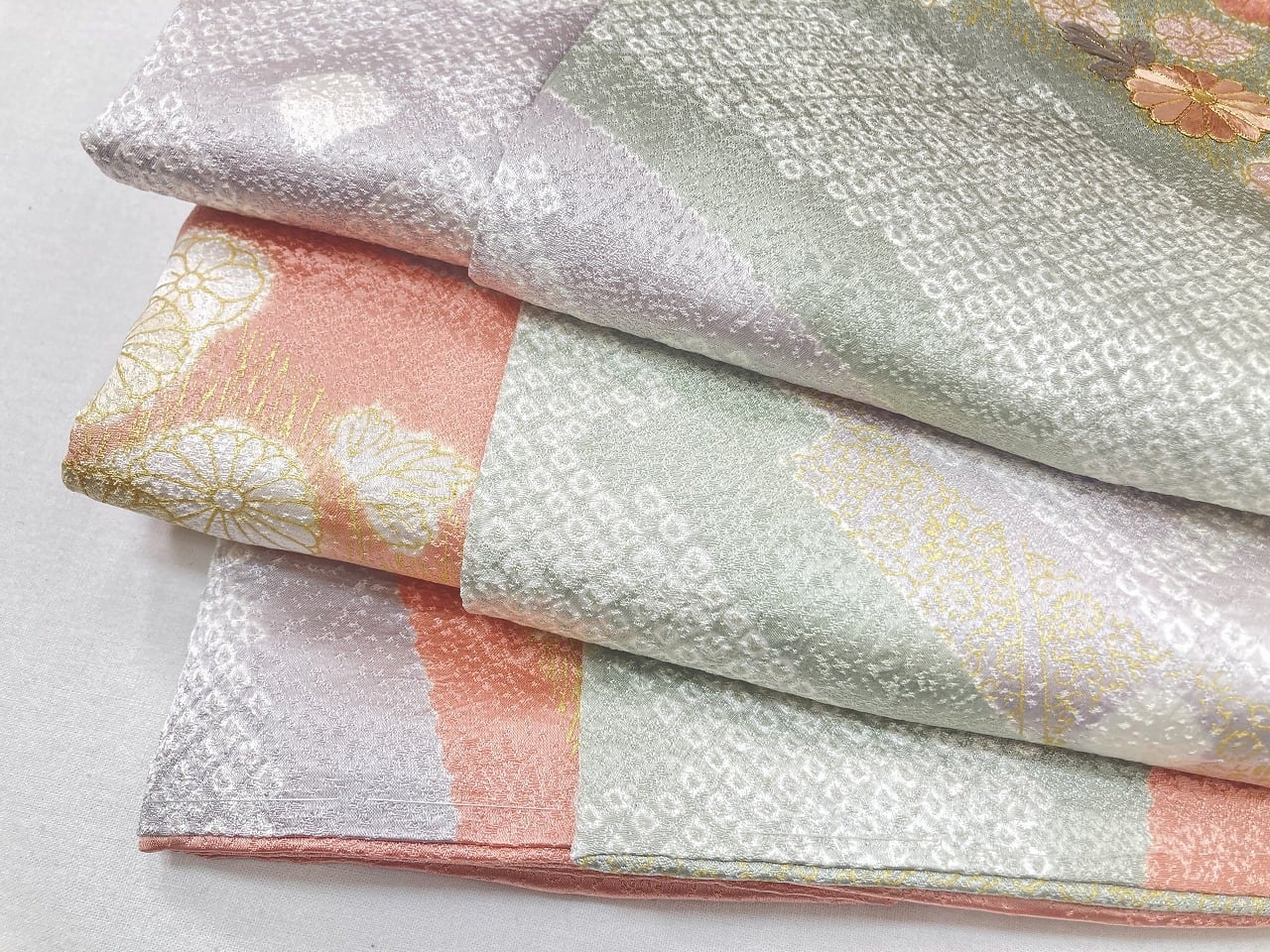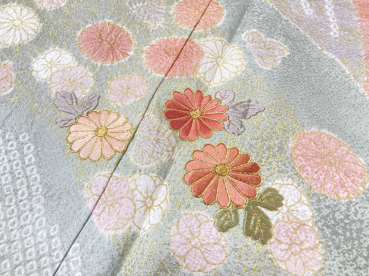 丹念な「絞り染め」で黄緑・青紫・ピンク・グレージュの淡い色合いの大胆な「染め分け」を配し、多彩な「型友禅」「鹿の子絞り」「小帽子絞り」「金彩」を駆使し、縁起の良い[吉祥文]の梅や菊、格調高い[七宝][菱文]を散りばめ、上前には「蘇州刺繡」と「金駒刺繍」を豪華にあしらった、手間隙かけて制作された素晴らしい絵羽柄で、大変加工の良い作品です。