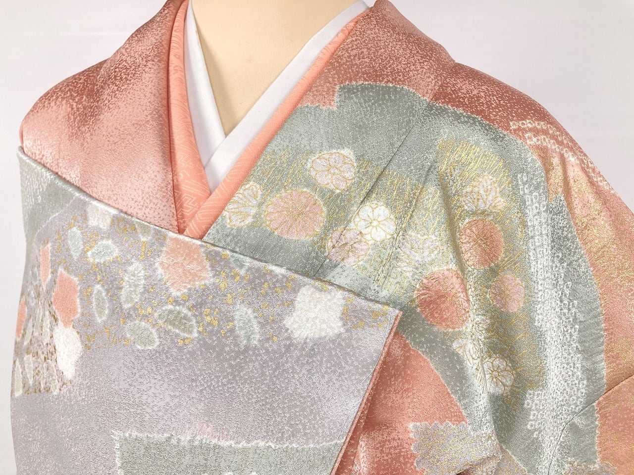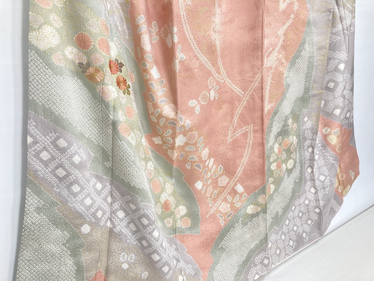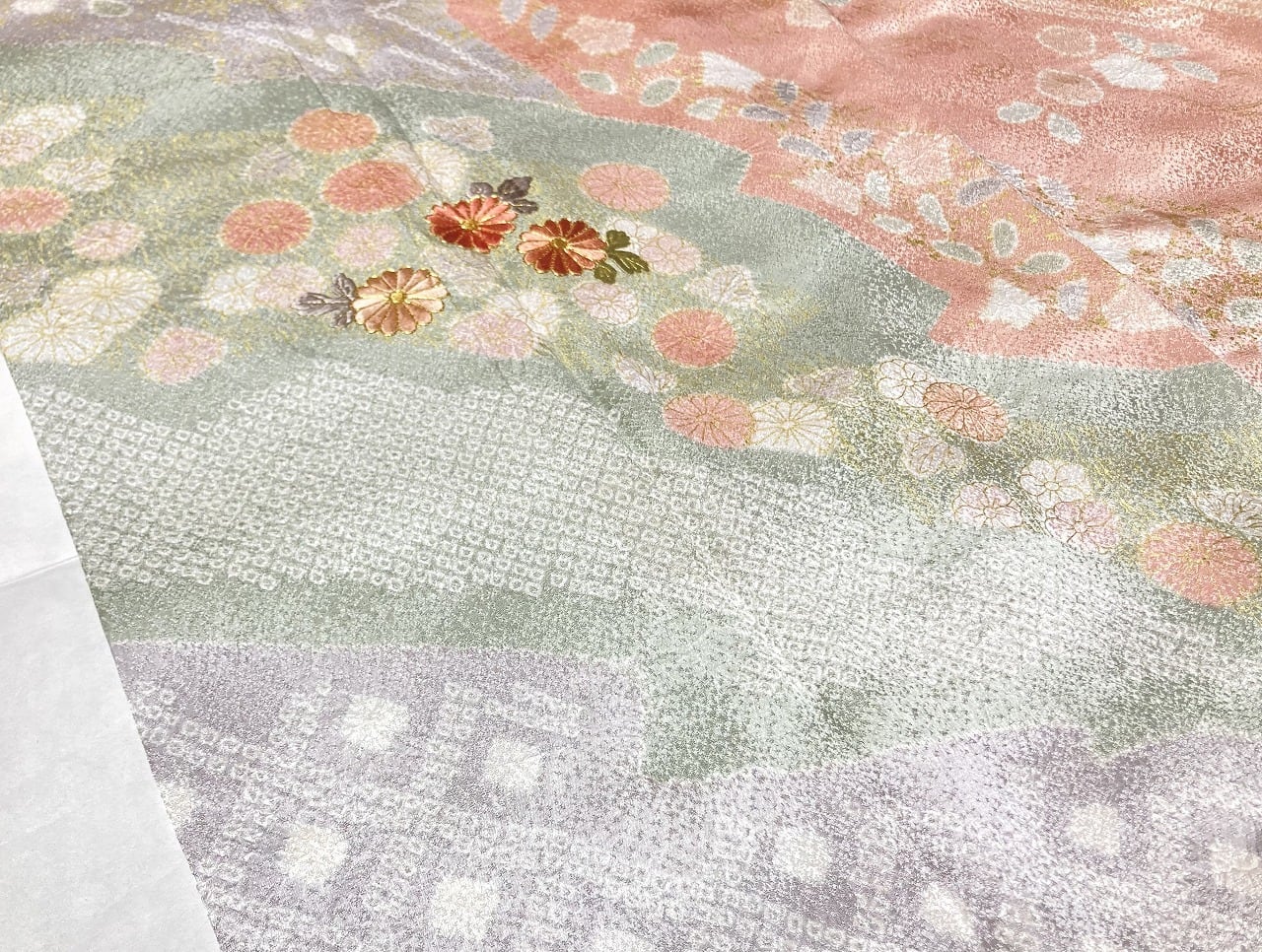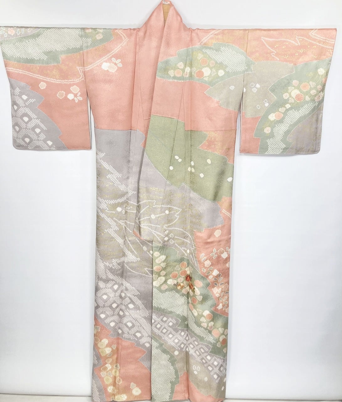 丹念な「絞り染め」で黄緑・青紫・ピンク・グレージュの淡い色合いの大胆な「染め分け」を配し、多彩な「型友禅」「鹿の子絞り」「小帽子絞り」「金彩」を駆使し、縁起の良い[吉祥文]の梅や菊、格調高い[七宝][菱文]を散りばめ、上前には「蘇州刺繡」と「金駒刺繍」を豪華にあしらった、手間隙かけて制作された素晴らしい絵羽柄で、大変加工の良い作品です。