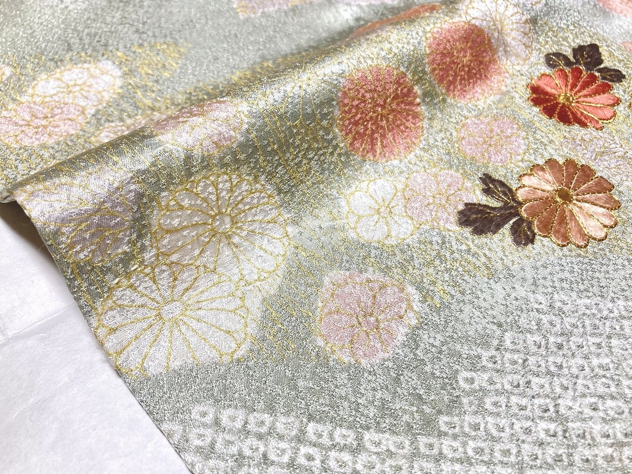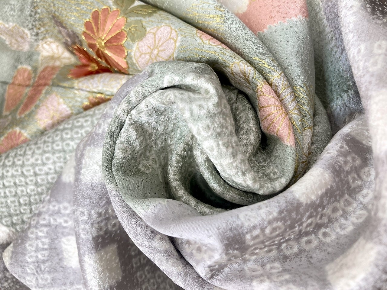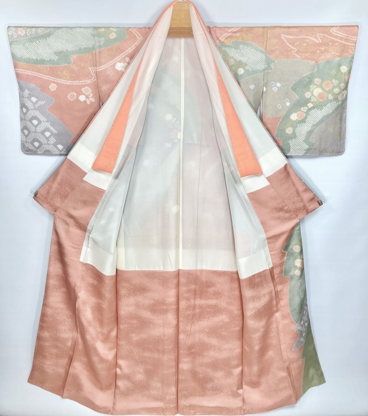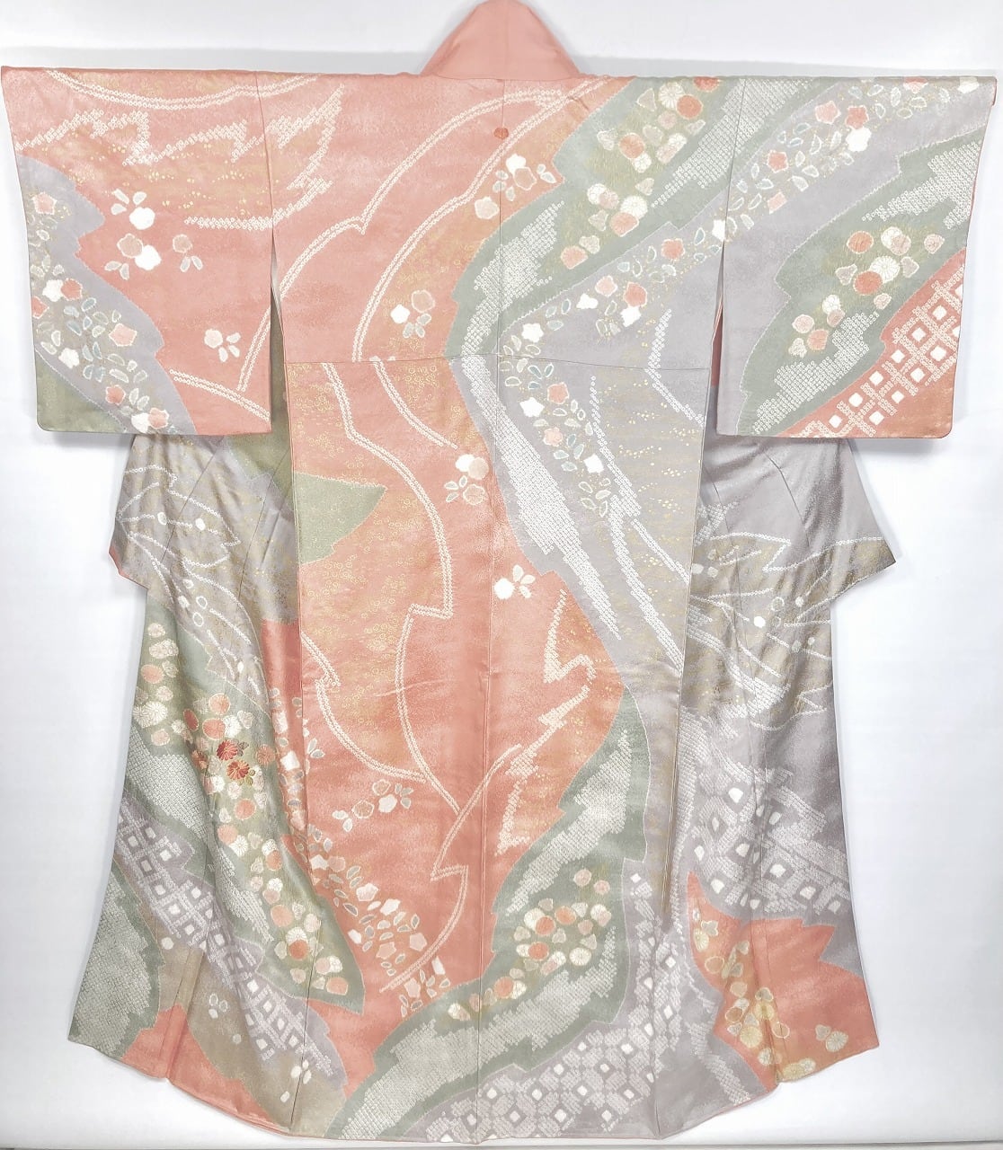 丹念な「絞り染め」で黄緑・青紫・ピンク・グレージュの淡い色合いの大胆な「染め分け」を配し、多彩な「型友禅」「鹿の子絞り」「小帽子絞り」「金彩」を駆使し、縁起の良い[吉祥文]の梅や菊、格調高い[七宝][菱文]を散りばめ、上前には「蘇州刺繡」と「金駒刺繍」を豪華にあしらった、手間隙かけて制作された素晴らしい絵羽柄で、大変加工の良い作品です。