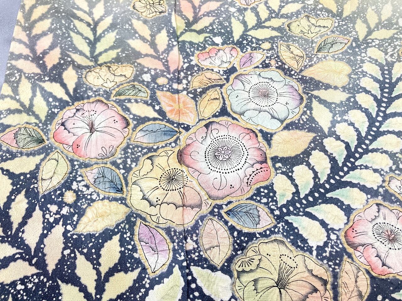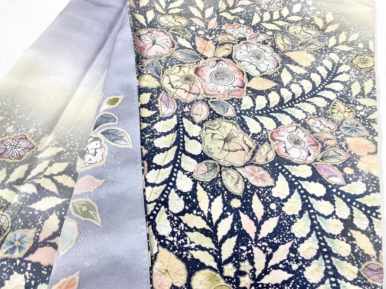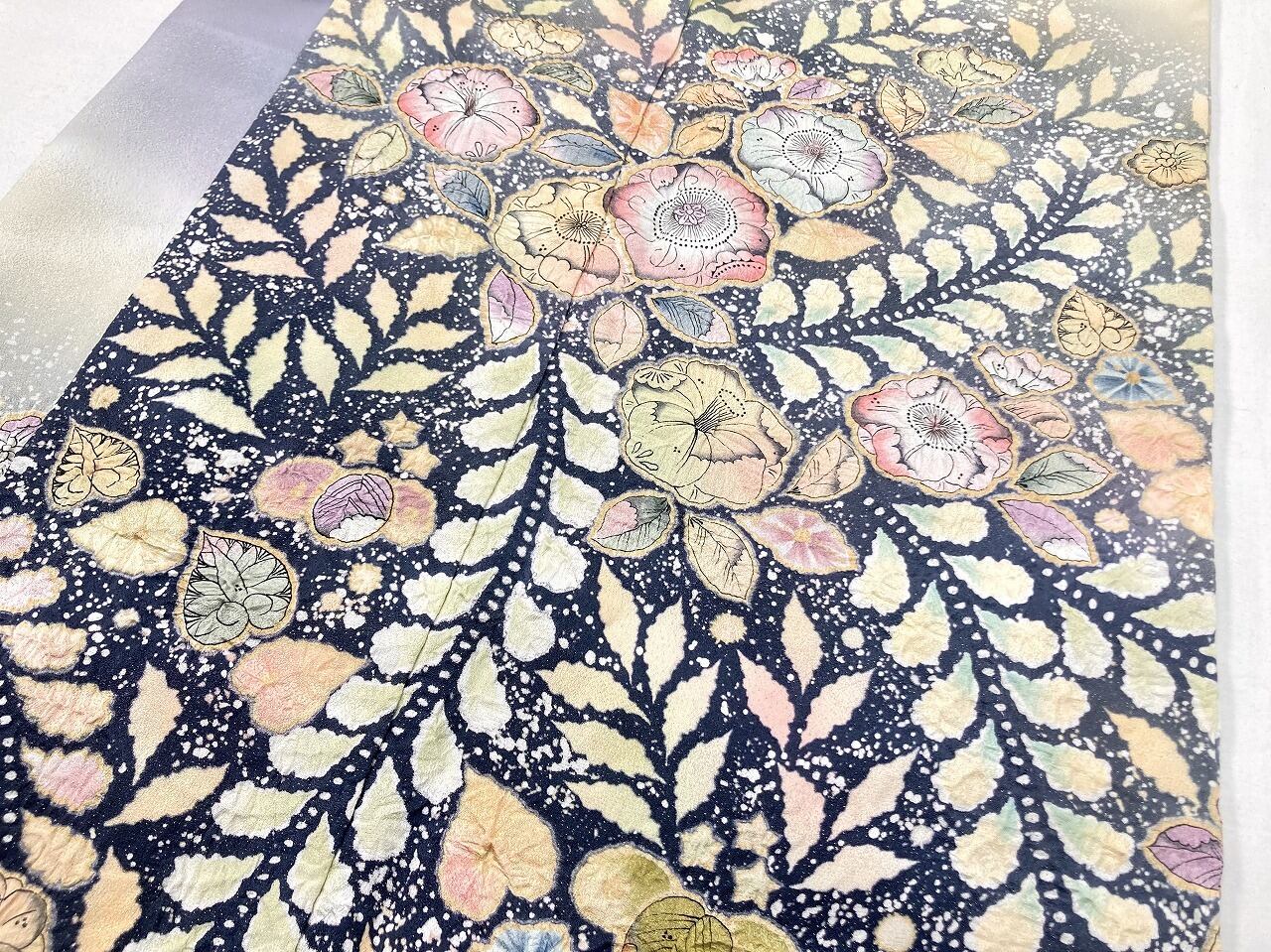 やわらかな「ぼかし染め」の深い紺色へのグラデーションによりメリハリが生まれ、多彩な「友禅」「絞り染め」「ぼかし染め」「墨絵書き」「蠟叩き染め」ふんだんな「手絞り」を駆使し、優しい色合いに彩られた幻想的な[辻ヶ花]が咲き誇る、上部からは華麗に枝垂れた、息を吞むほど美しい大変見事な作品です。