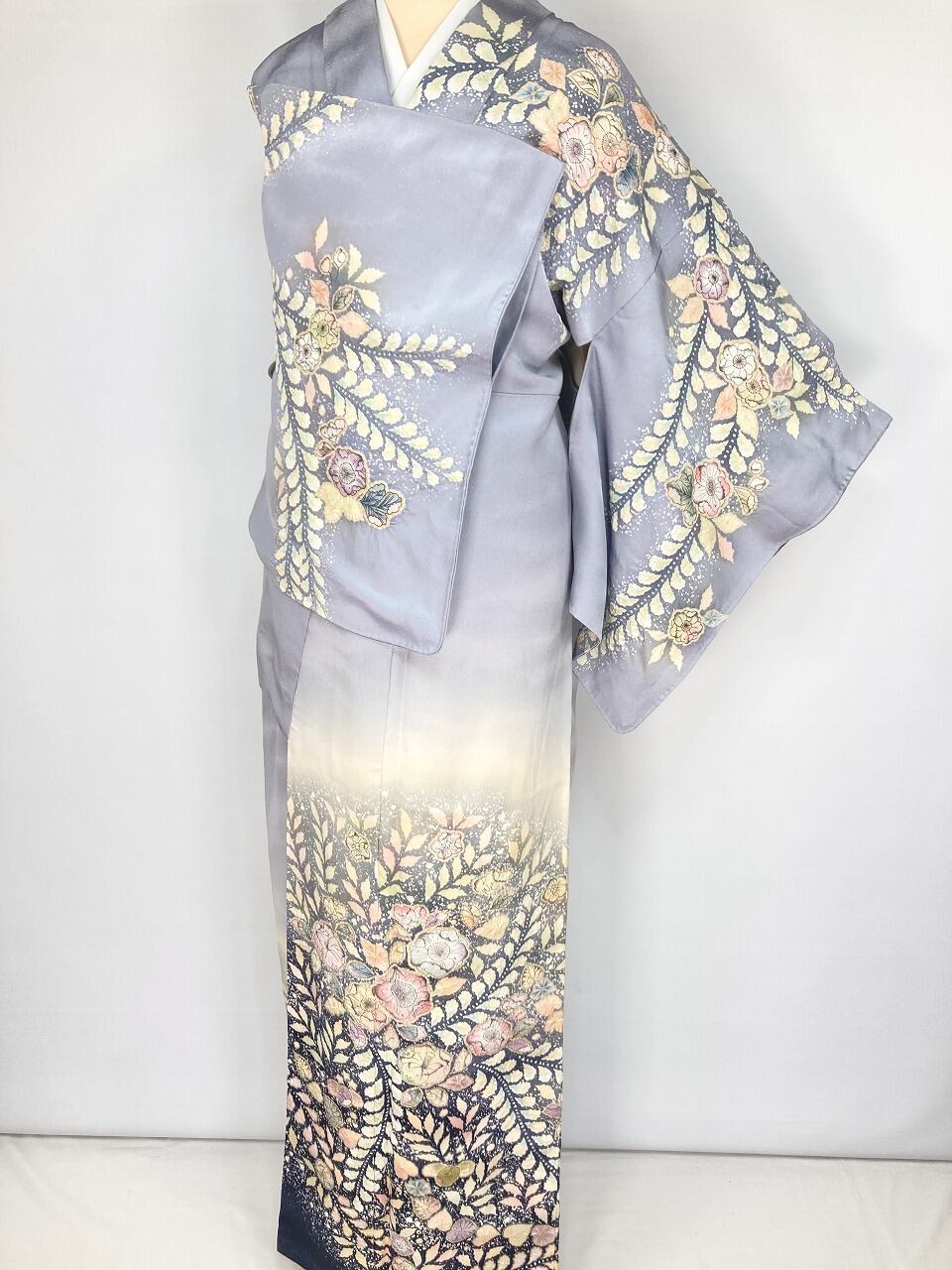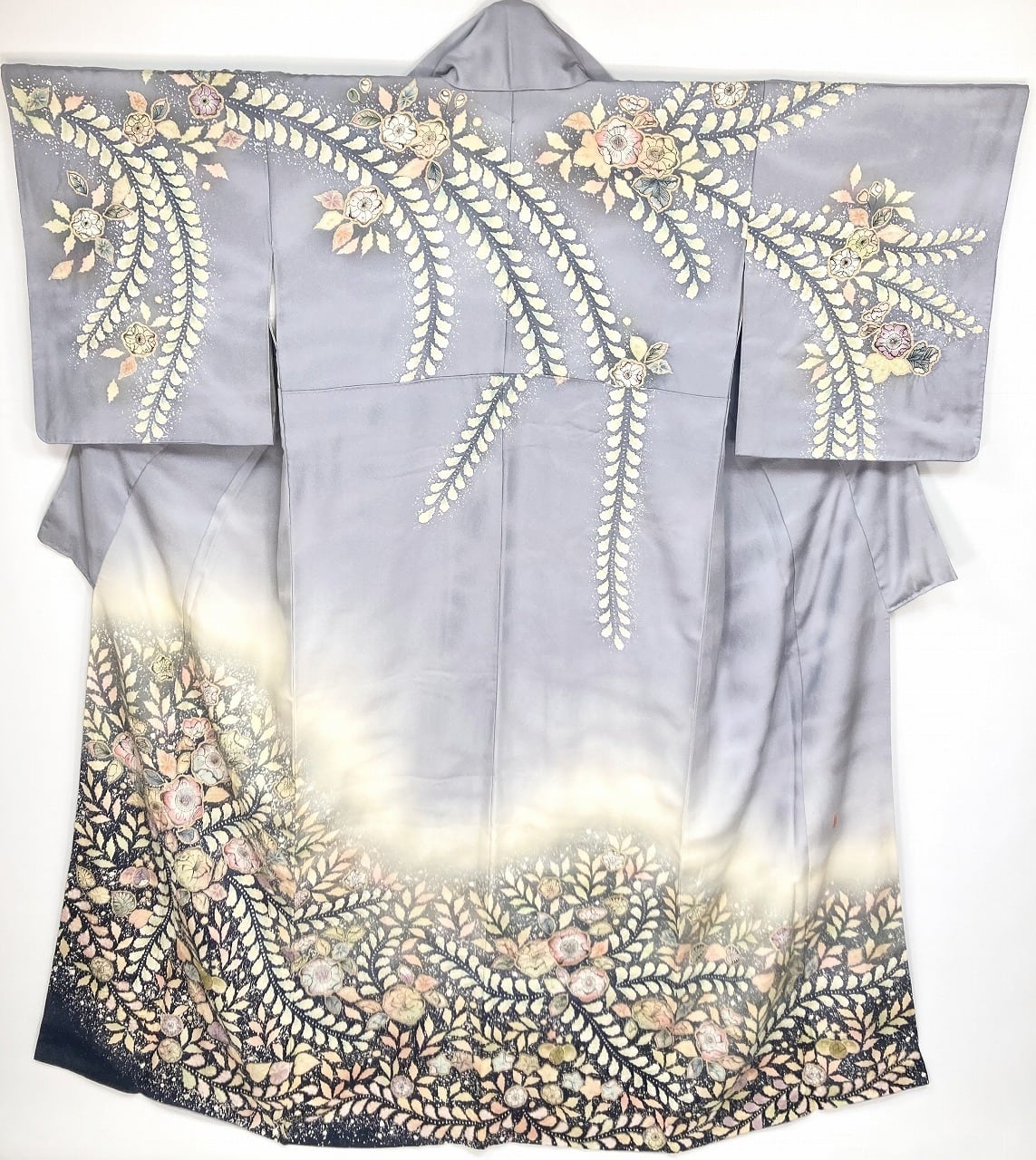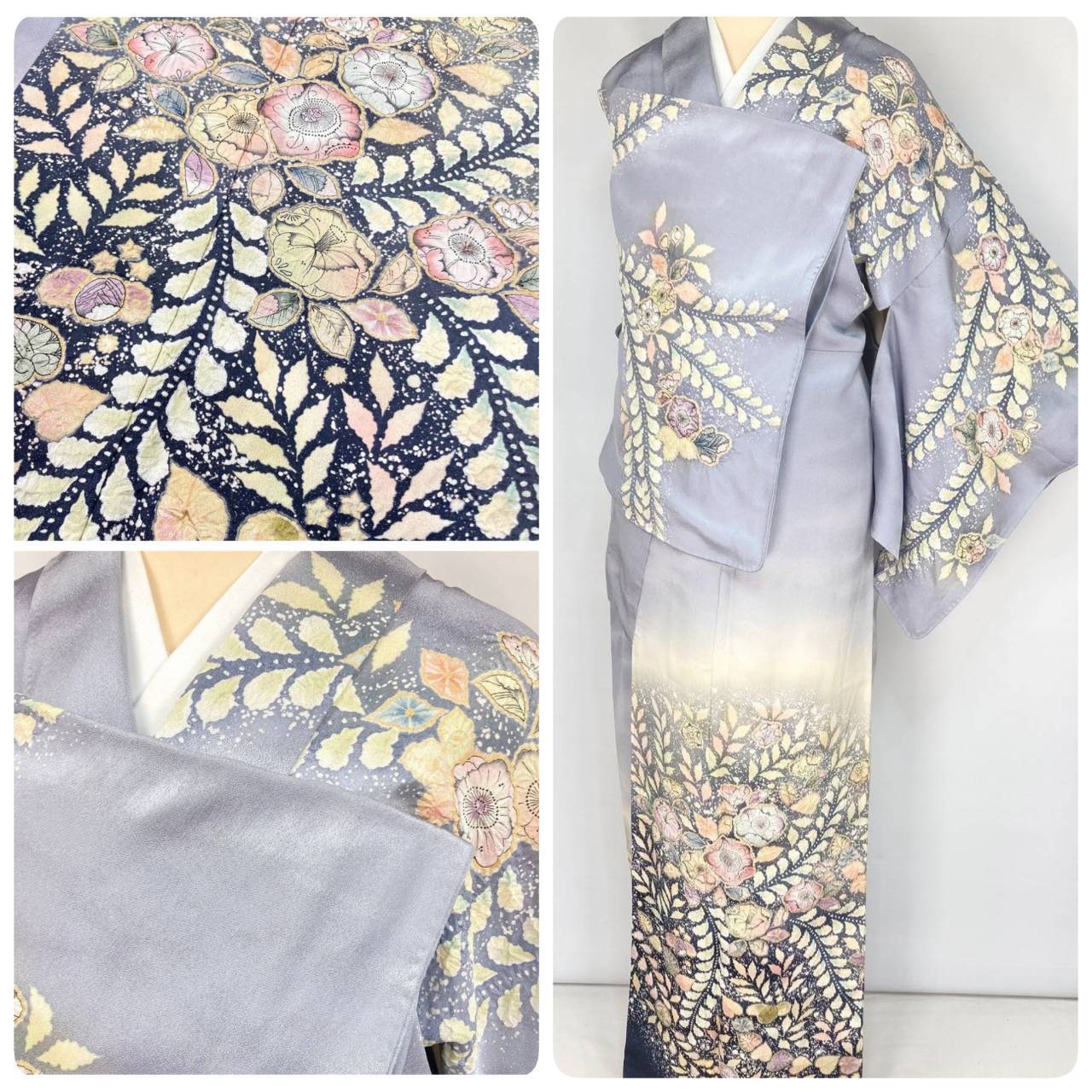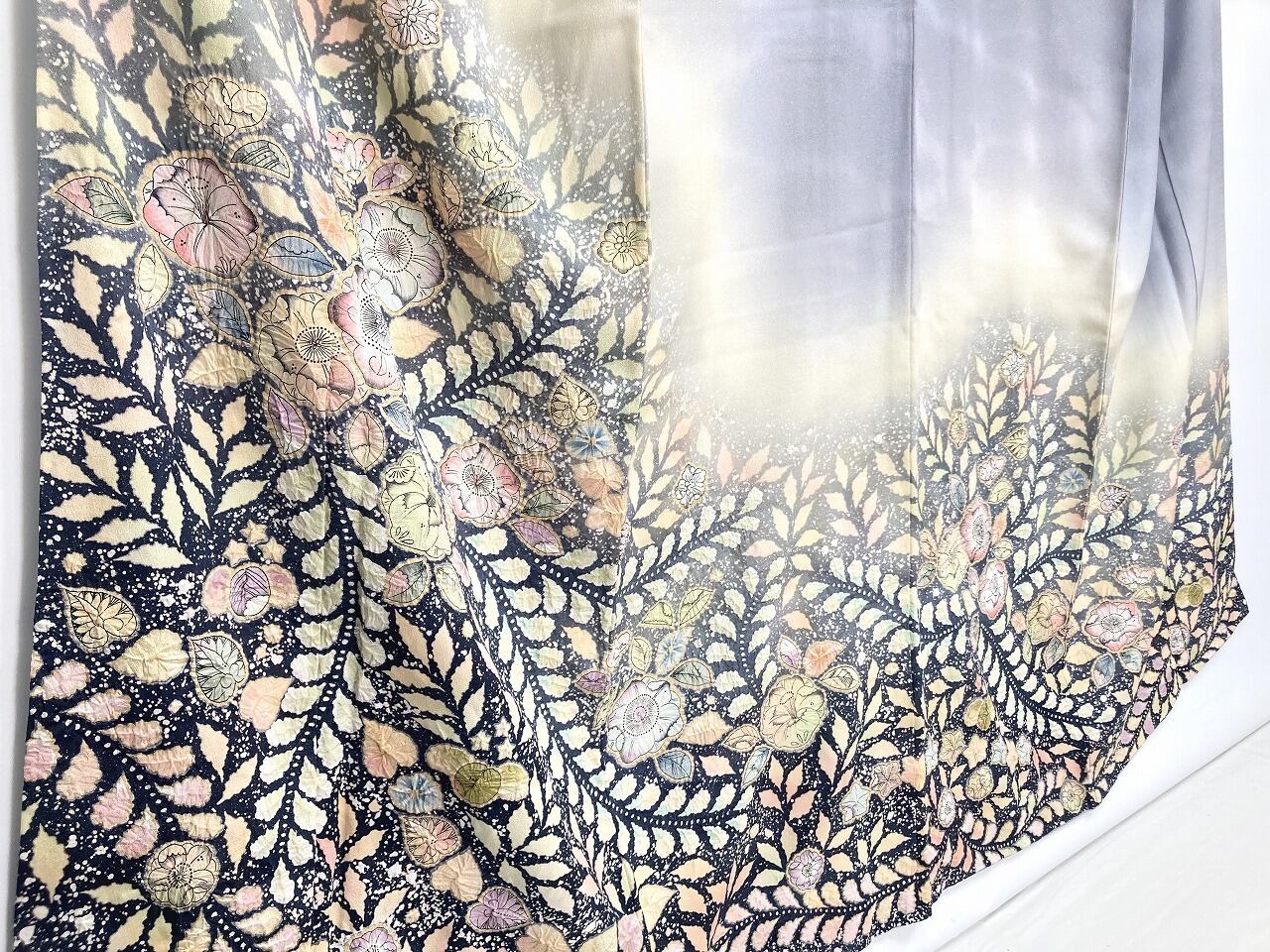 やわらかな「ぼかし染め」の深い紺色へのグラデーションによりメリハリが生まれ、多彩な「友禅」「絞り染め」「ぼかし染め」「墨絵書き」「蠟叩き染め」ふんだんな「手絞り」を駆使し、優しい色合いに彩られた幻想的な[辻ヶ花]が咲き誇る、上部からは華麗に枝垂れた、息を吞むほど美しい大変見事な作品です。