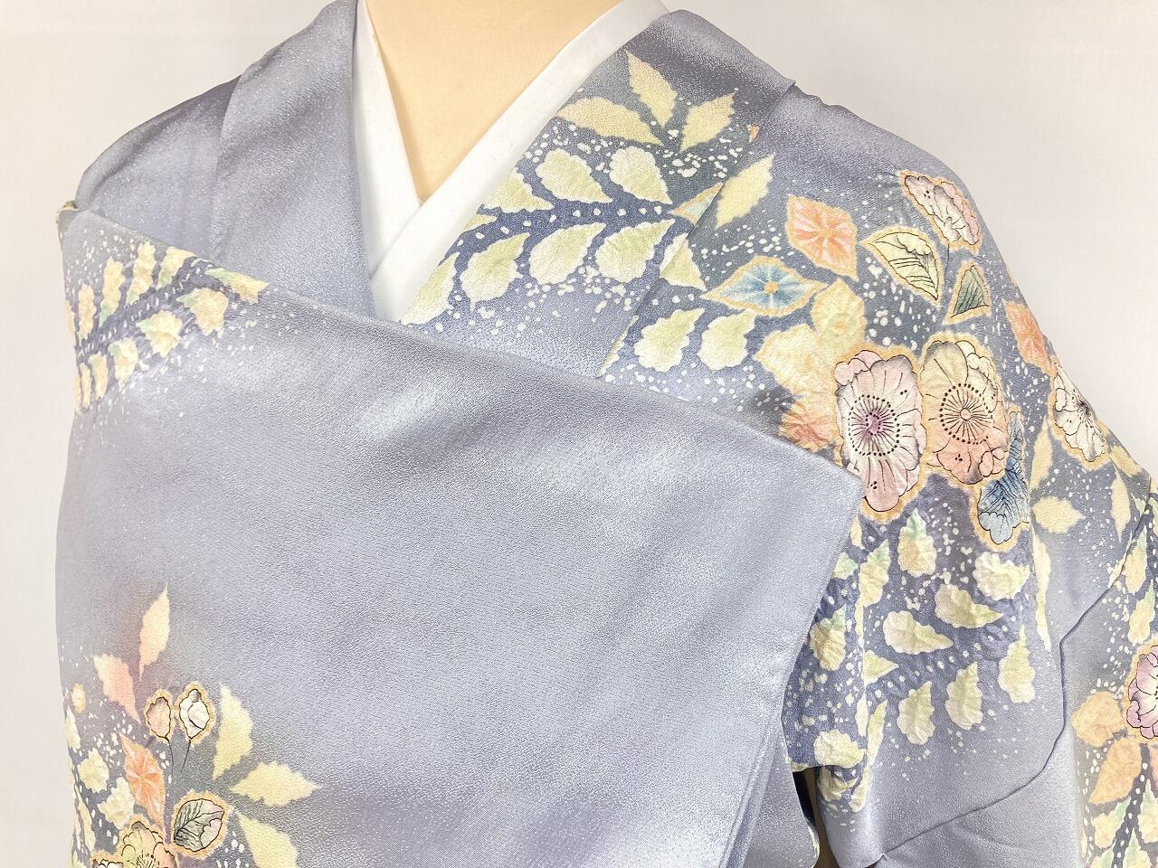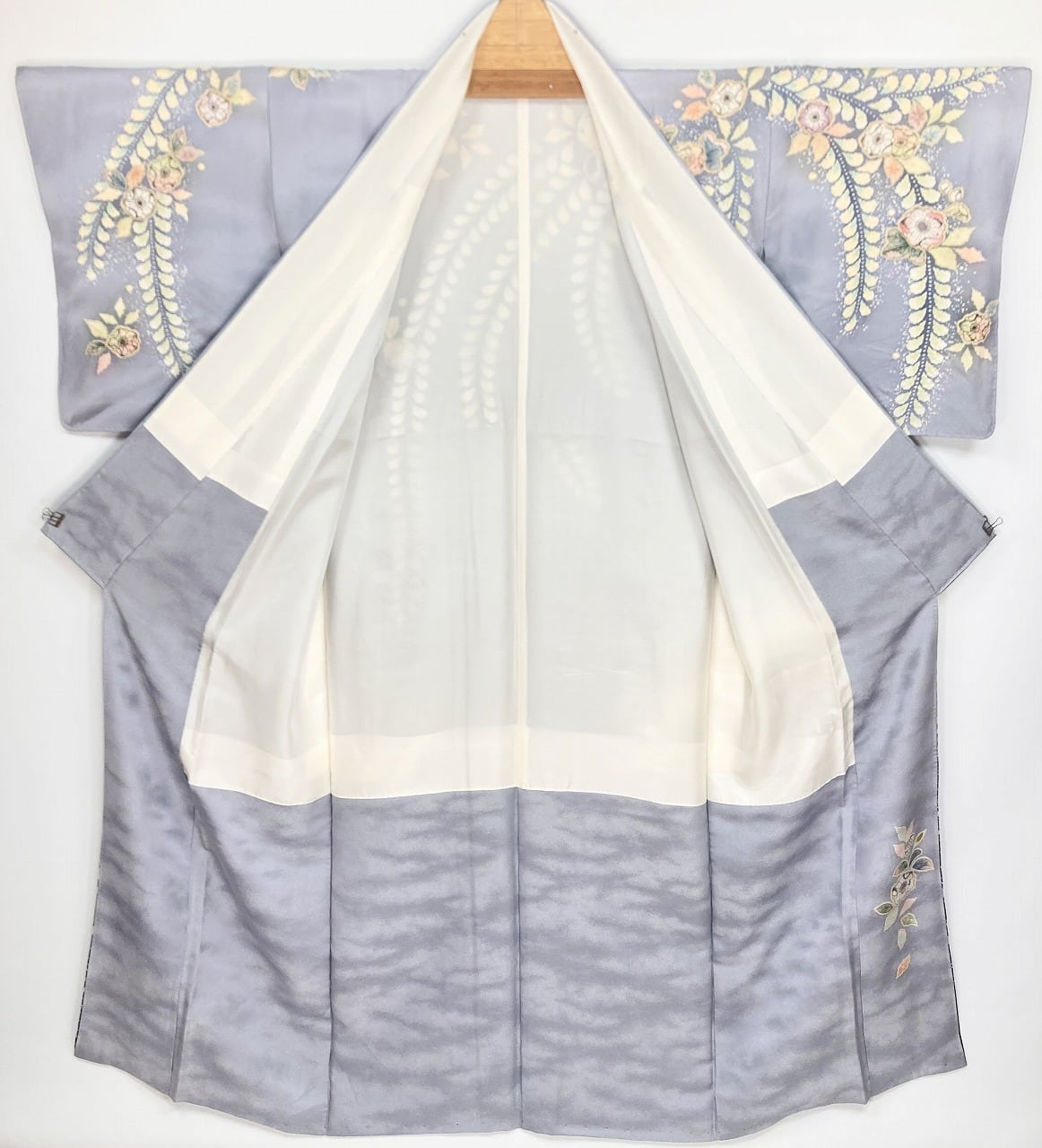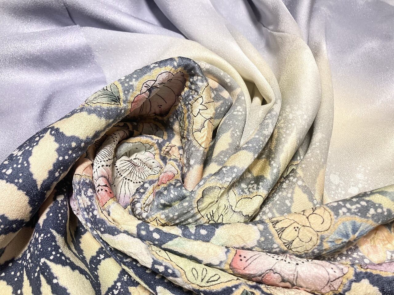 ◎八掛は、表地と同じ「銀通し」の生地を使った「共八掛」で、繊細な友禅で[辻ヶ花]をあしらった、お洒落で高級な仕上げになっております。