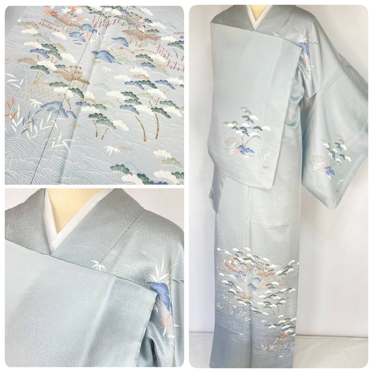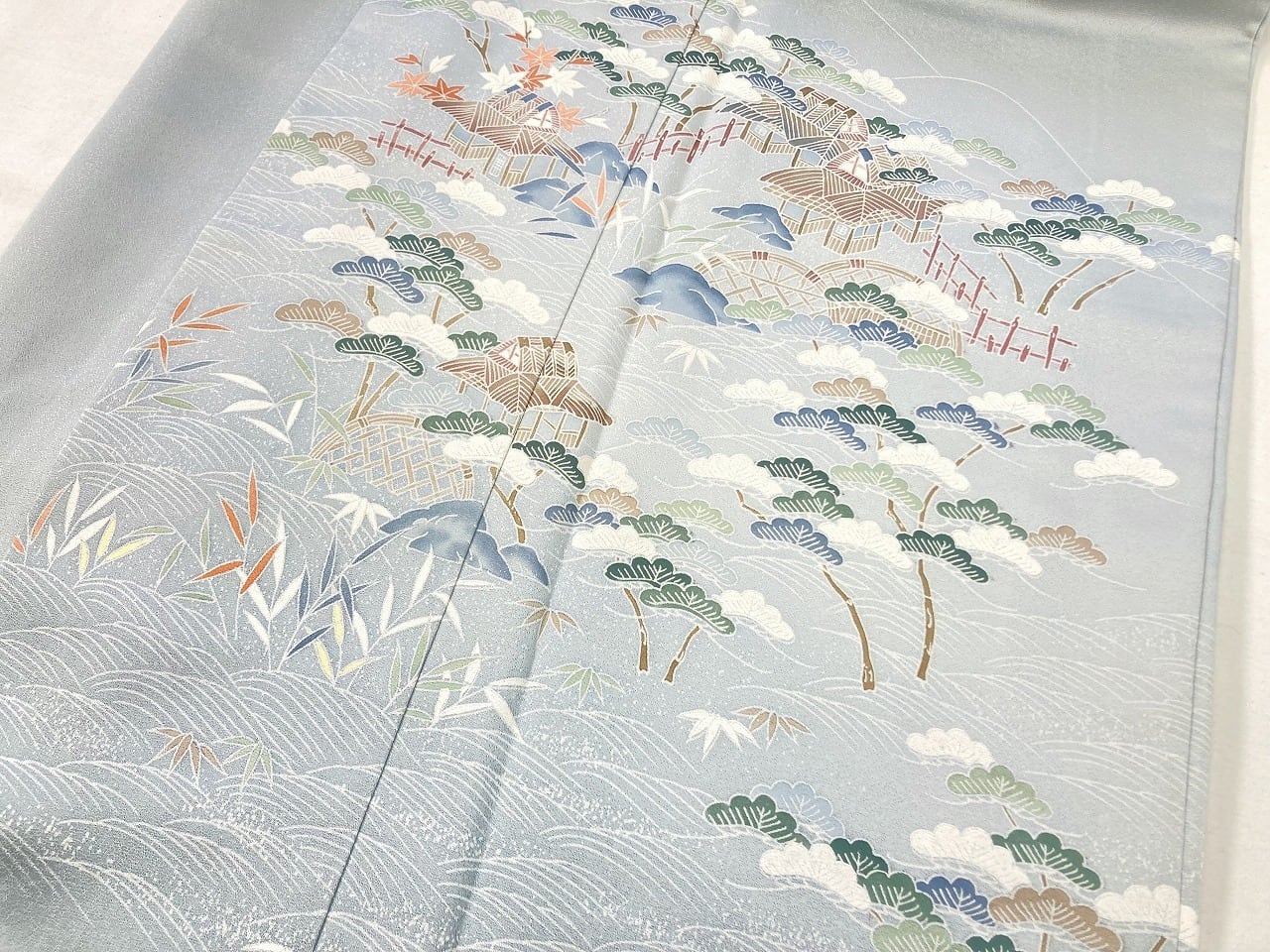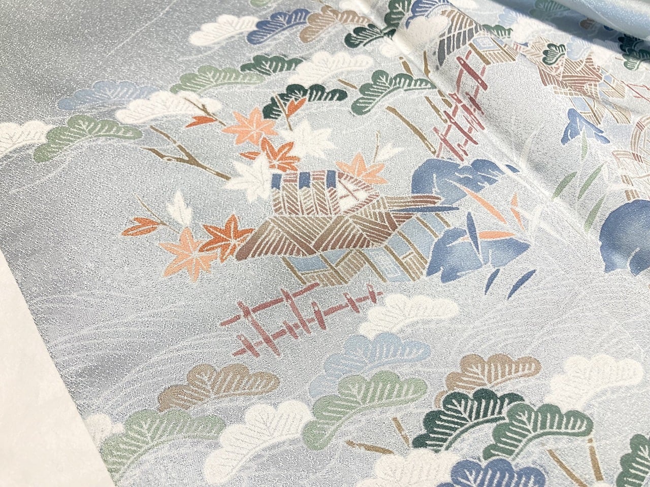 型染め友禅 茶屋辻 松 竹 訪問着 袷 正絹 水色 白 ブルー 1404