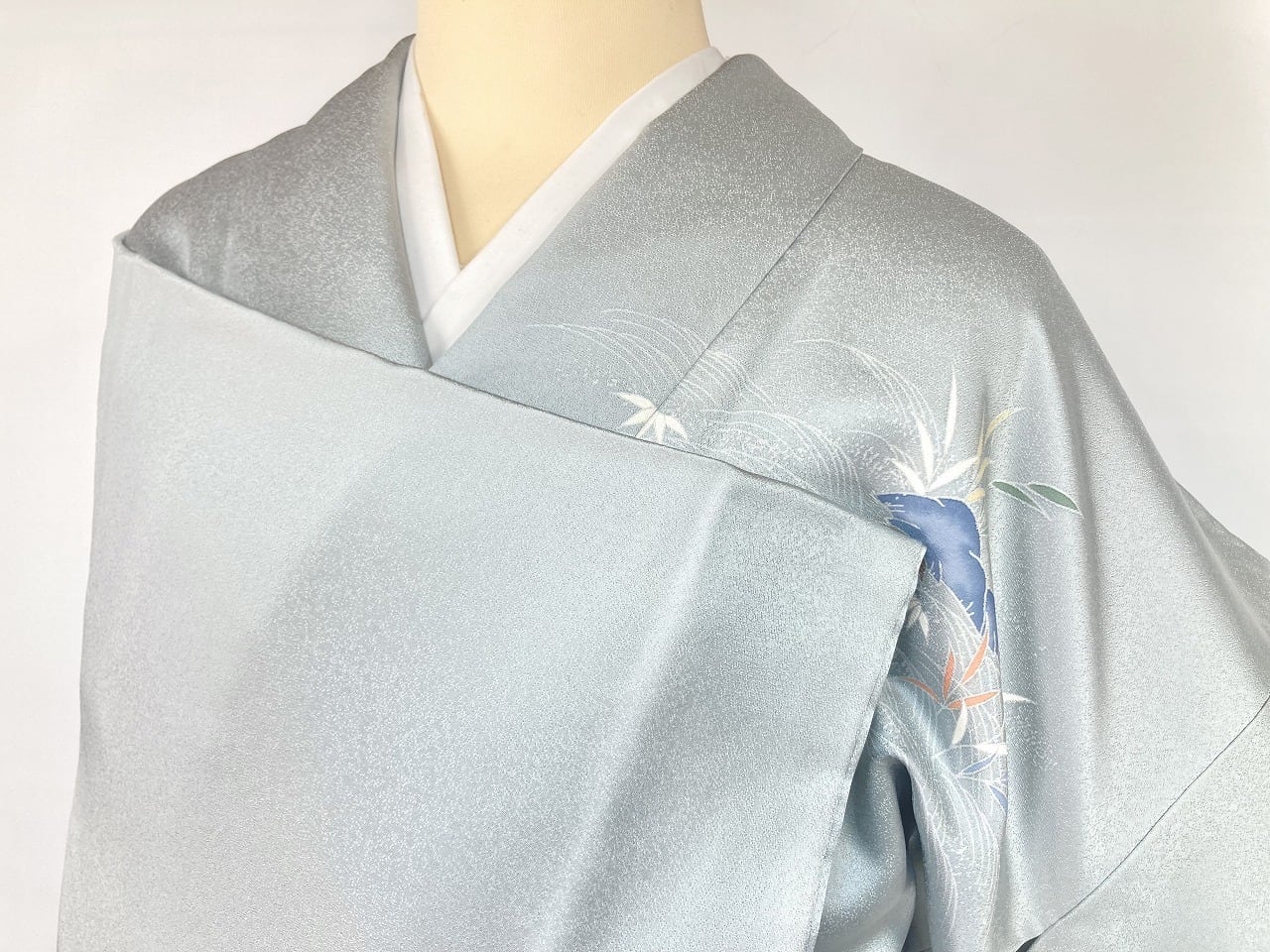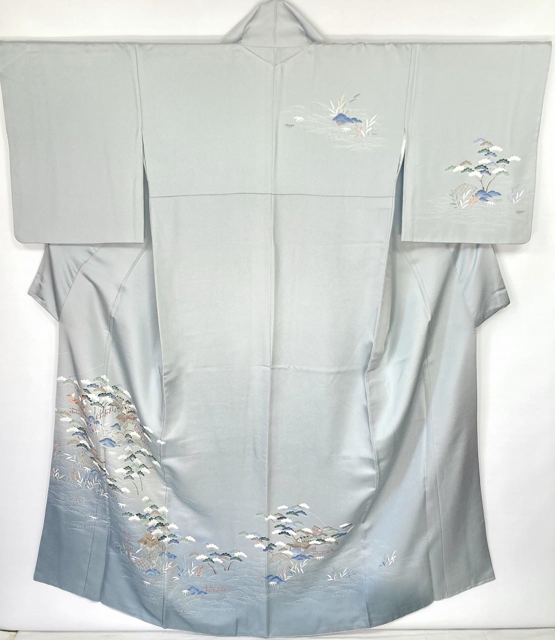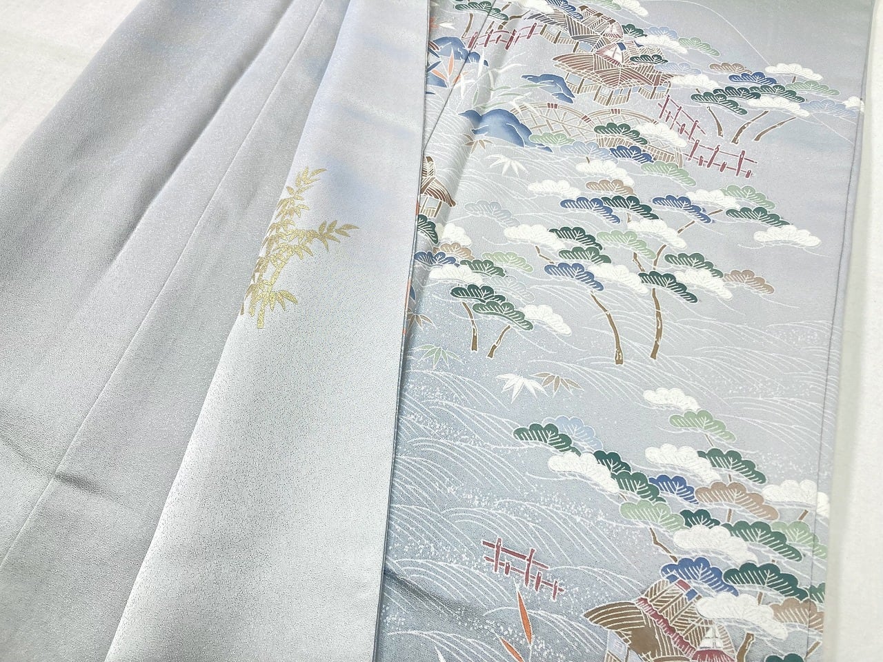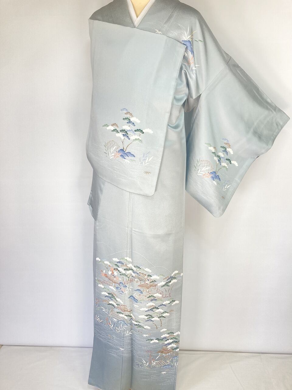 型染め友禅 茶屋辻 松 竹 訪問着 袷 正絹 水色 白 ブルー 1404