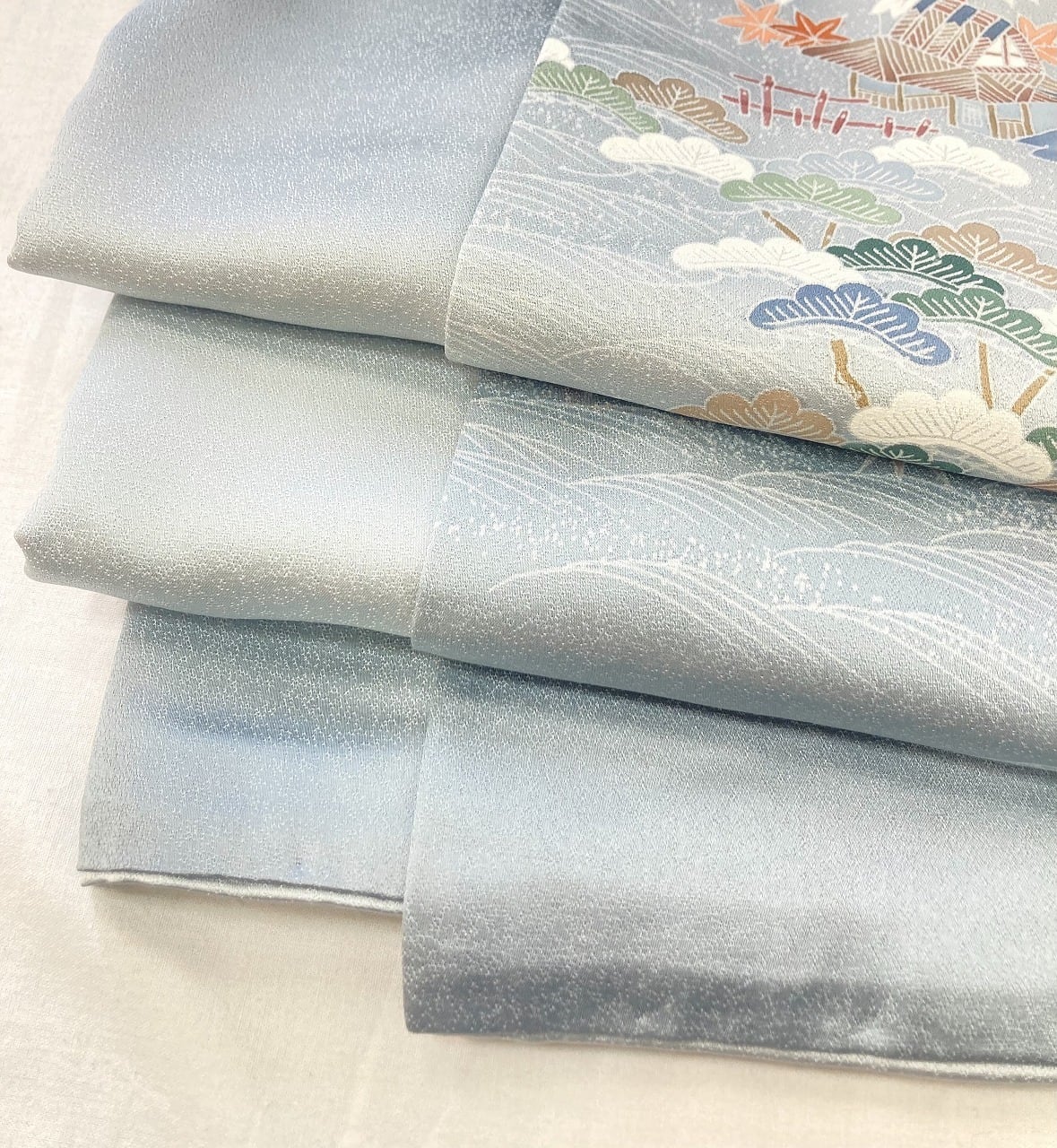 やわらかな「ぼかし染め」でワントーン濃いブルーへの美しいグラデーションによりメリハリが生まれ、緻密な「型染め友禅」で縁起の良い[吉祥文]の松や竹笹をあしらった格調高い[茶屋辻]文様を優雅に描いた意匠美の作品です。