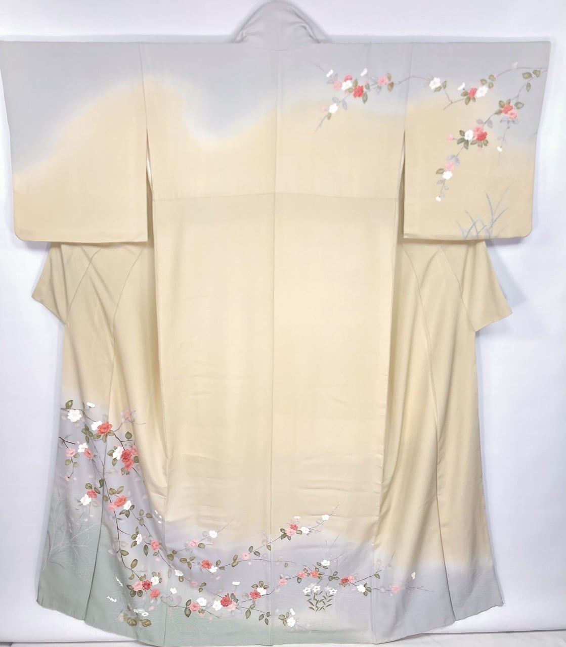 やわらかな「ぼかし染め」で淡い水色と黄緑の美しい「染め分け」により華やぎが生まれ、色とりどりの[椿]が優雅に枝垂れ、菊や桔梗などの花々をあしらい、さりげなくモダンな[流水]を配した、一筆一筆息遣いの聴こえる繊細な「手描き友禅」で丹念に描いた、うっとりするほど美しい見事な作品です。