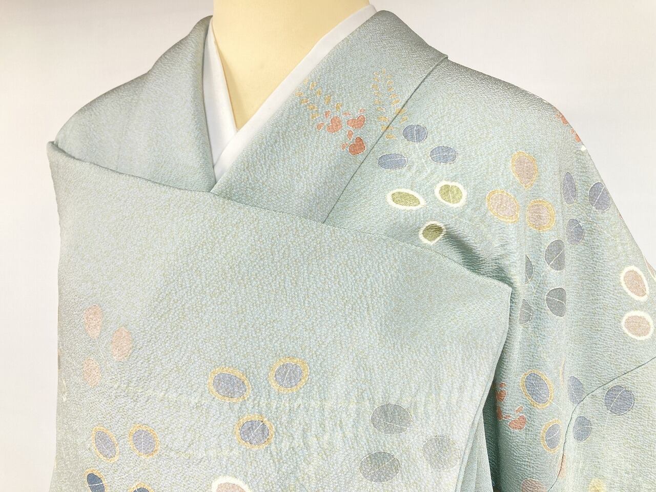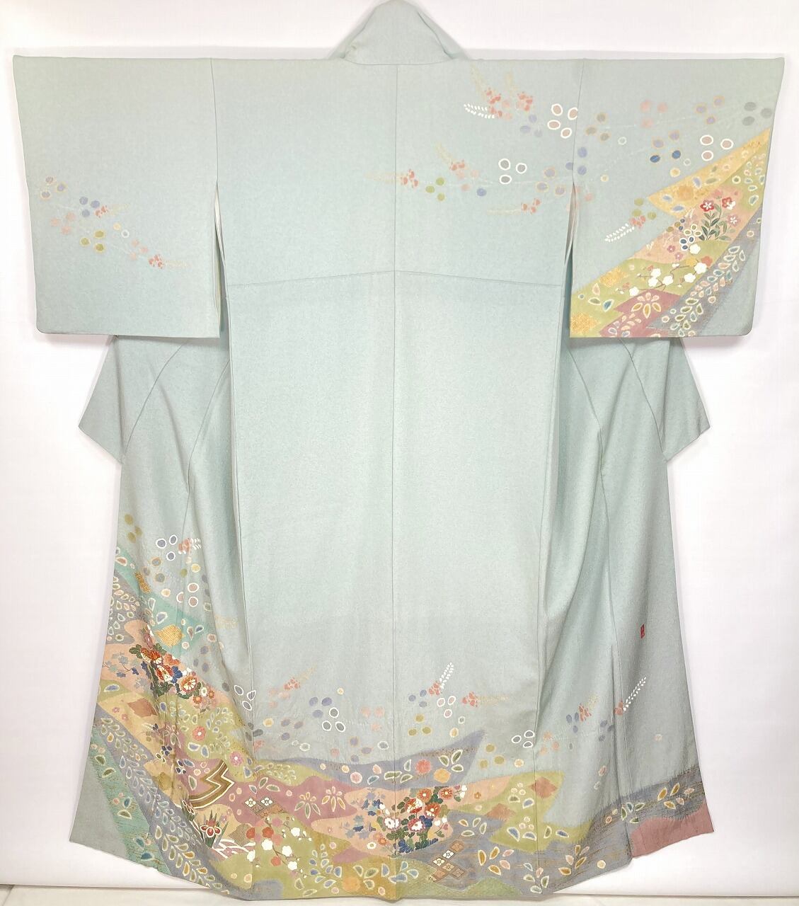 作家物 京友禅 染め分け 手絞り 金駒刺繍 辻ヶ花 花柄 訪問着 袷 正絹 水色 黄緑 青 1410