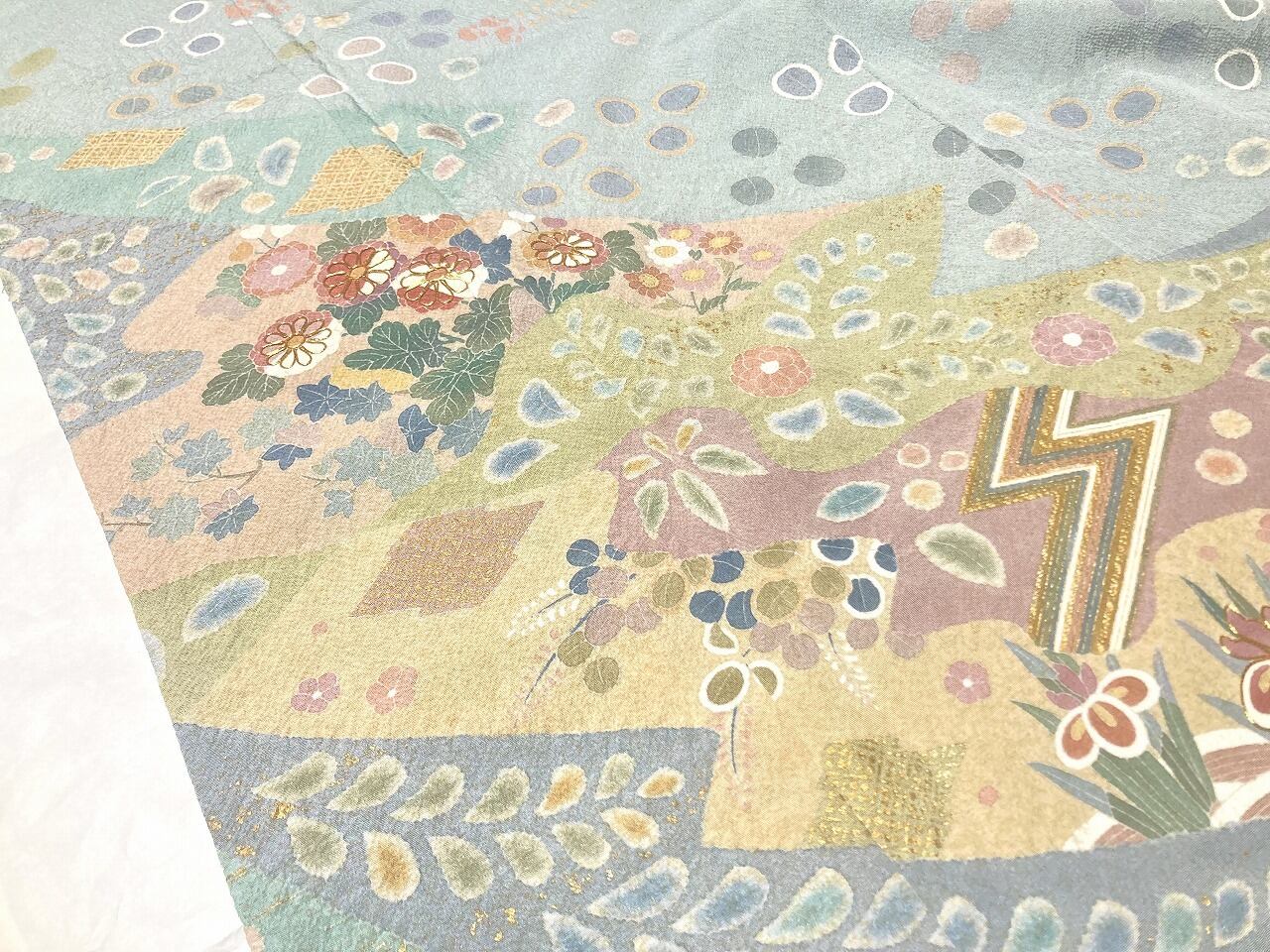 丹念な手仕事による「天目染め」を全体に施し、独特のきめ細かな模様によりやわらかな色合いになり、奥行きや立体感が生まれ、多彩な「手描き友禅」「手絞り」「金箔」「金彩」を駆使し、菊・藤・梅・萩・杜若などの[四季の花々]や[辻ヶ花]を散りばめ、古典柄の雅やかな[熨斗]を流れるようにスタイリッシュに配し、左衽・左前身頃・右後ろ身頃に「金駒刺繍」をふんだん(8ヶ所)に施し、手間隙かけて制作された大変加工の良い作品です。