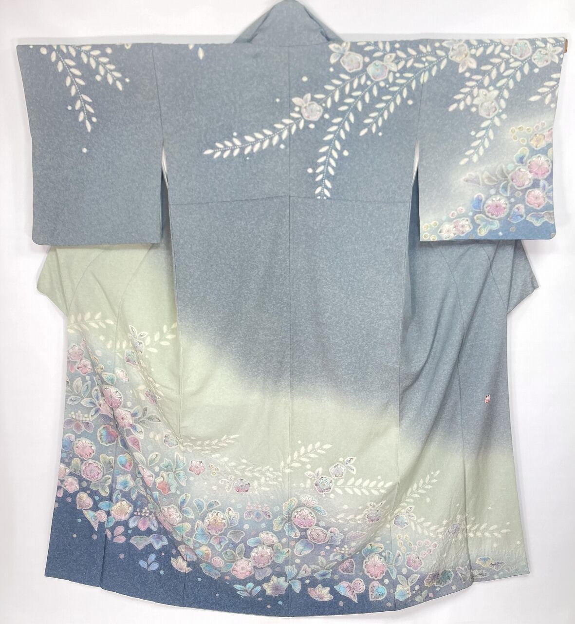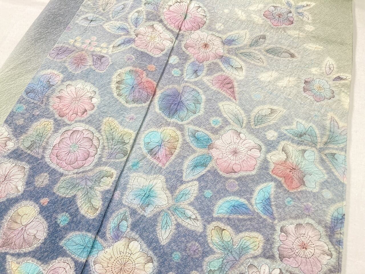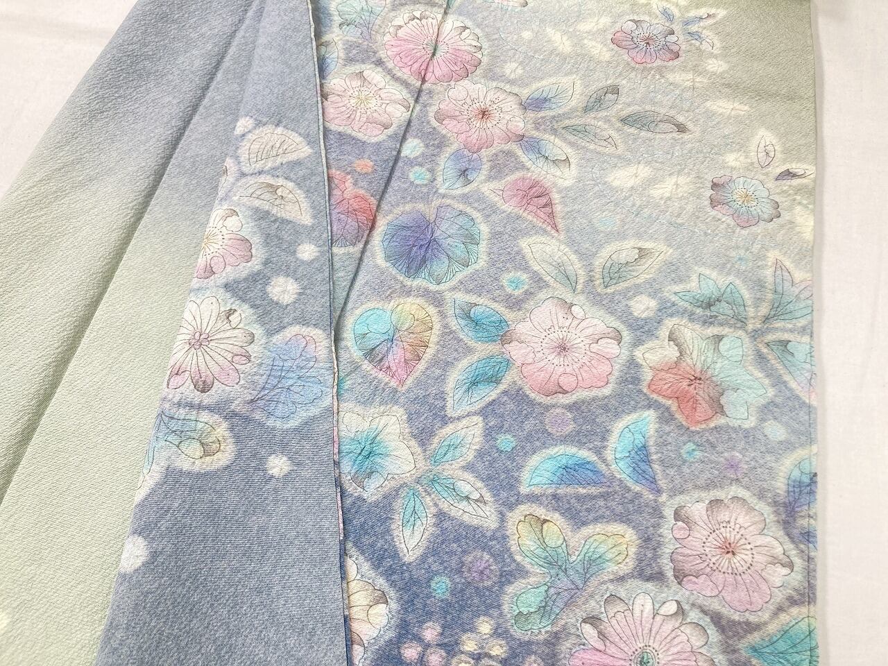繊細な手仕事による「天目染め」を全体に施し、独特きめ細かな模様で奥行きや立体感が生まれやわらかな色合いになり、淡い黄緑からワントーン濃いブルーへの美しいグラデーションによる「染め分け」が華やぎを添え、多彩な「友禅」「ぼかし染め」「手絞り」「墨絵書き」を駆使し、幻想的な[辻ヶ花]が咲き乱れ、上部からは優雅に枝垂れた、一刺し一刺し丹念な「手絞り」で手間隙かけて制作された、うっとりするほど美しい作品です。