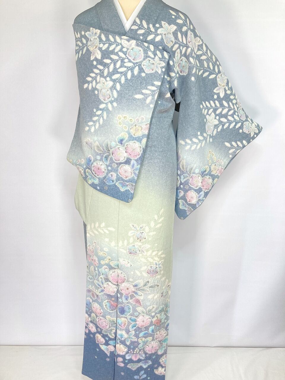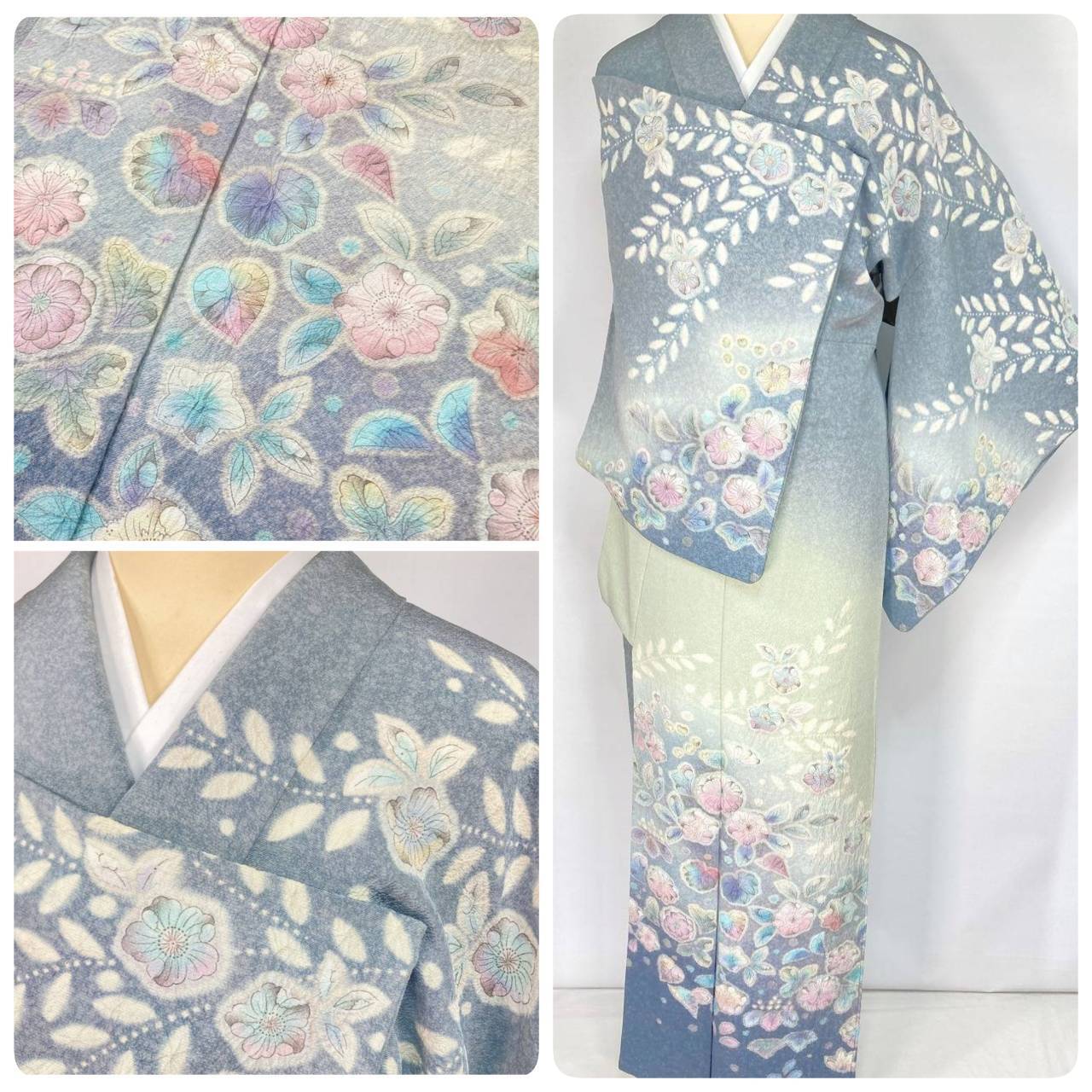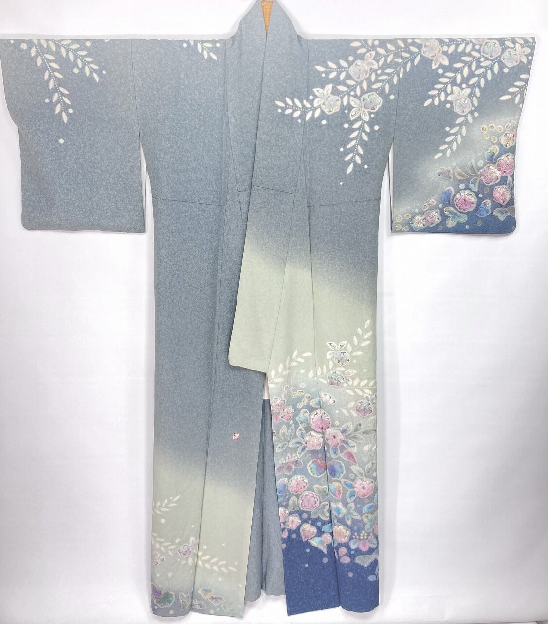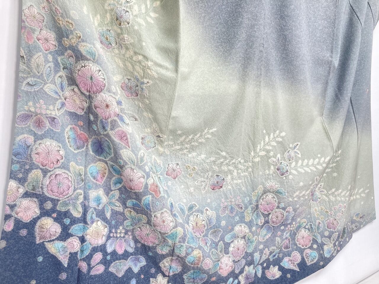 繊細な手仕事による「天目染め」を全体に施し、独特きめ細かな模様で奥行きや立体感が生まれやわらかな色合いになり、淡い黄緑からワントーン濃いブルーへの美しいグラデーションによる「染め分け」が華やぎを添え、多彩な「友禅」「ぼかし染め」「手絞り」「墨絵書き」を駆使し、幻想的な[辻ヶ花]が咲き乱れ、上部からは優雅に枝垂れた、一刺し一刺し丹念な「手絞り」で手間隙かけて制作された、うっとりするほど美しい作品です。