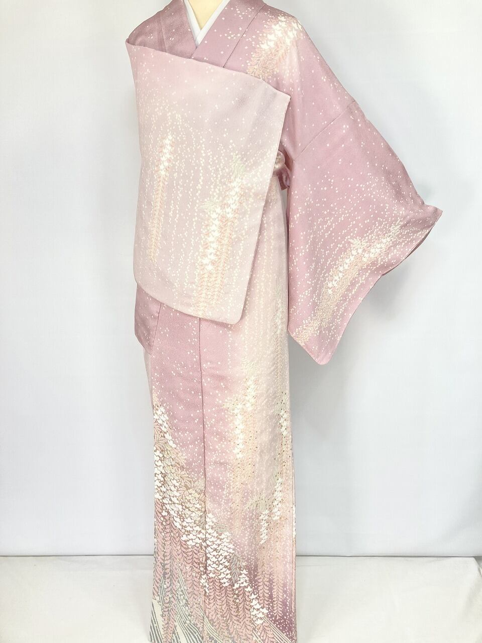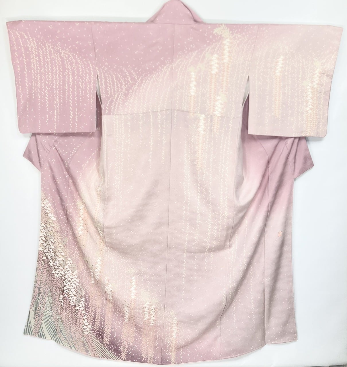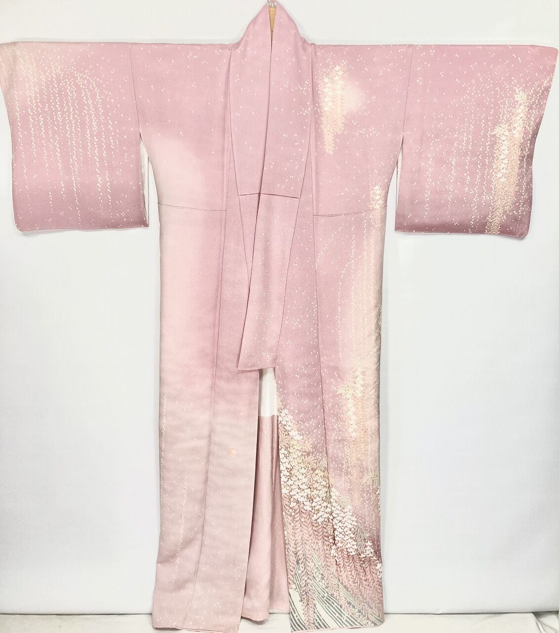 やわらかな「ぼかし染め」でワントーン濃いピンクから紫への美しいグラデーションによる大胆な「染め分け」を配し、端麗に枝垂れた優美な[藤]が華麗に咲き誇り、気品高く輝く「本金箔」を散りばめ、上前には金糸と銀糸の豪華な「相良刺繡」が華やぎを添えた、卓越した職人が一刺し一刺し丹念に絞り 染め上げた、言葉にできないほど美しい大変素晴らしい見事な作品です。