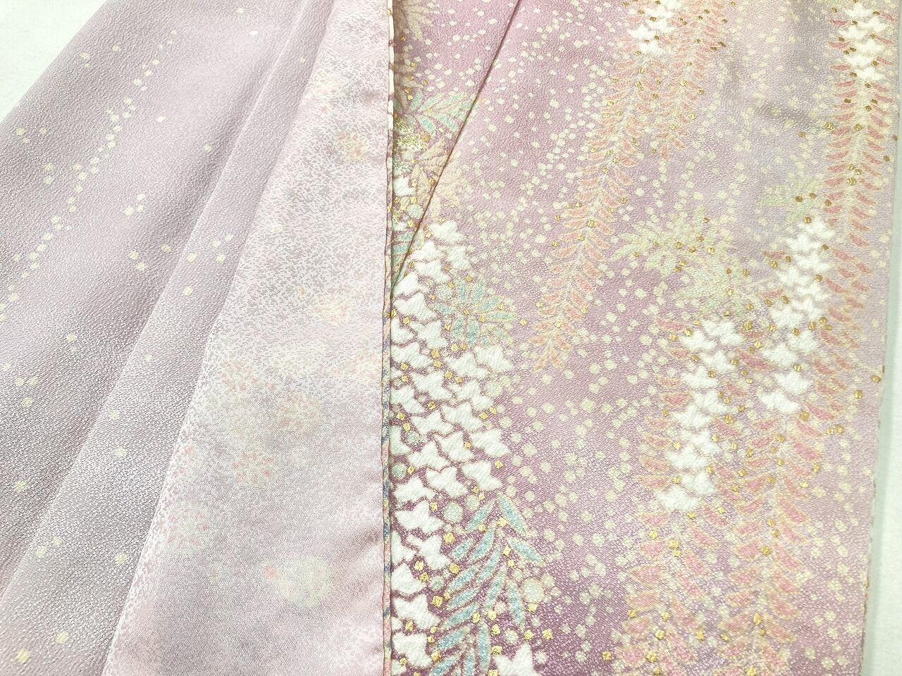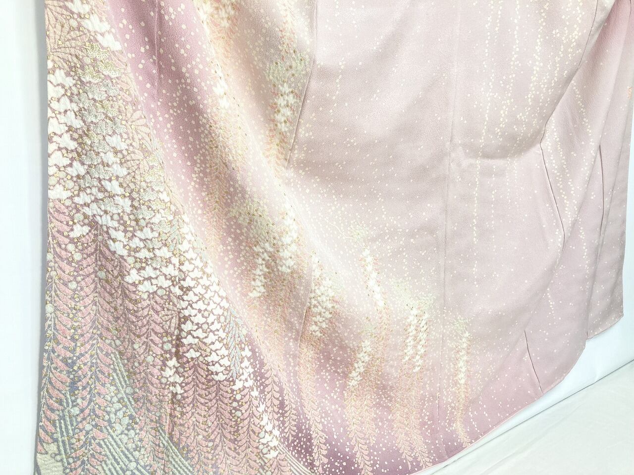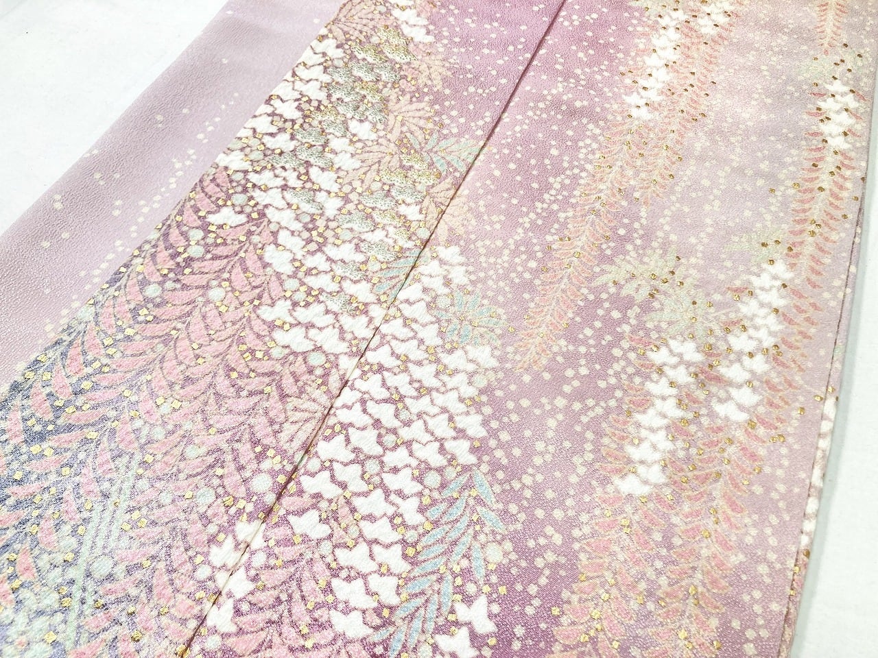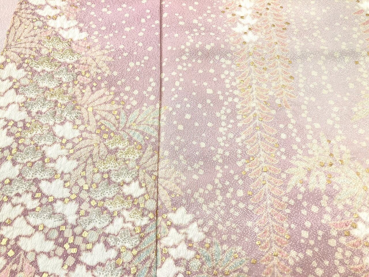 やわらかな「ぼかし染め」でワントーン濃いピンクから紫への美しいグラデーションによる大胆な「染め分け」を配し、端麗に枝垂れた優美な[藤]が華麗に咲き誇り、気品高く輝く「本金箔」を散りばめ、上前には金糸と銀糸の豪華な「相良刺繡」が華やぎを添えた、卓越した職人が一刺し一刺し丹念に絞り 染め上げた、言葉にできないほど美しい大変素晴らしい見事な作品です。