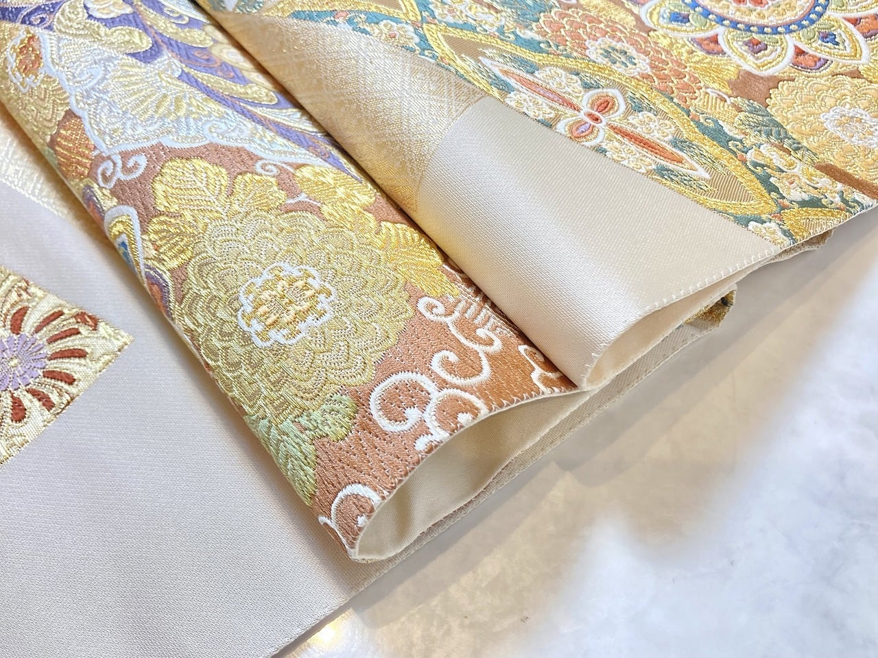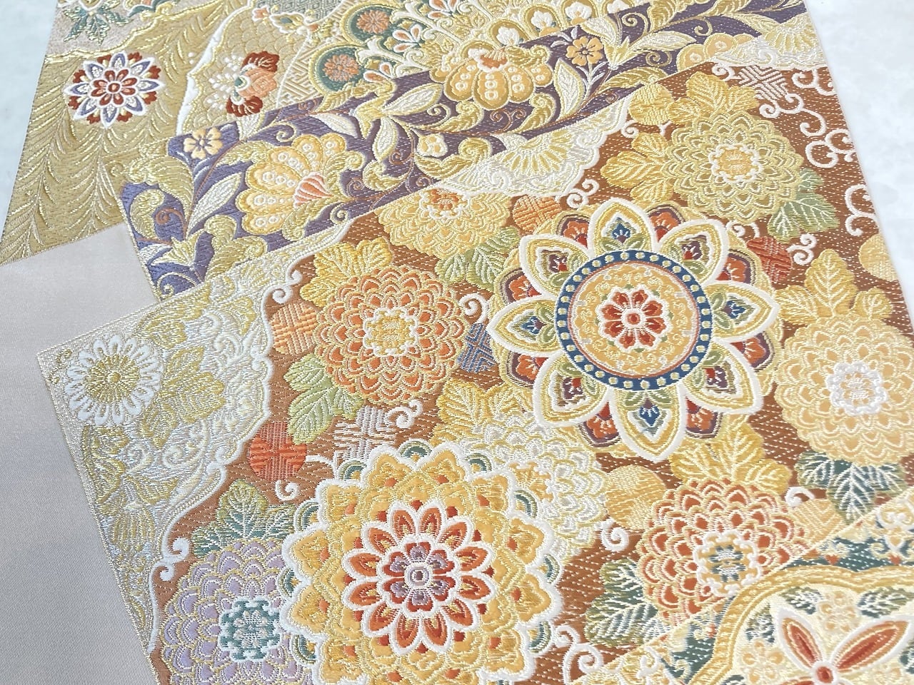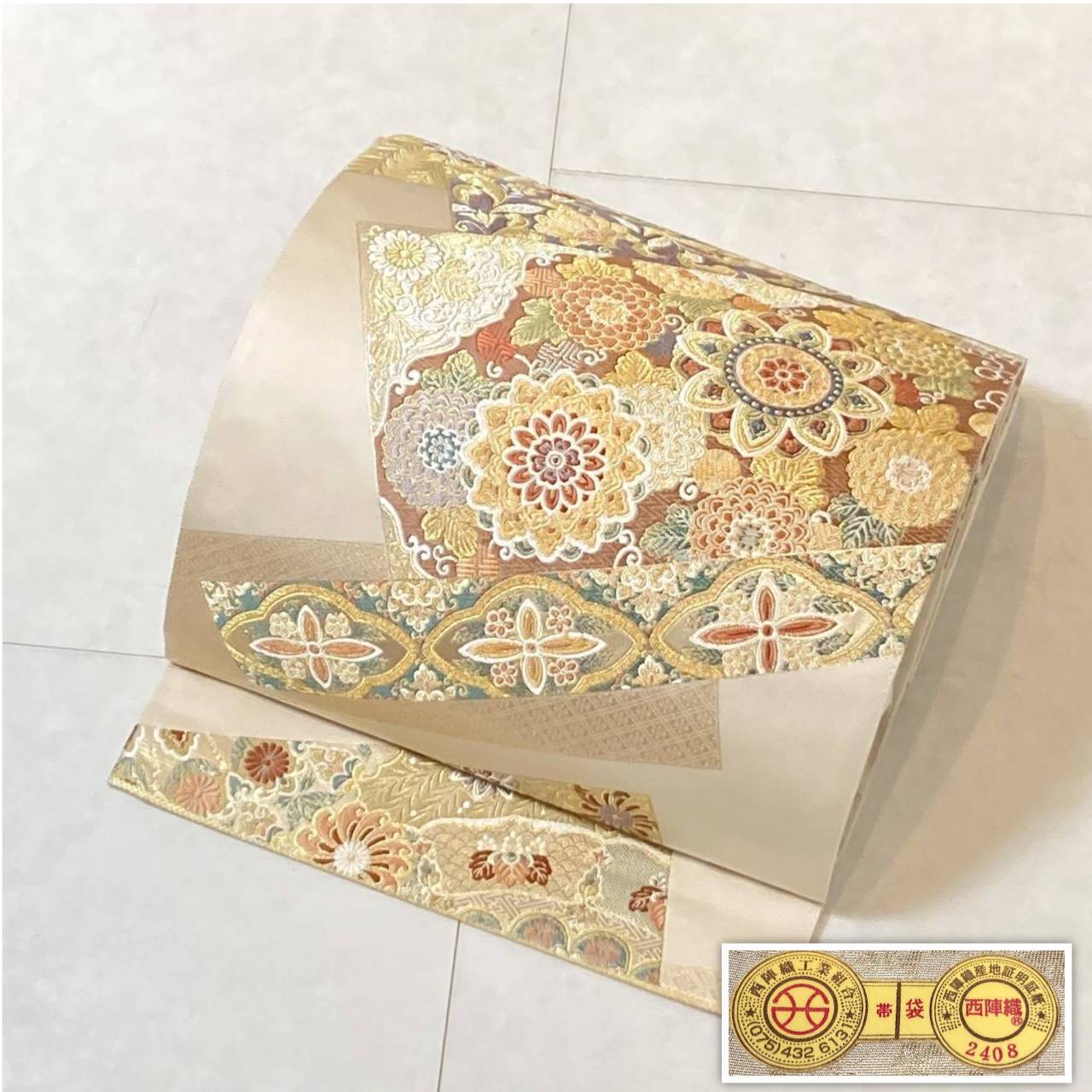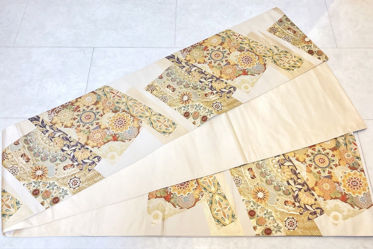 ■美しく煌めく「金糸」「銀糸」色とりどりの「絹糸」を使い、優雅な[華紋][唐花]や菊などの草花を散りばめスタイリッシュに配し、ふっくらとした刺繍のような細密な「唐織」を本場西陣で丹念に織り上げた大変加工の良い作品です。