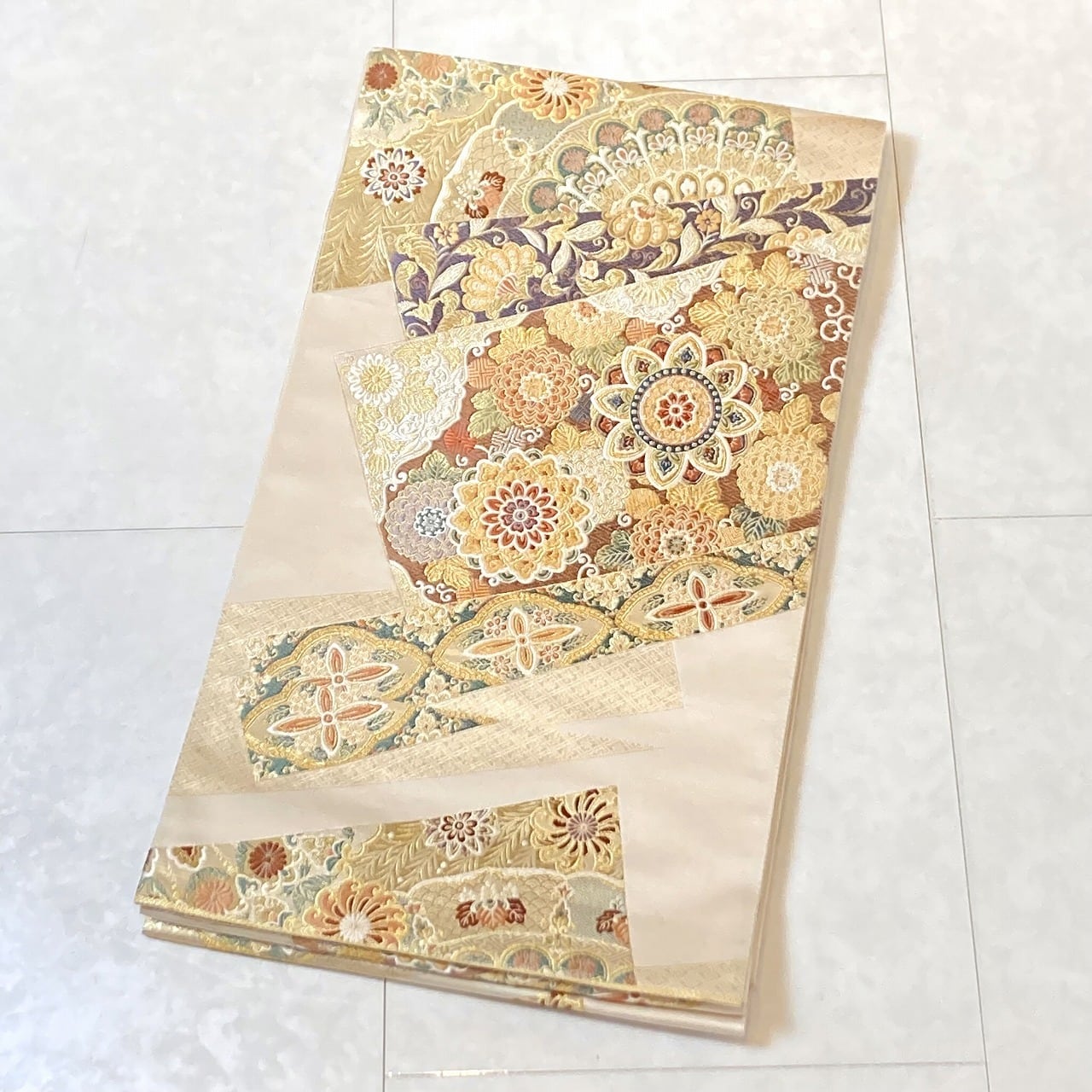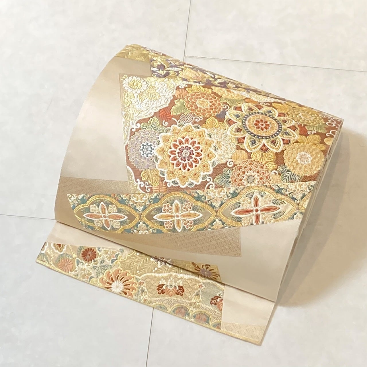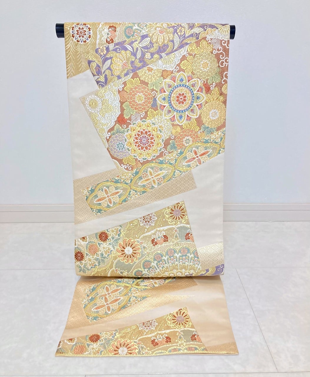 ■美しく煌めく「金糸」「銀糸」色とりどりの「絹糸」を使い、優雅な[華紋][唐花]や菊などの草花を散りばめスタイリッシュに配し、ふっくらとした刺繍のような細密な「唐織」を本場西陣で丹念に織り上げた大変加工の良い作品です。