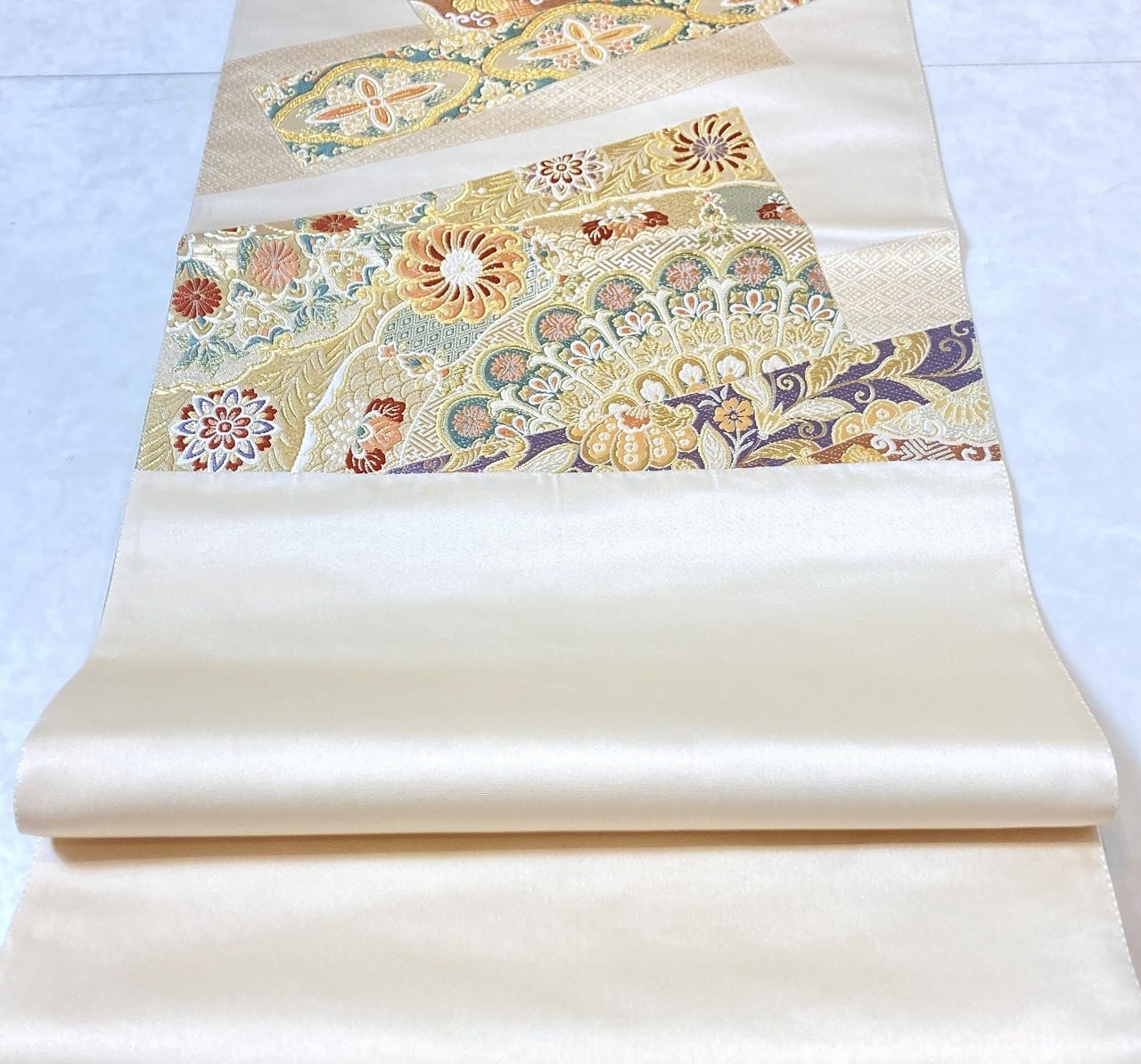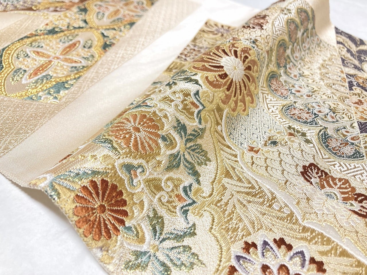 未使用 西陣織 唐織 袋帯 華紋 唐花 金糸 銀糸 白 赤 緑 紫 ベージュ 721