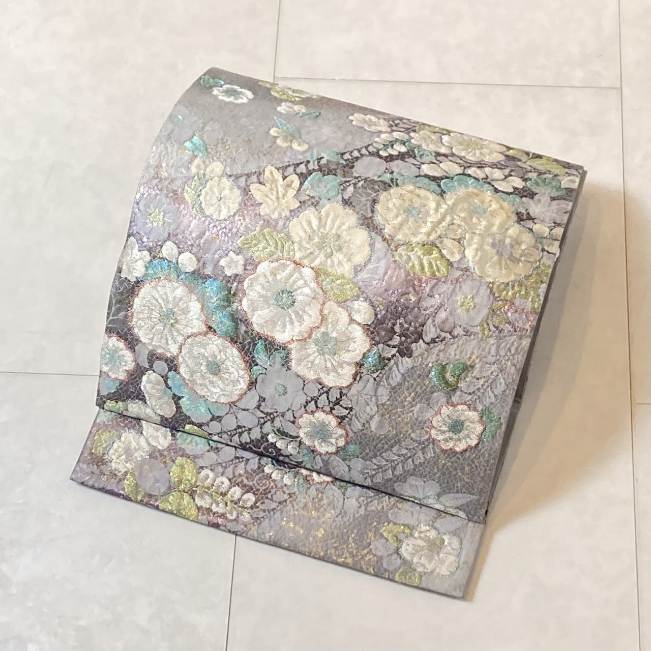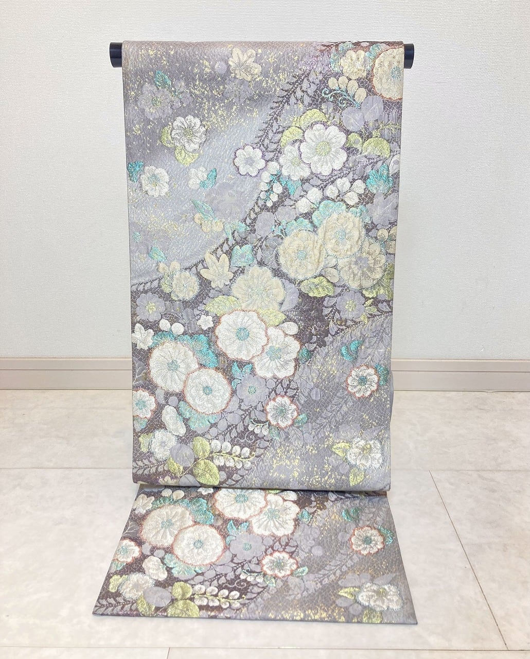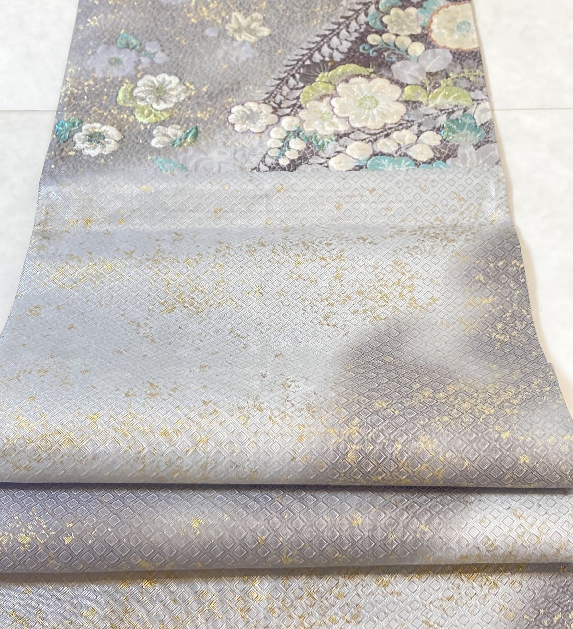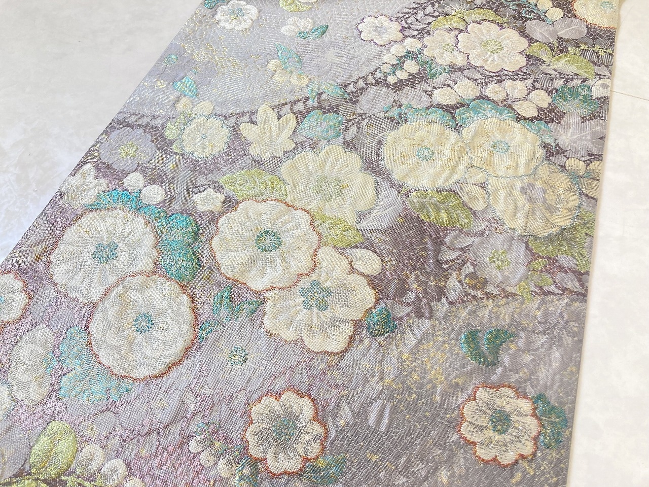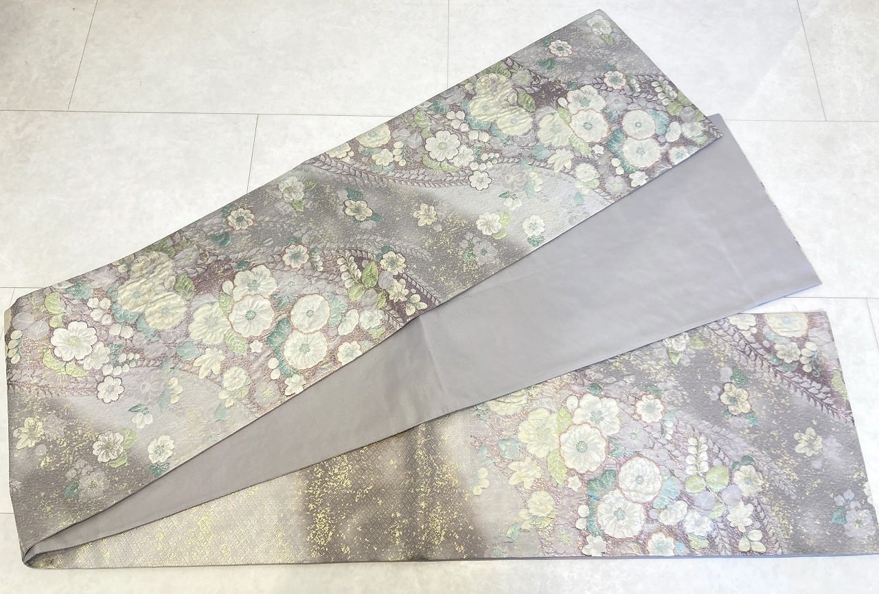 ■美しく輝く色とりどりの「箔糸」を使い、「膨れ織り」や丹念な手仕事による「纐纈」をふんだんに施した立体的な[辻ヶ花]が美しく咲き乱れ、気品高く煌めく「金箔」を散りばめた、手間隙かけて制作された大変加工の良い作品です。