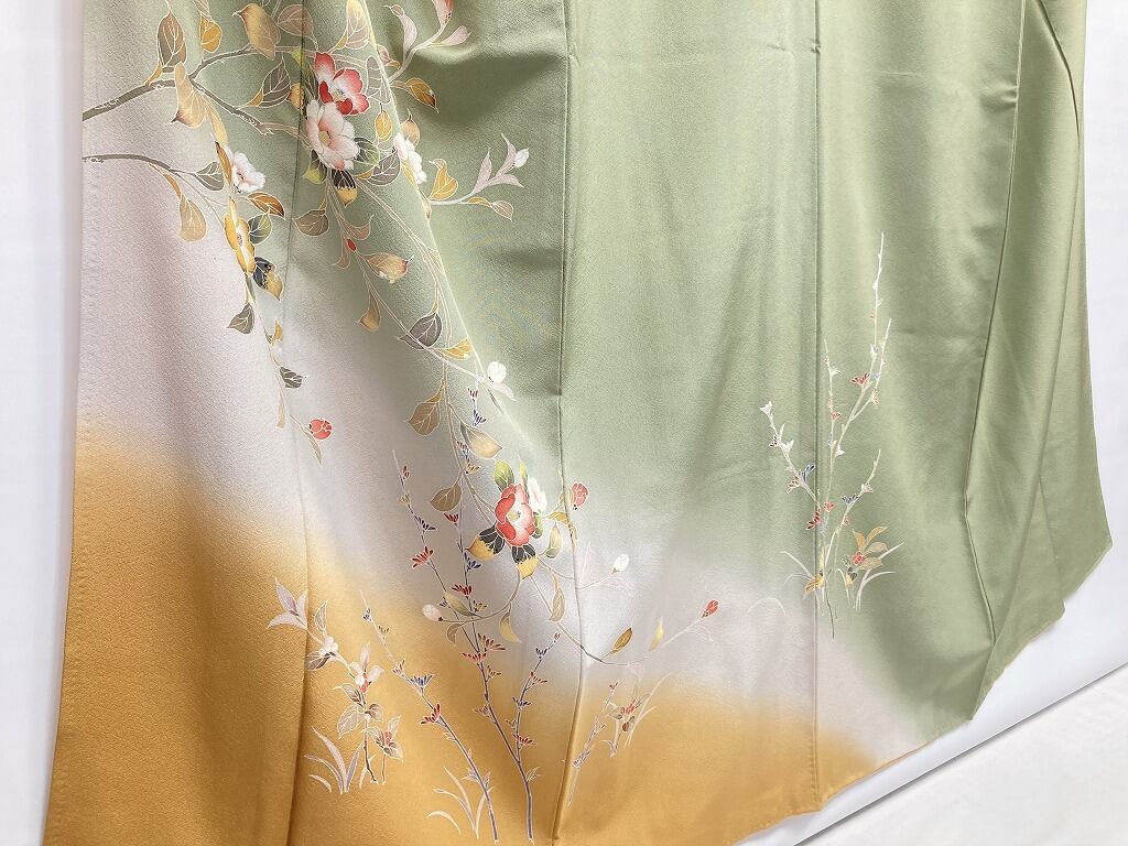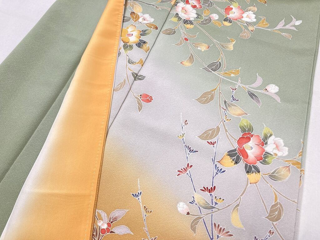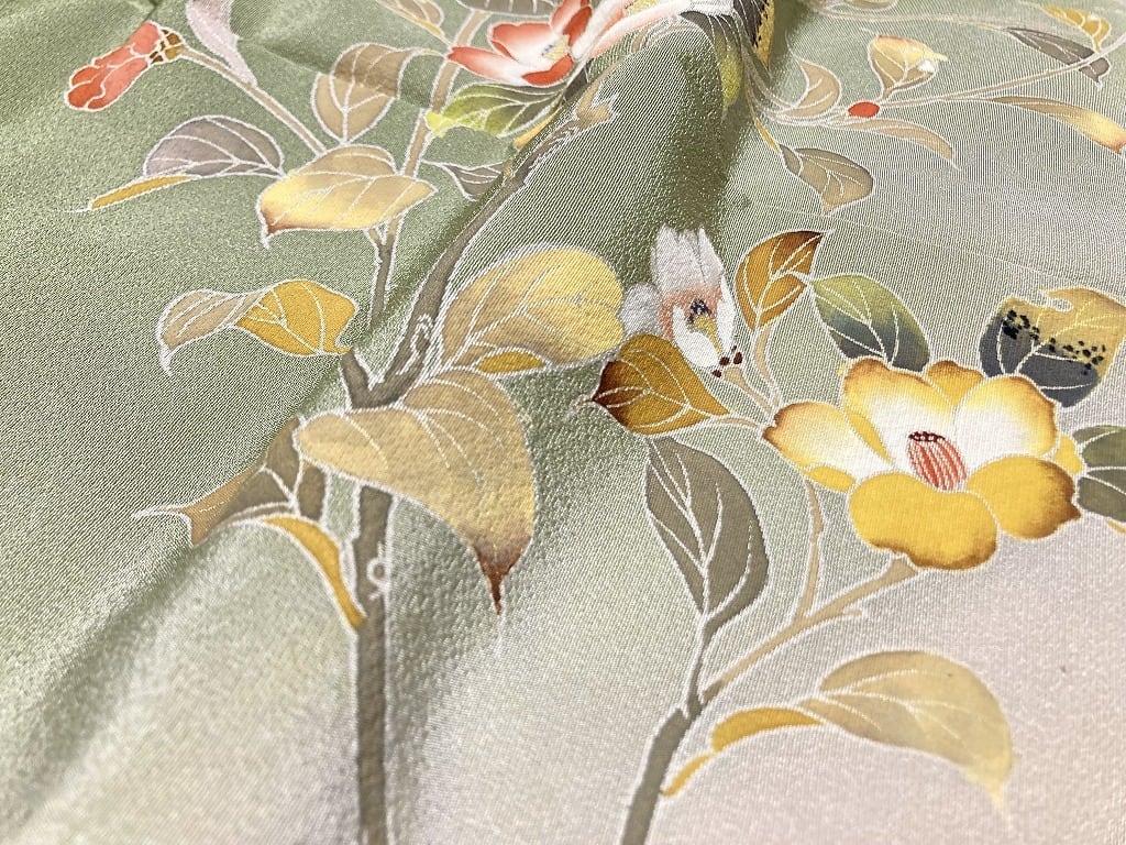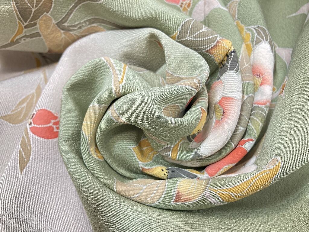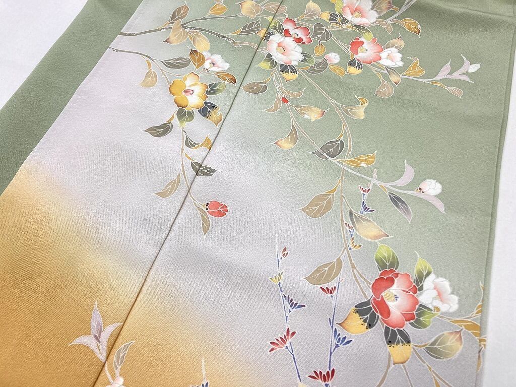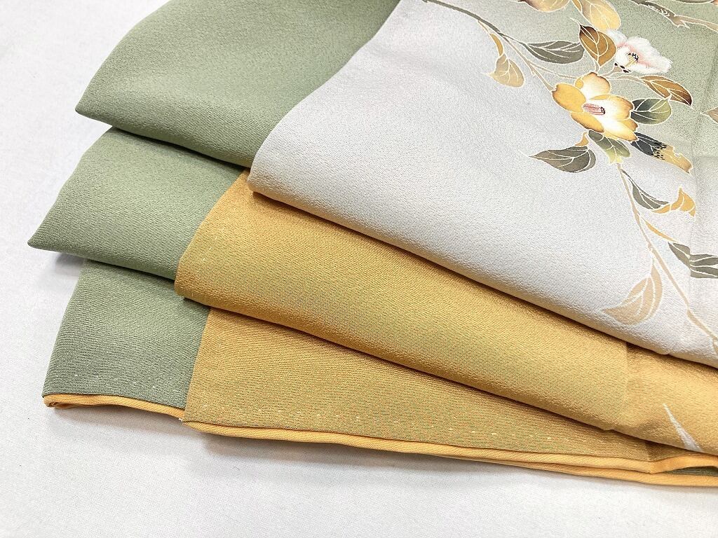 京加賀友禅 訪問着 花柄 椿 袷 正絹 緑 黄色 白 裏葉柳 アイボリー 1421