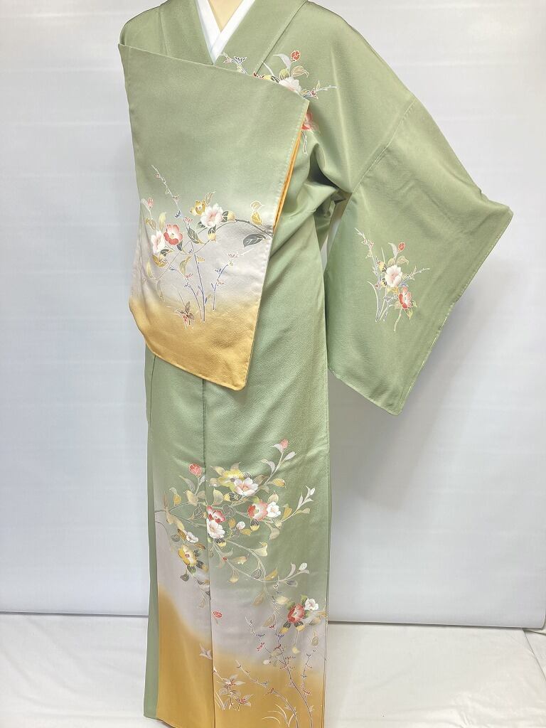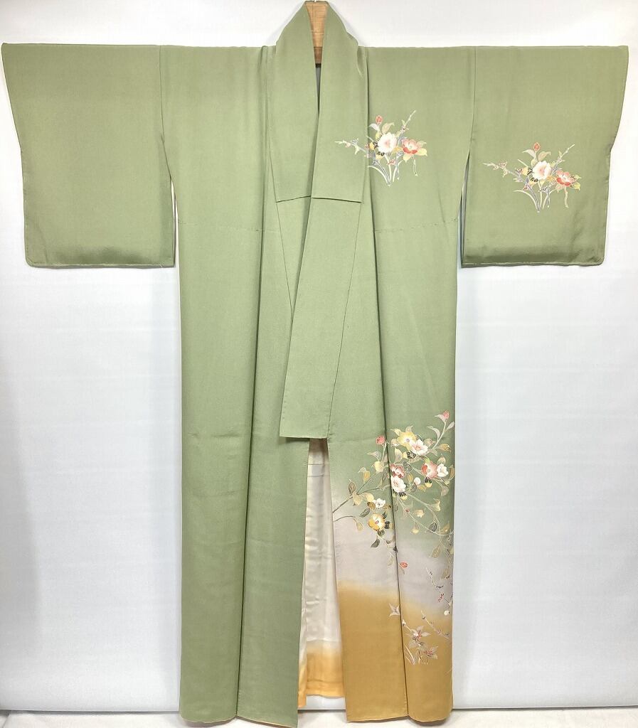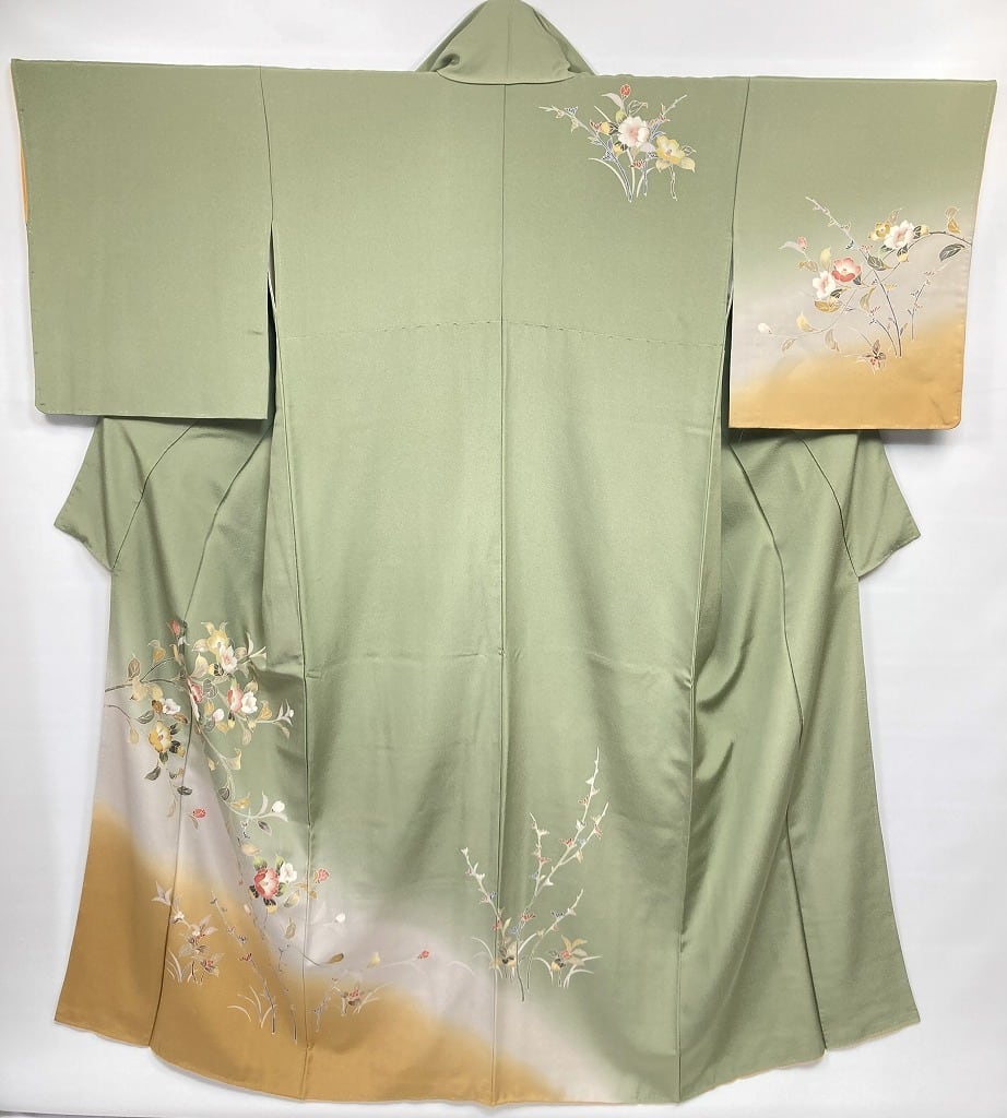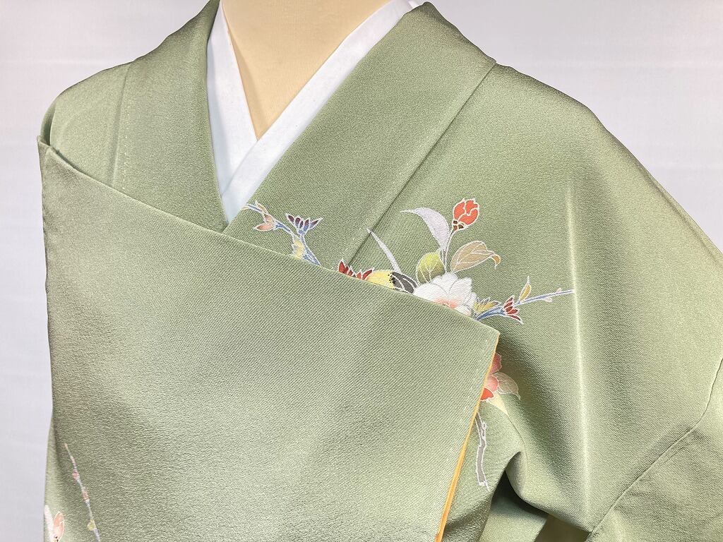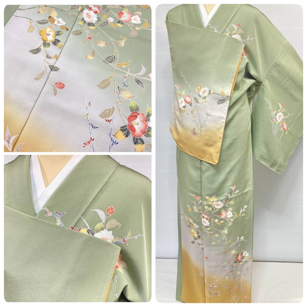 京加賀友禅 訪問着 花柄 椿 袷 正絹 緑 黄色 白 裏葉柳 アイボリー 1421
