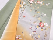 やわらかな「ぼかし染め」で淡いアイボリーから山吹色への美しいグラデーションにより華やぎが生まれ、繊細な「手描き友禅」で[椿]を優雅にあしらい葉の虫食いまで忠実に描き、草花を間隔良く配したうっとりするほど美しい作品です。