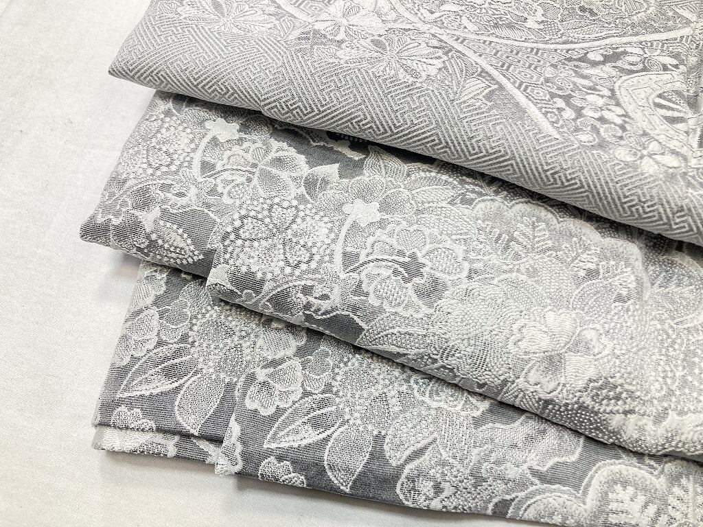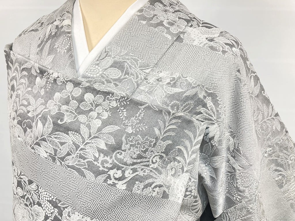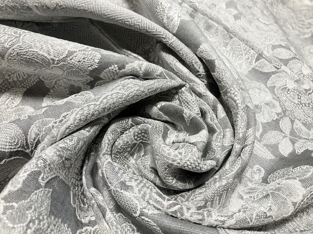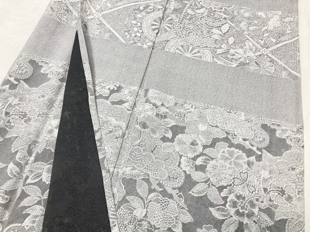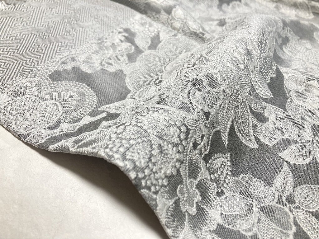 ■名黒の墨を贅沢に全面裏から染めることにより奥行きや立体感、光沢あるグレーの濃淡が生まれ、光の当たり方によりまるでシルバーのようにも煌めき、きめ細かなビロードのような細密・精巧な織りで牡丹・菊・椿・百合・藤などの[四季の花々]が咲き乱れ、格調高い亀甲・紗綾型・菱格子・雪輪や古典柄の水車などあしらい、スタイリッシュな[横段]の見事な「総絵羽」で配した、手間隙かけて制作された圧巻の作品です。