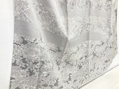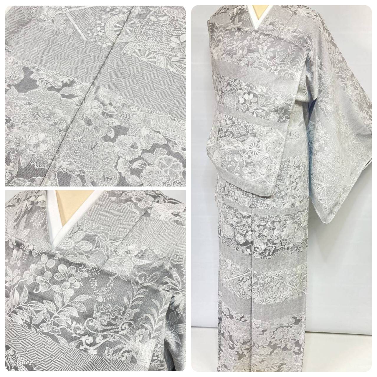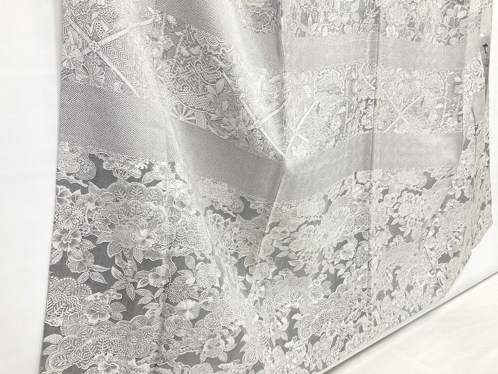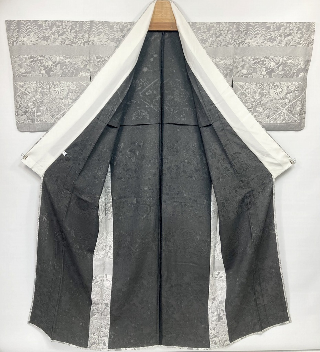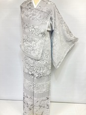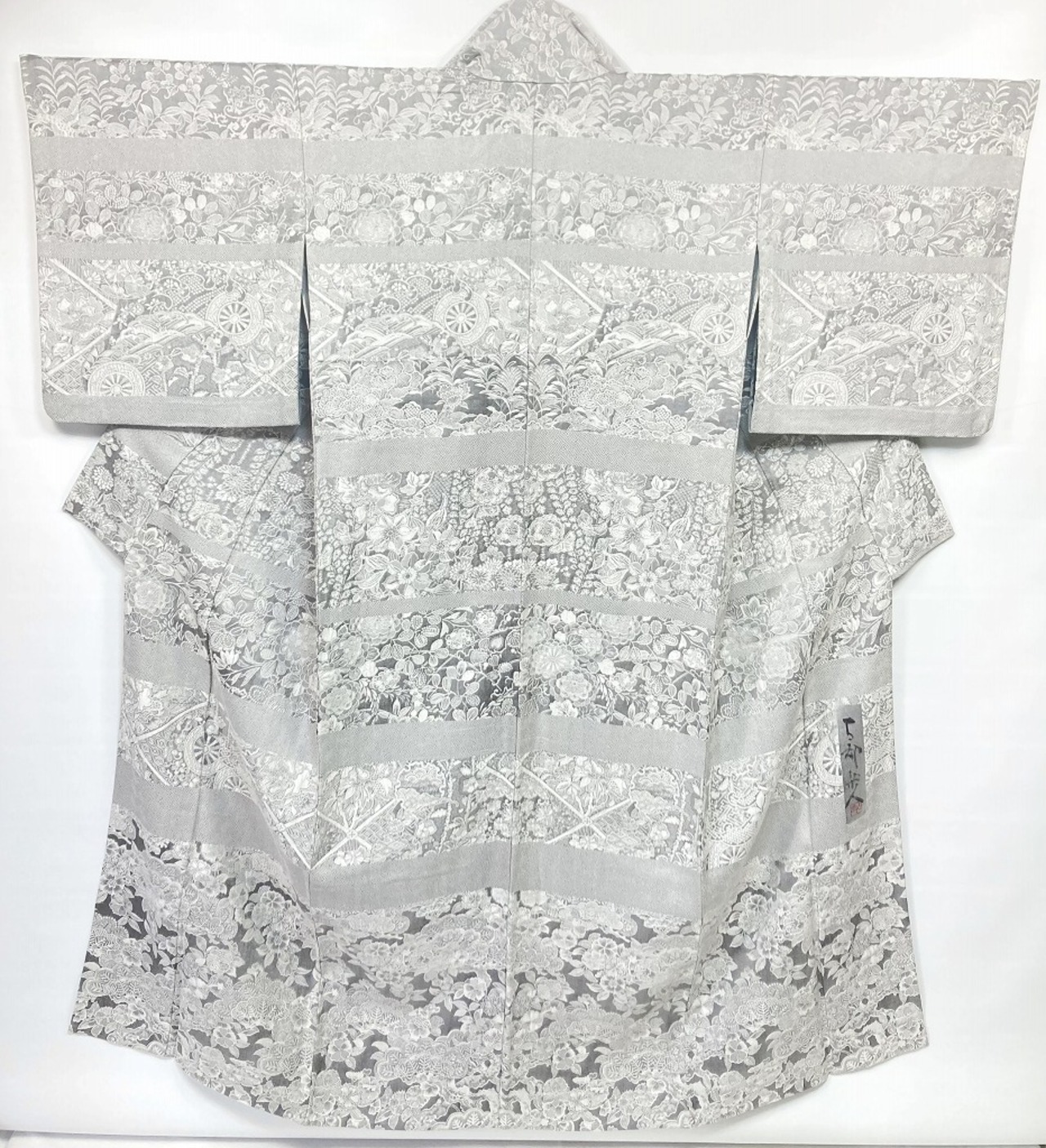 ■名黒の墨を贅沢に全面裏から染めることにより奥行きや立体感、光沢あるグレーの濃淡が生まれ、光の当たり方によりまるでシルバーのようにも煌めき、きめ細かなビロードのような細密・精巧な織りで牡丹・菊・椿・百合・藤などの[四季の花々]が咲き乱れ、格調高い亀甲・紗綾型・菱格子・雪輪や古典柄の水車などあしらい、スタイリッシュな[横段]の見事な「総絵羽」で配した、手間隙かけて制作された圧巻の作品です。