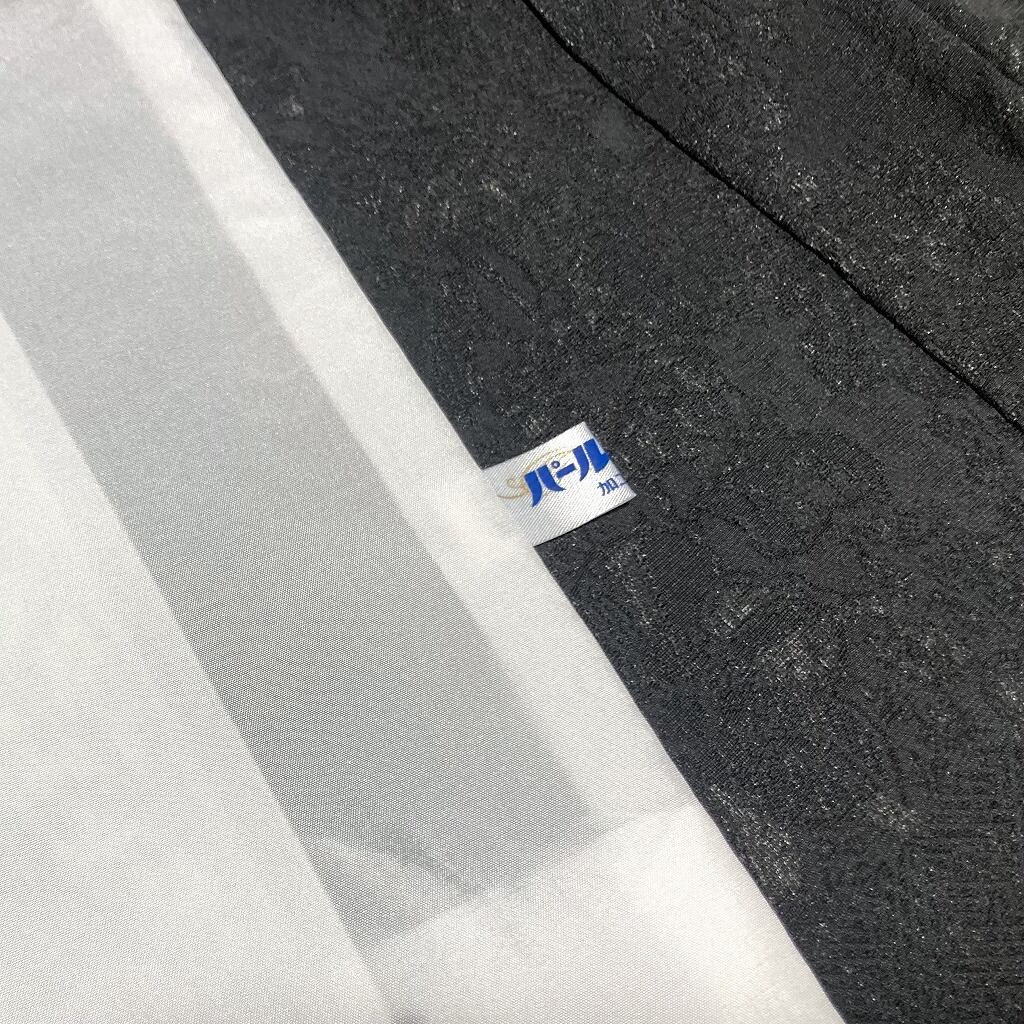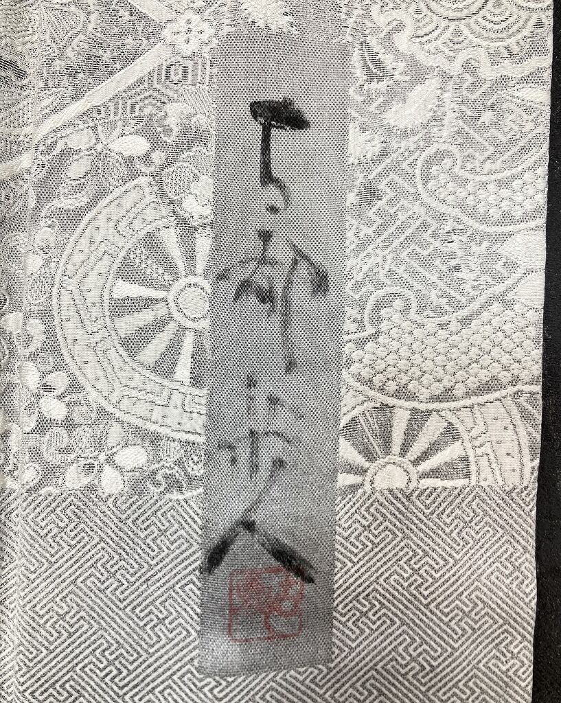 ◇最高の天然染料、名黒の墨を100%全面大量に用い絹の光沢と、松煙粒子の墨の光に神秘な銀色を活かし、染人・古都独特の技により生み出された、世界でも類を見ない染織技術です。