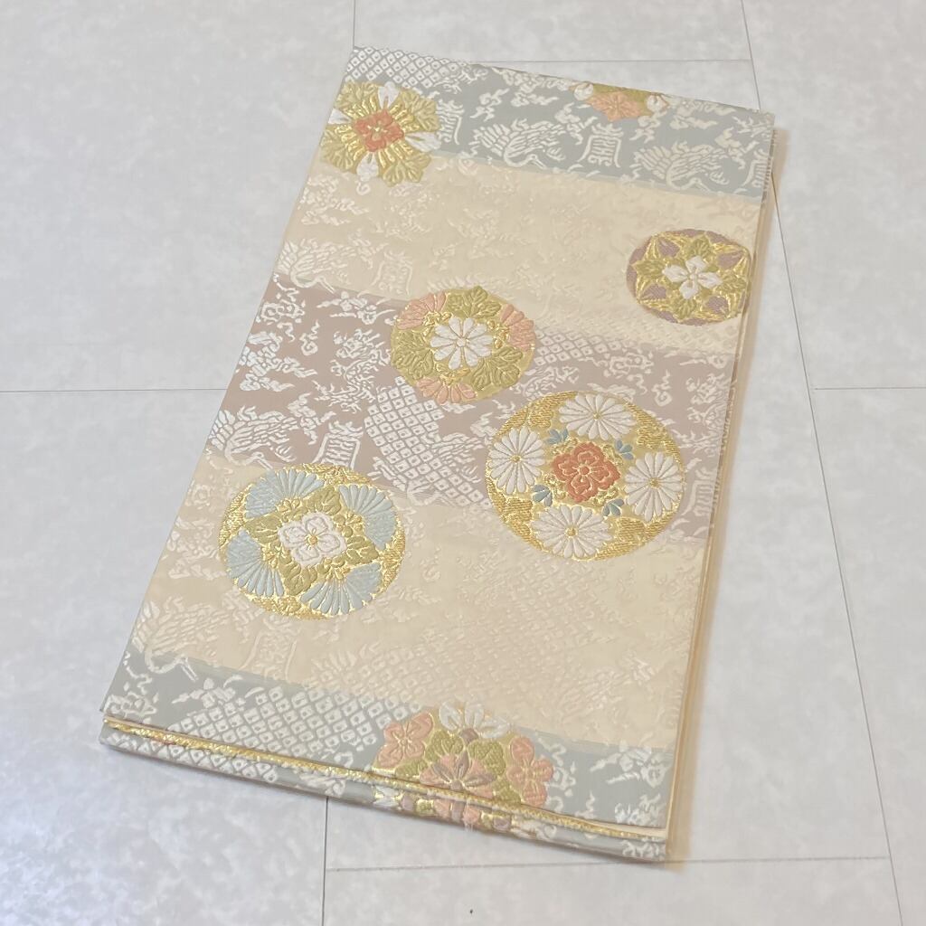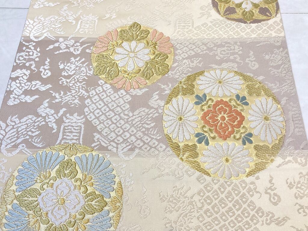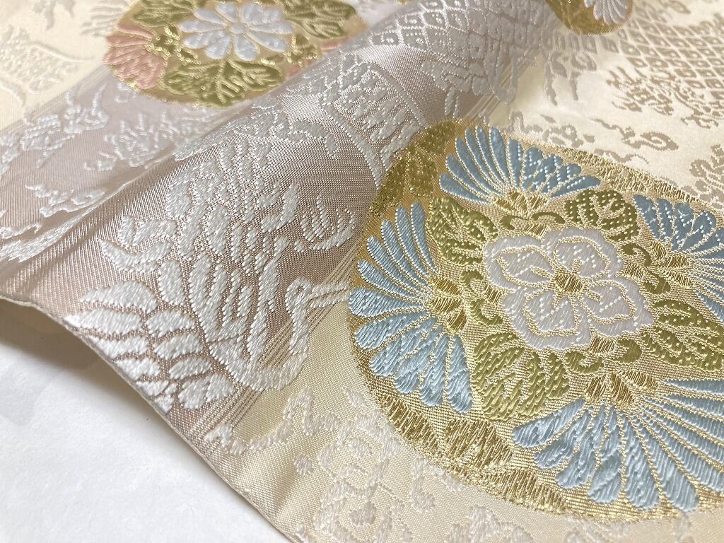 高級唐織 丸紋 鳳凰 袋帯 正絹 金糸 白 クリーム 水色 紫 723