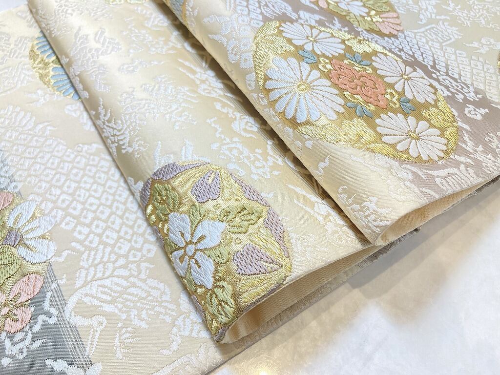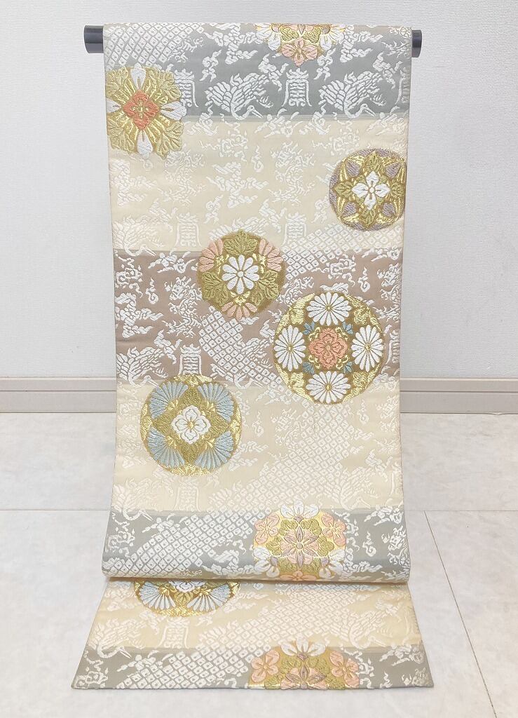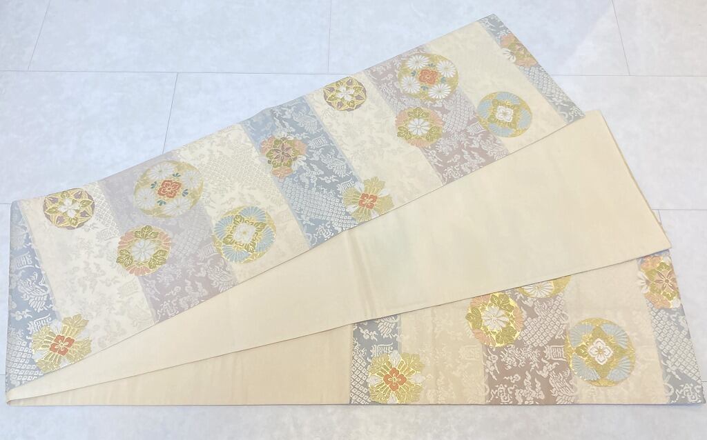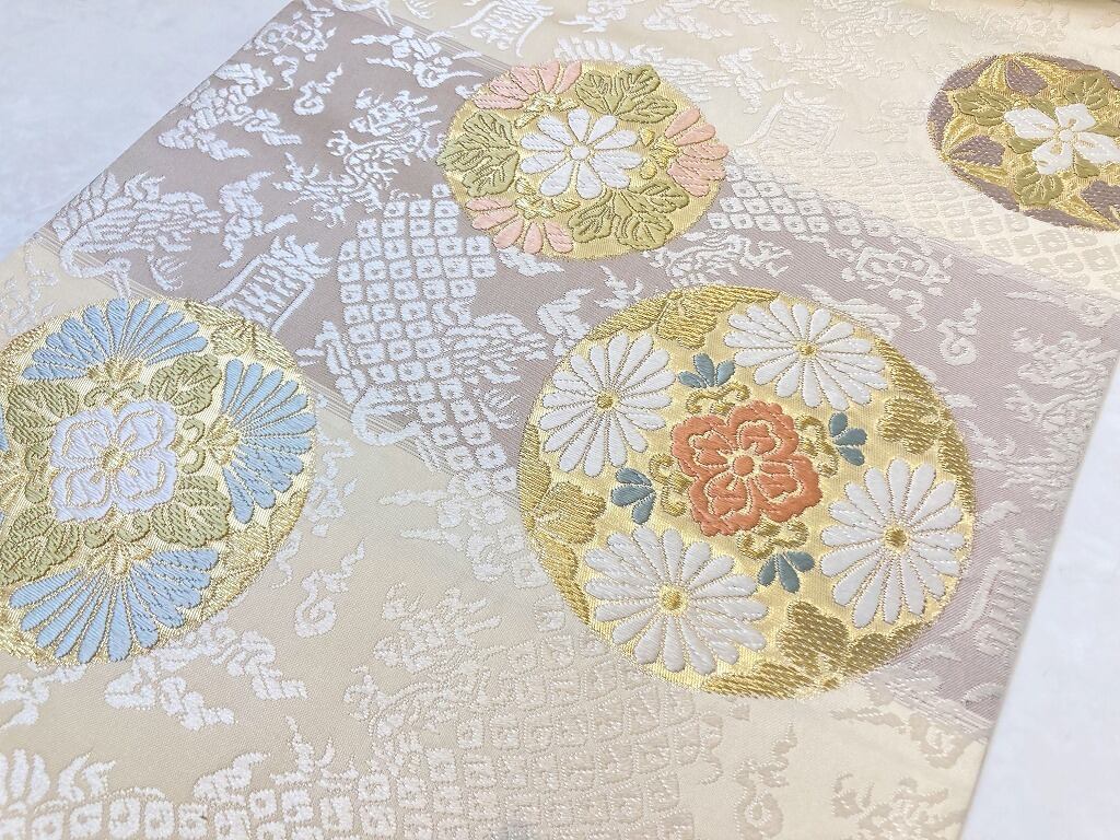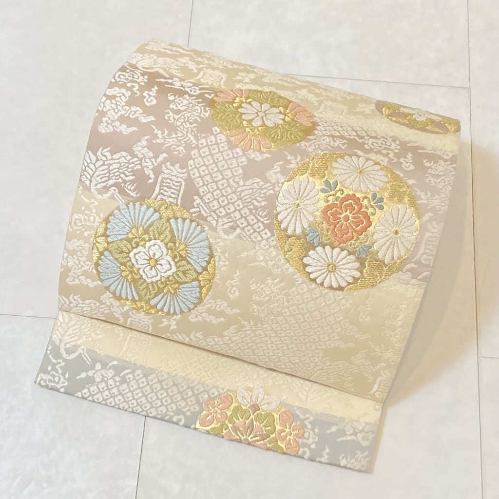 ◇女性らしさを引き立たせるはんなりとした色合いに、気品高いゴールド煌めいた丸紋が華やぎを添えた、とても優美な袋帯です。