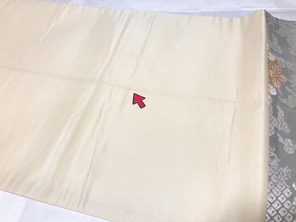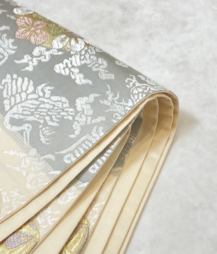 ■淡く優しいクリーム色地に、淡く落ち着いたピンクと水色の縞柄を配し、清楚な白の絹糸で申請な鳳凰や龍をきめ細かくあしらい、花々をあしらった優雅な[丸紋]を間隔良く散りばめた、ふっくらとした刺繍のような格調高い「唐織」を駆使し、緻密に織り上げた大変加工の良いお品です。