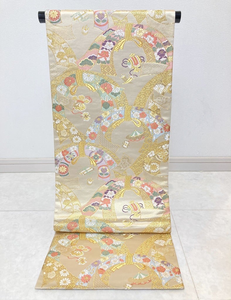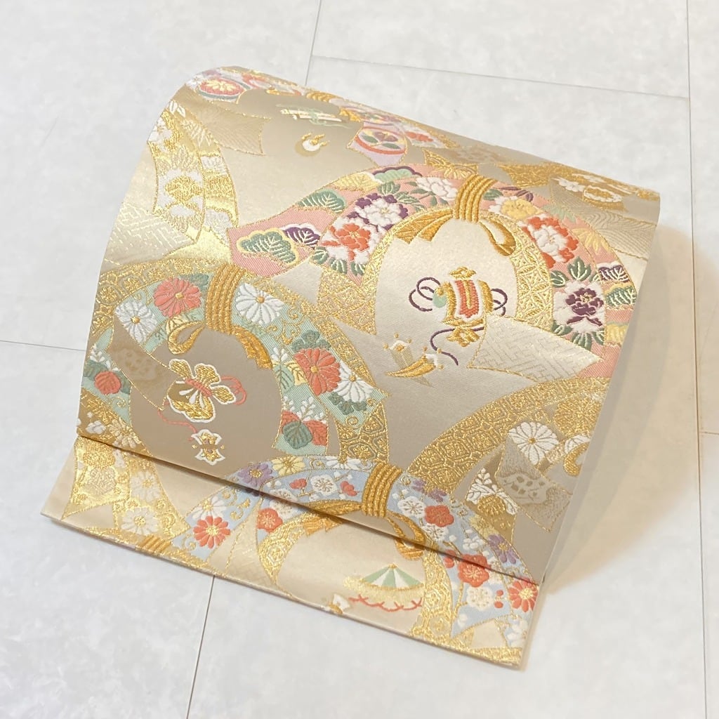 ◇淡く上品なベージュ地にゴールドが煌めき、高貴な貝紫が映える雅やかな熨斗が目を惹く、洗練されたデザインのとても優雅な袋帯です。