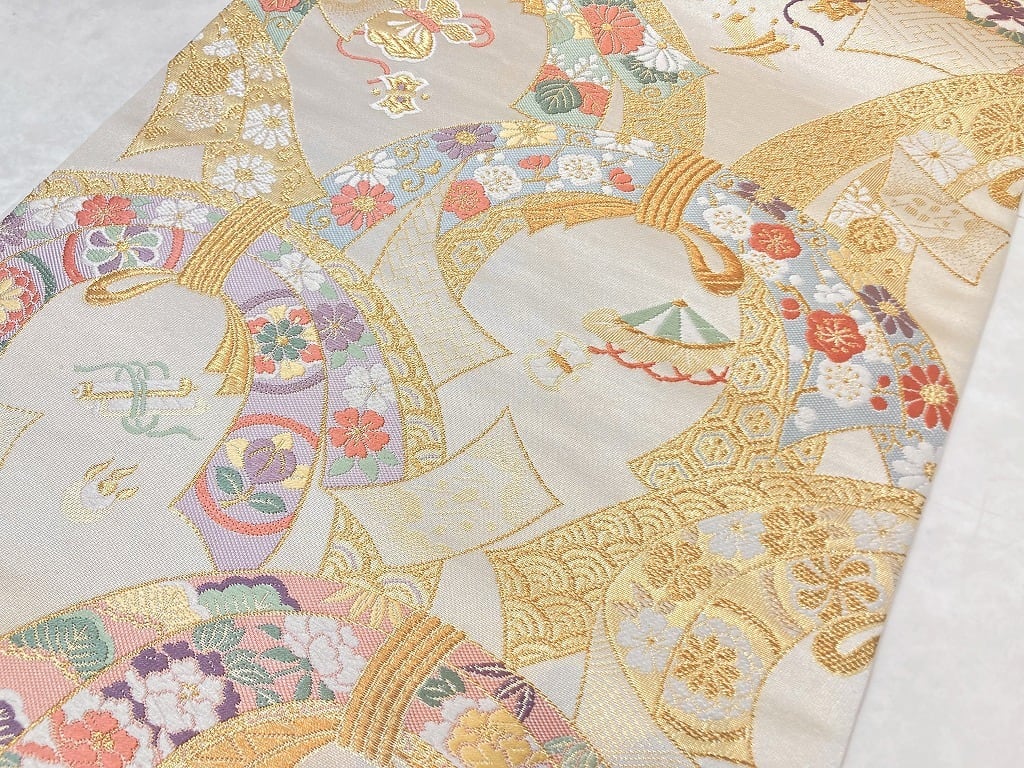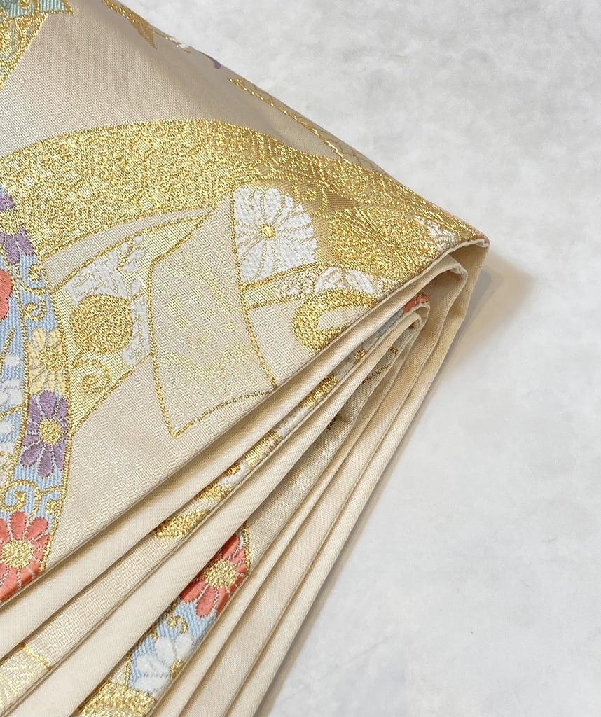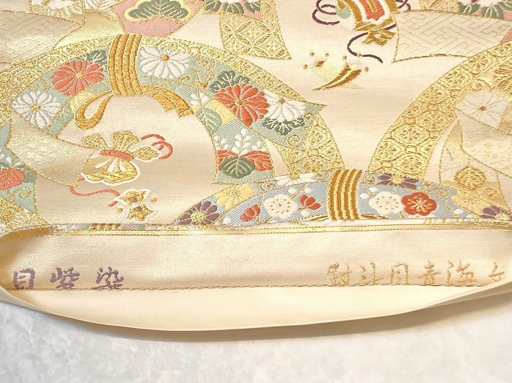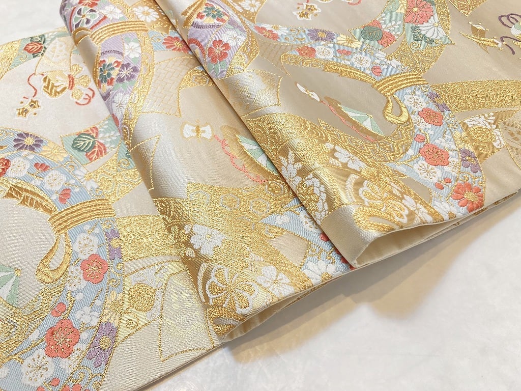 ■気品高く輝く「金糸」や神秘の素材と言われる貴重な「貝紫」をふんだんに使い、ふっくらとした刺繍のような緻密な「唐織」で梅・牡丹・菊などをあしらった華やかな「束熨斗」を青海波のようにモダンに配し、縁起の良い吉祥文の[宝尽くし]を散りばめた、うっとりするほど美しい作品です。