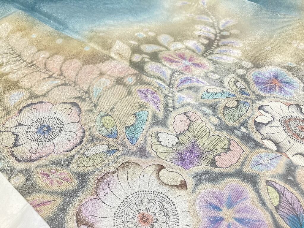 やわらかな「ぼかし染め」でクリーム色から黒のような深い紫へのグラデーションによりメリハリが生まれ、多彩な「友禅」「絞り染め」「ぼかし染め」「墨絵書き」ふんだんな「手絞り」を駆使し、鮮やかに彩られた幻想的な[辻ヶ花]が咲き誇る、言葉にできないほど美しい大変見事な作品です。