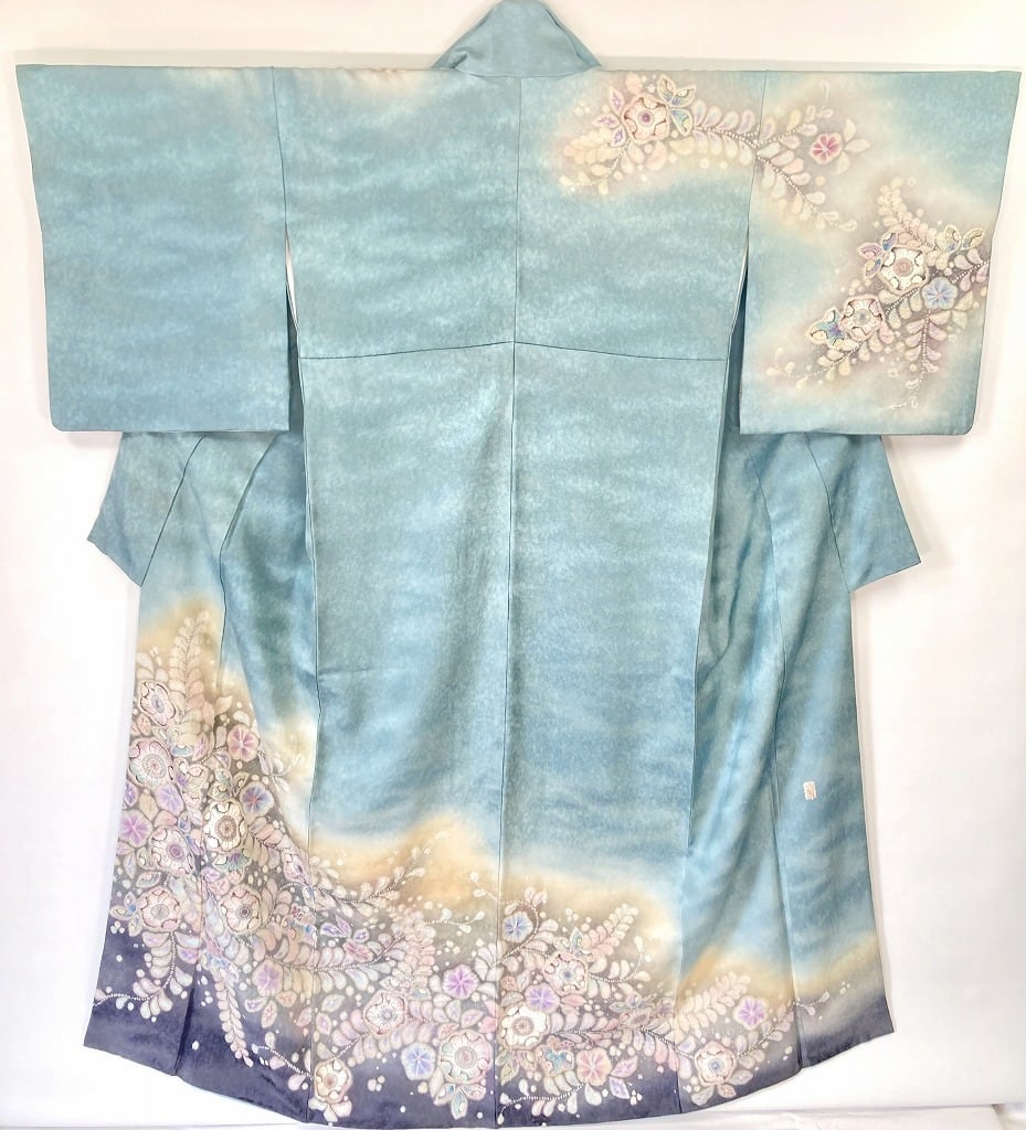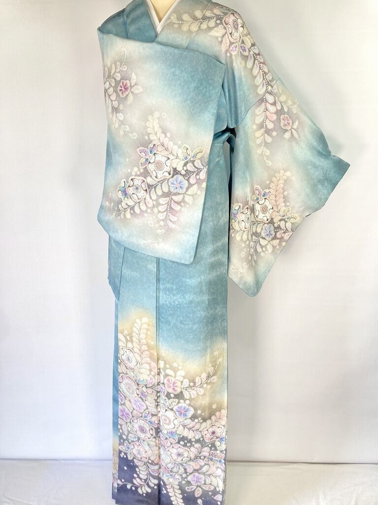 ◇爽やかで美しい地色に、パステルカラーに彩られた[辻ヶ花]が目を惹く華やかな絵羽柄が美しい、ワンランク上の高級訪問着です。