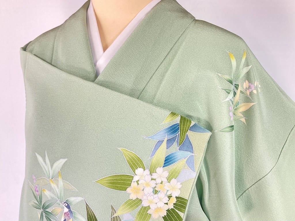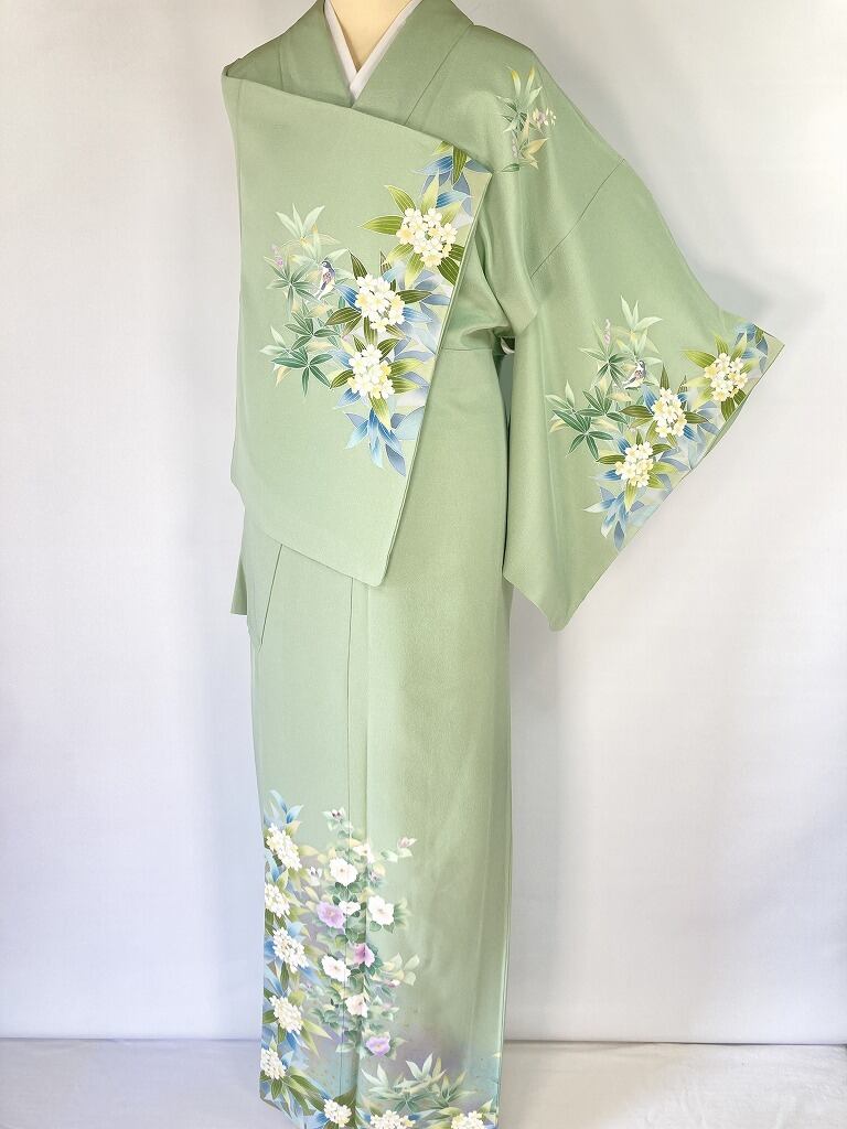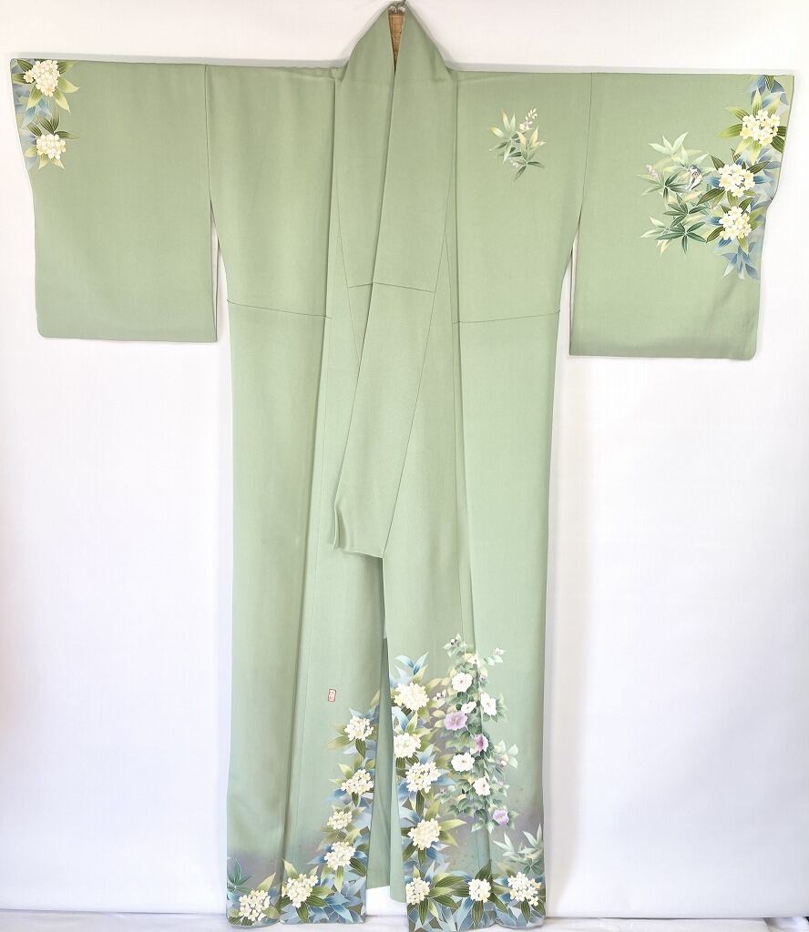 希少品 作家物 手描き友禅 花鳥文 椿 沈丁花 訪問着 正絹 袷 黄緑 青 白 1418