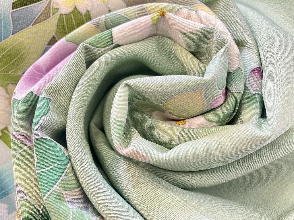 ◎八掛は、表地と同じちりめんの格調高い「共八掛」で、繊細な「手描き友禅」と「金箔」をあしらった、お洒落で高級な仕上げになっております。