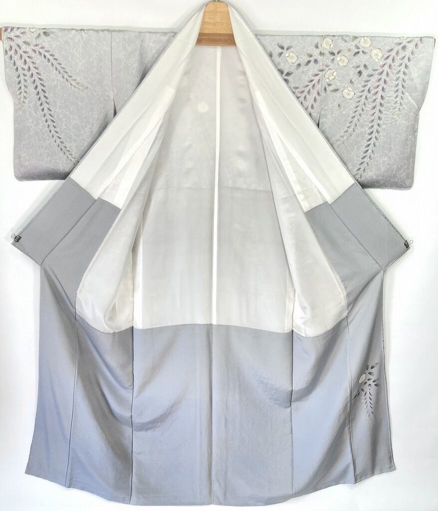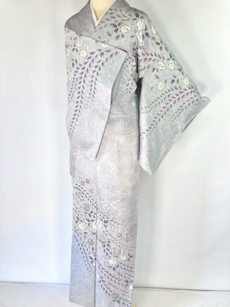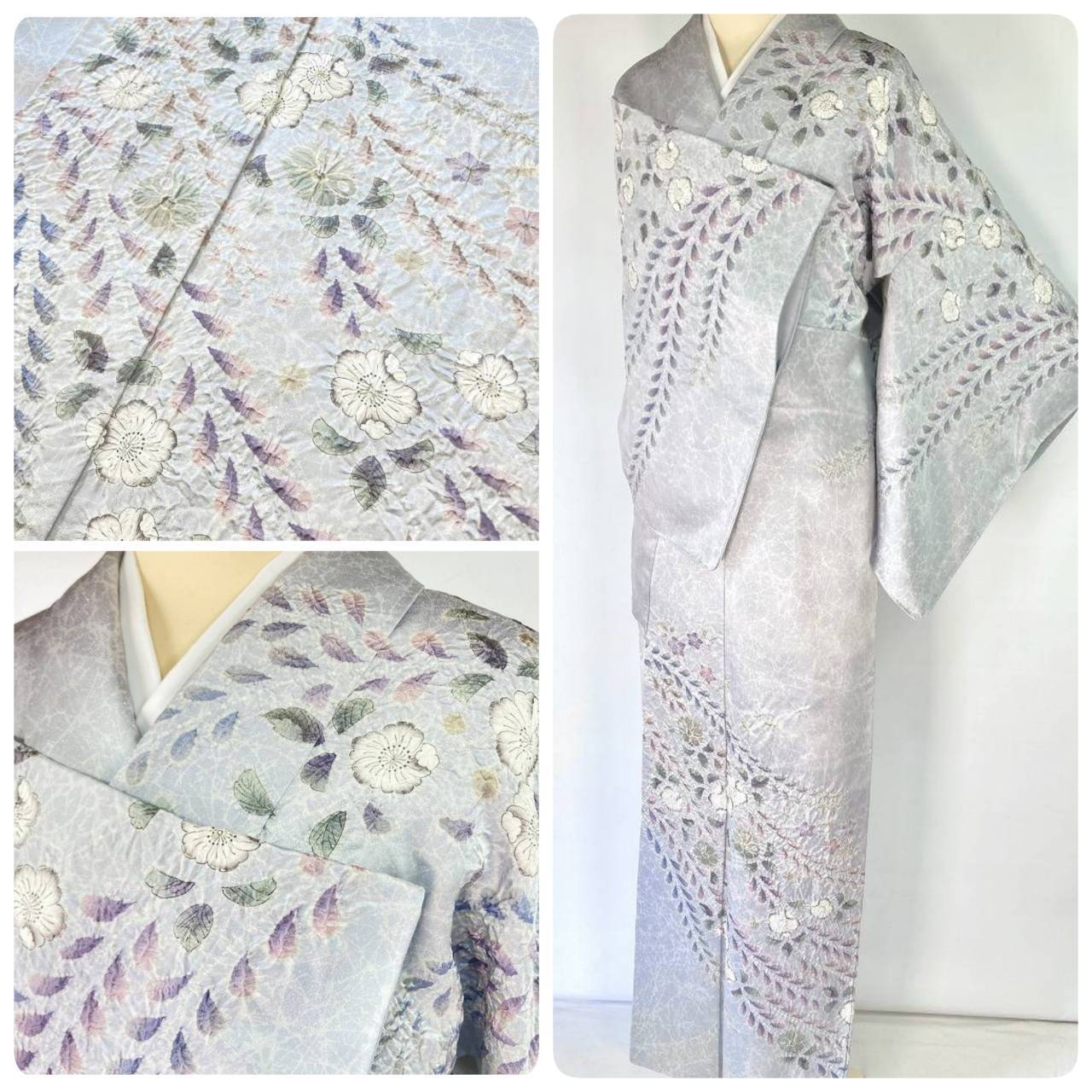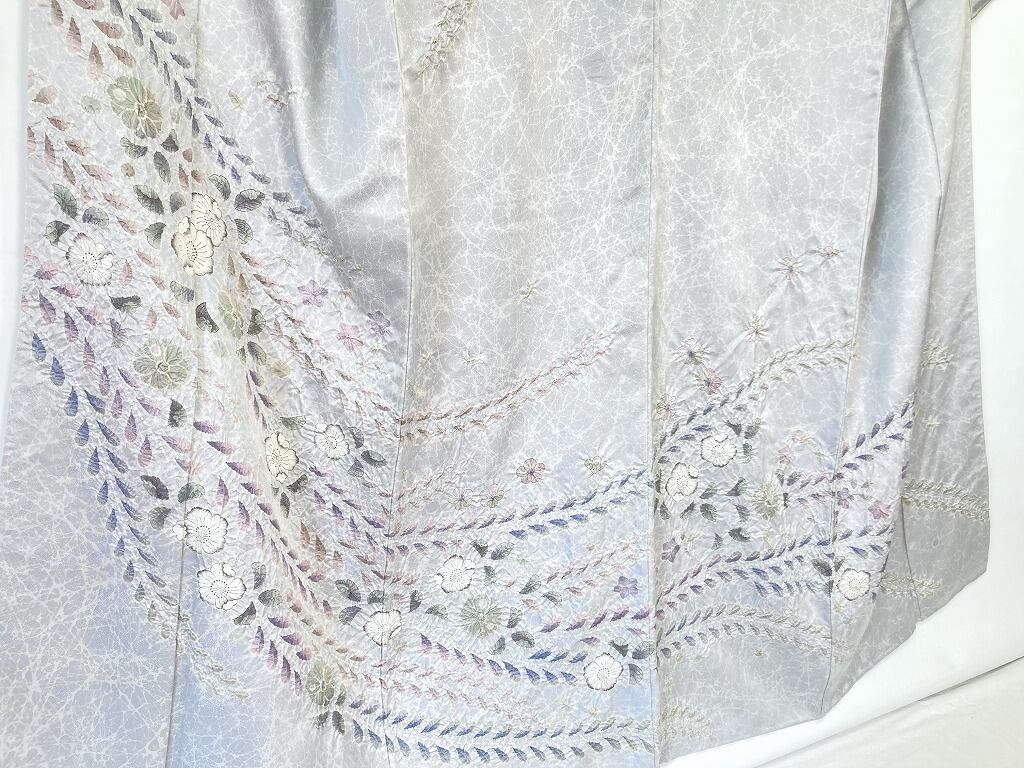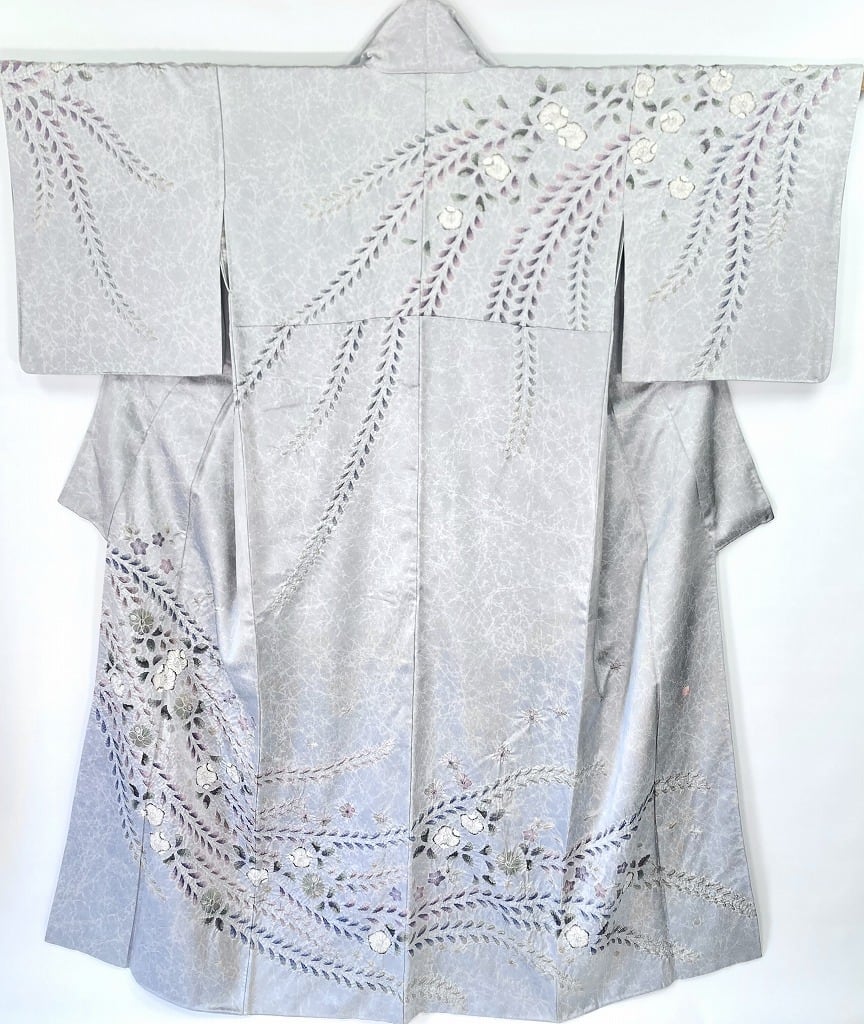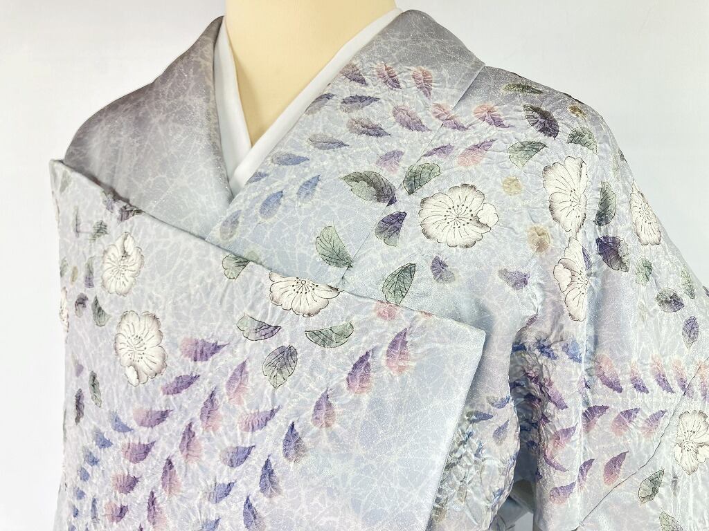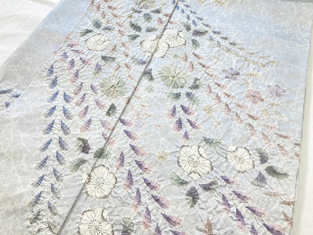 ◇優しいパステルカラーの水色を淡くしたような、とても爽やかな地色に白や紫の色使いが映え、手絞りによる立体的な[辻ヶ花]が目を惹く、とても素敵な高級訪問着です。