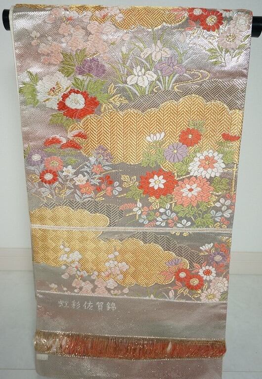 ■見る角度によって色が変わり、まるで虹のように見える美しい虹彩佐賀錦の細かな紗綾形地に、梅・菊・牡丹・菖蒲などの花々が繊細な刺繍や織りで散りばめられ、金糸や銀糸をふんだんに使った華麗な袋帯です。