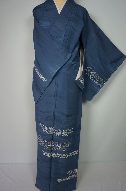 ■グレーみがあり淡く青みの強い青紫のようなお色に、手描きで花や亀甲、青海波などの文様が描かれた風合いのある粋な訪問着です。