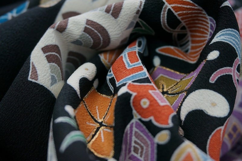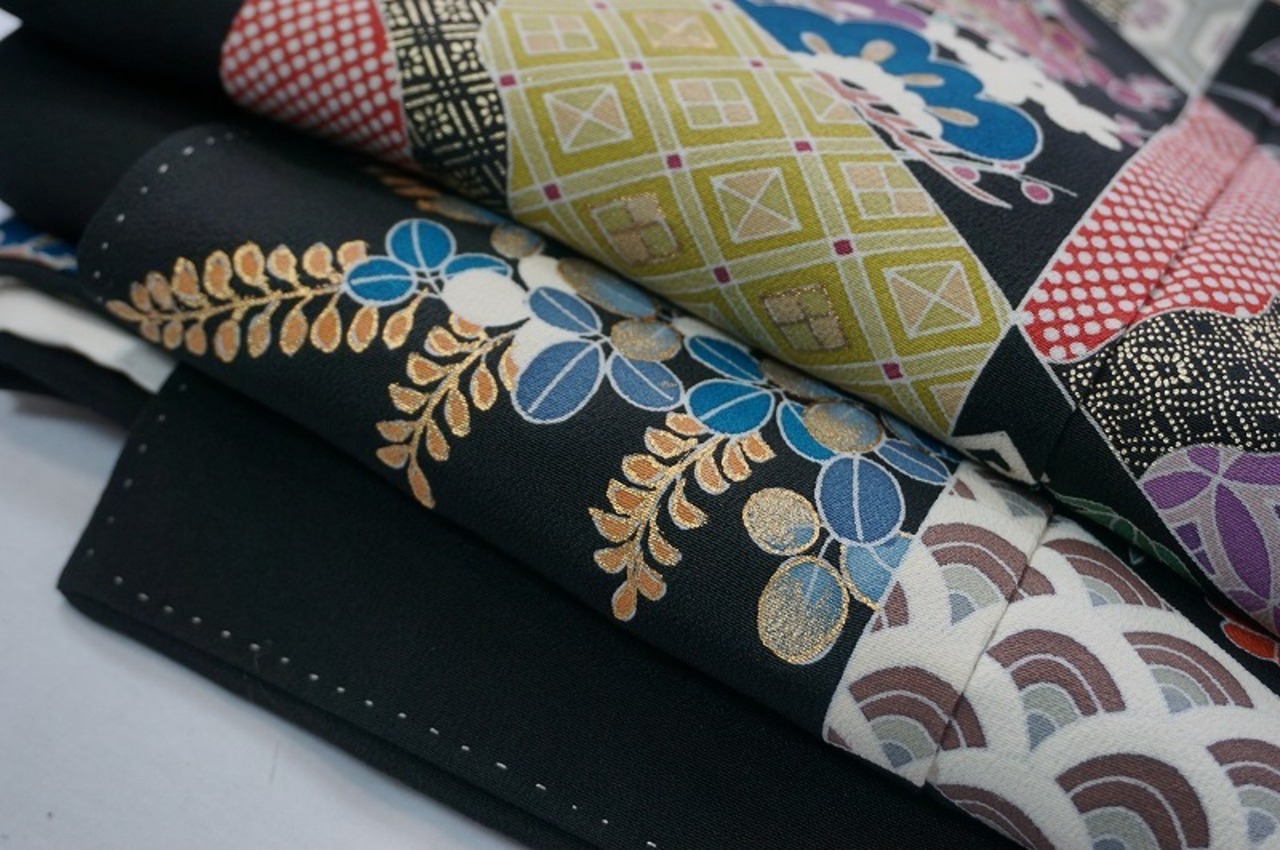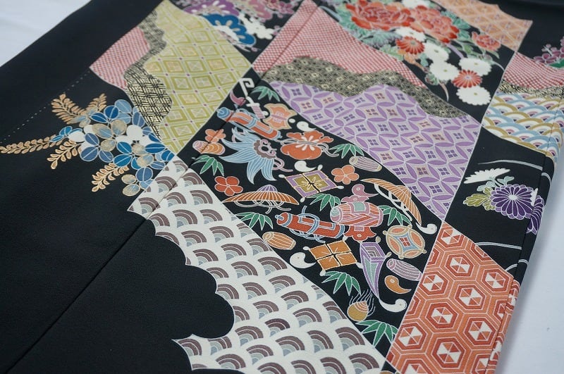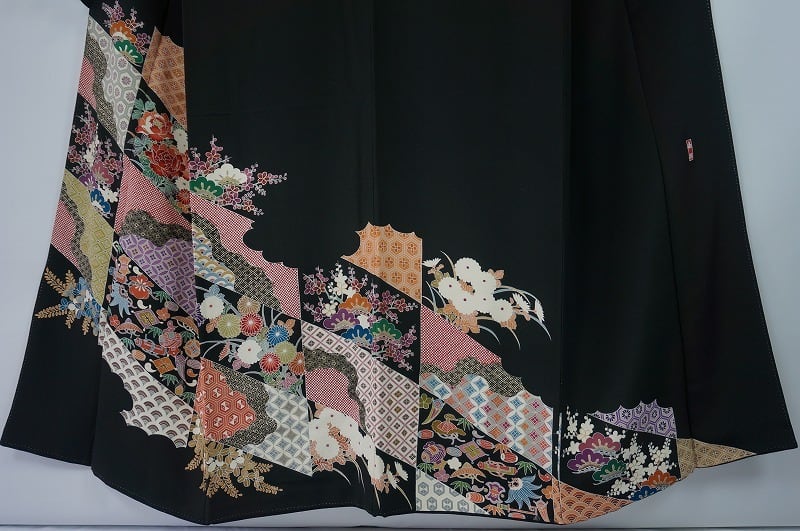 ■柔らかくて肌触りの良く、細かなシボが美しい上質なちりめん地に、亀甲や青海波・七宝文様、菊・牡丹などの花や松竹梅などの縁起の良い吉祥文様が描かれ、繊細な金彩も散りばめられたスタイリッシュでとても素敵な色合や柄行の重厚感がある高級黒留袖です。