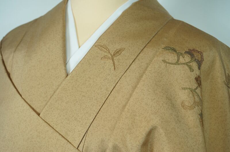 希少 染大島スワトウ刺繍 天目染め 訪問着 正倉院唐花文様 正絹 茅色 066