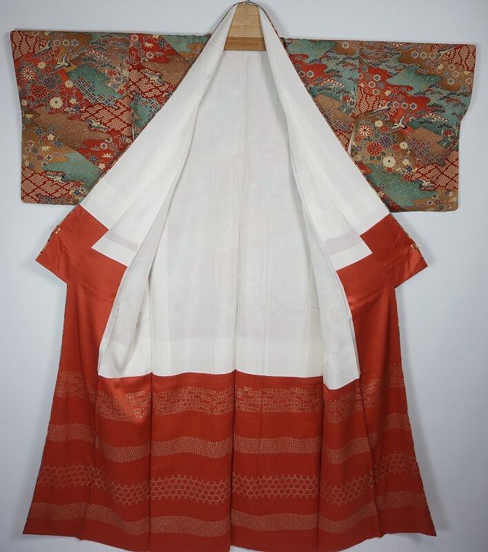 ■立体感のある凹凸が織り出された風合いある膨れ織り地、雲取りの美しい染め分けや絞り柄、鶴や松、菊、梅、亀甲、七宝花菱などの縁起の良い吉祥文づくしに、繊細な金彩が散りばめられとても素敵な柄行です。