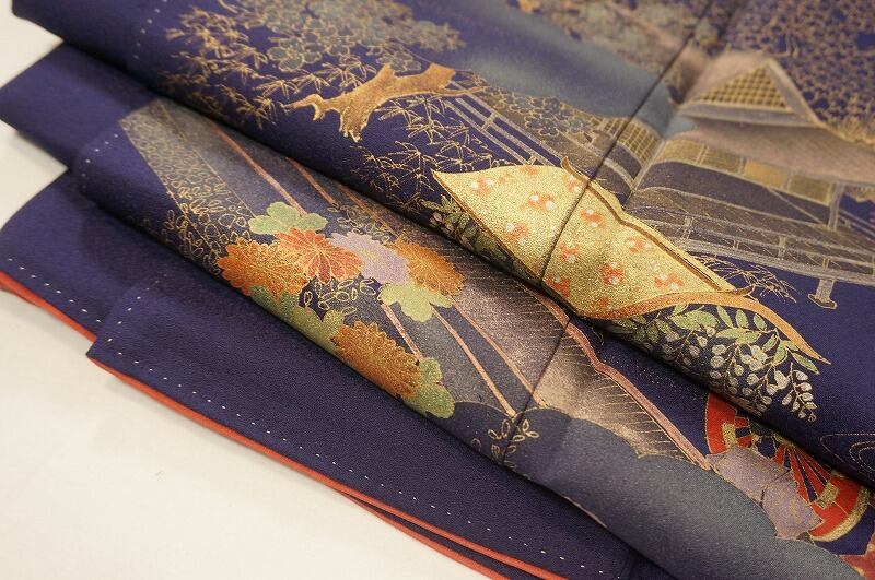 ■黒味がかった深い赤紫の深紫色、柔らかくしなやかできめ細かいシボが美しい上質なちりめん地に、御所車や菊、京風景、雲取りが落ち着いた品のある金銀箔、色箔を使った総手描き金彩がとても繊細で美しい色柄の気品高い高級訪問着です。