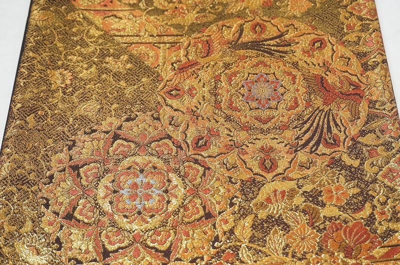 未使用 唐花文様 袋帯 正絹 鳳凰 金糸 黒 茶 080