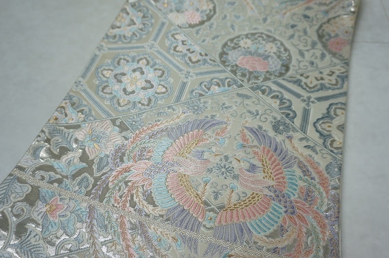 未使用 プラチナ箔 唐花文様 袋帯 正絹 鳳凰 銀糸 パステルカラー 085