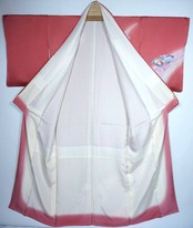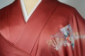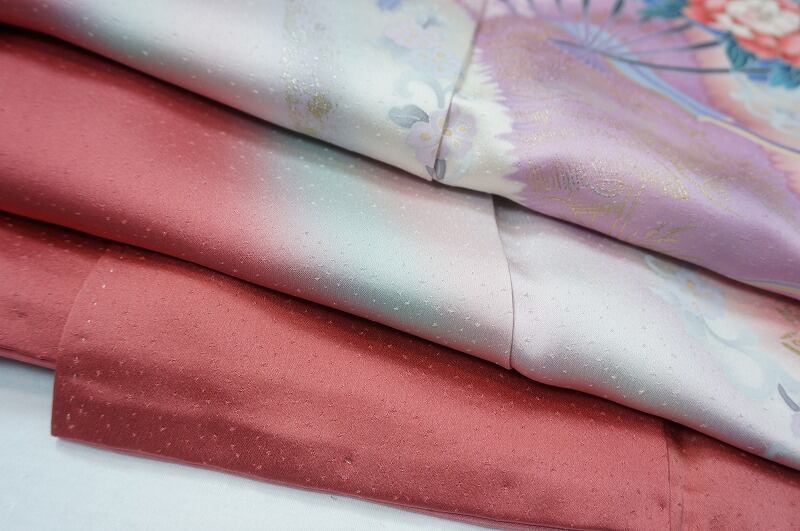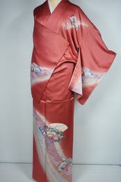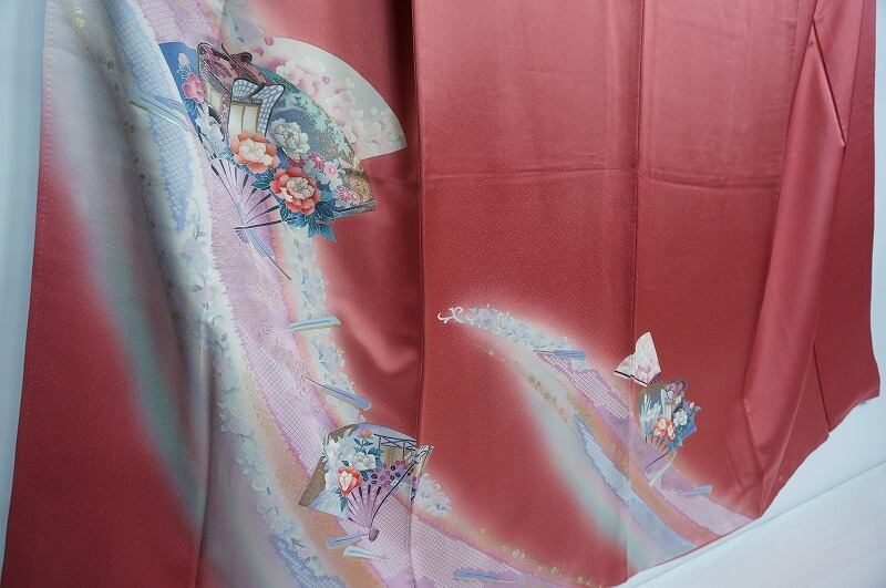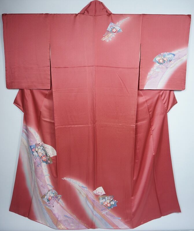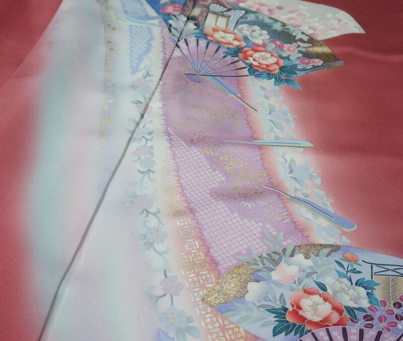 ■茜で淡く染めた黄色みのある鮮やかな浅緋(あさあけ)色、光沢や艶が綺麗で柔らかくしっとりとした重みのある上質な綸子地に、優しいパステルカラーの水色やピンク、紫のやわらかなぼかし染め、ピンクや紫の絞り柄の美しい染め分け、扇に描かれた牡丹や菊、梅などの縁起の良い吉祥文の花々や御所車に、繊細な金銀箔やきめ細かく金彩が施され、意匠を凝らした優美な高級訪問着です。